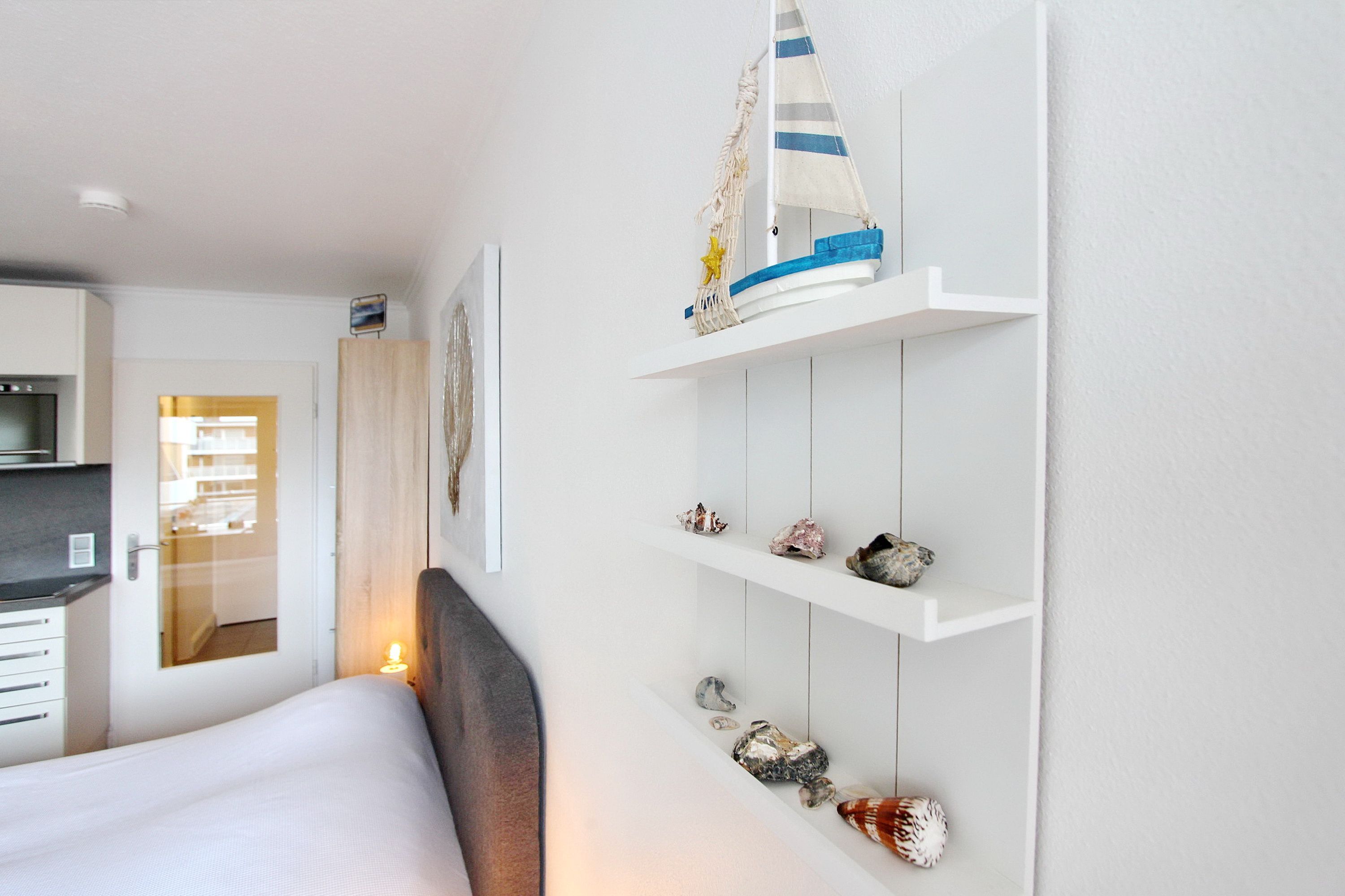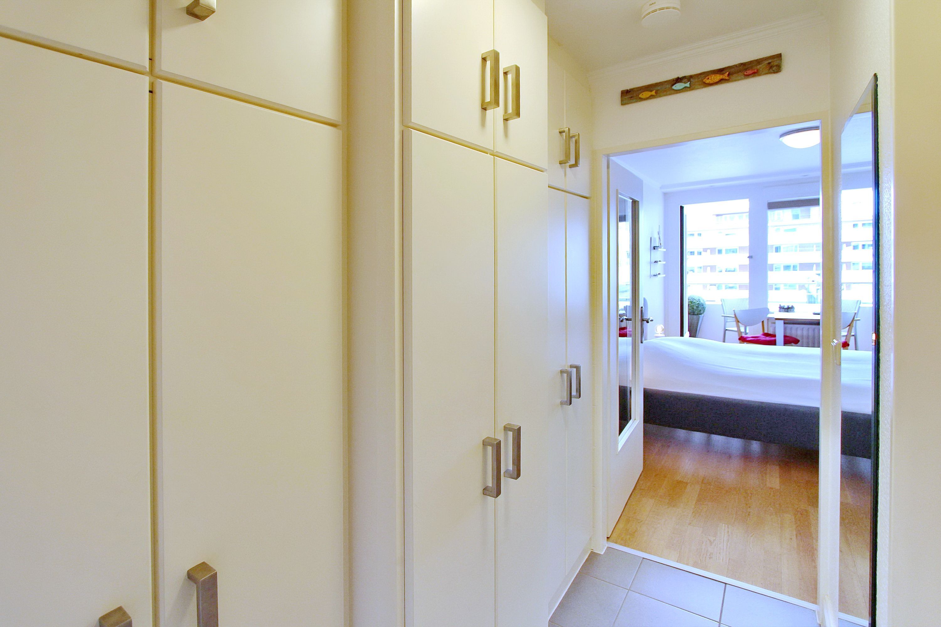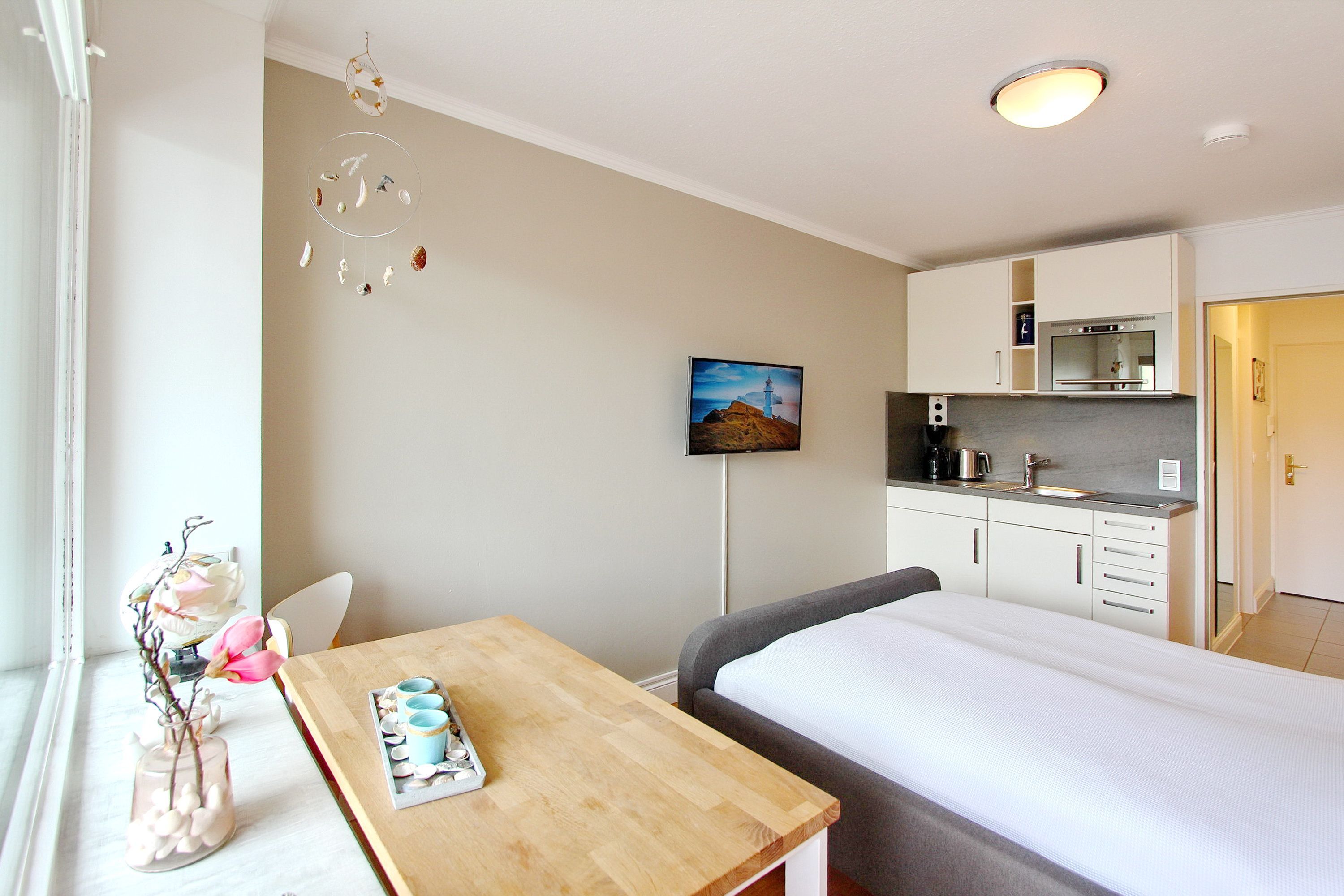 Am Fenster steht ein Essplatz mit 2 bequemen Stühlen, an dem sie alle Mahlzeiten zu sich nehmen können und das Treiben auf der Straße beobachten können. Für einen erholsamen Schlaf gibt es ein modernes Boxspringbett. Ausreichend Stauraum für Ihre persönlichen Dinge ist vorhanden, da es im Flur große Einbauschränke gibt. Das kleine Badezimmer in weiß hat eine Dusche (niedriger Einstieg) mit Glastrennwand und einen beheizten Handtuchhalter. Zur technischen Ausstattung dieser Nichtraucherwohnung gehört: ein 32 Zoll Fernseher und ein kostenfreier WLAN (WEG Haus Metropol - Passwortfrei - ohne Gewähr). Diese Wohnung ist ca. 23m² groß.