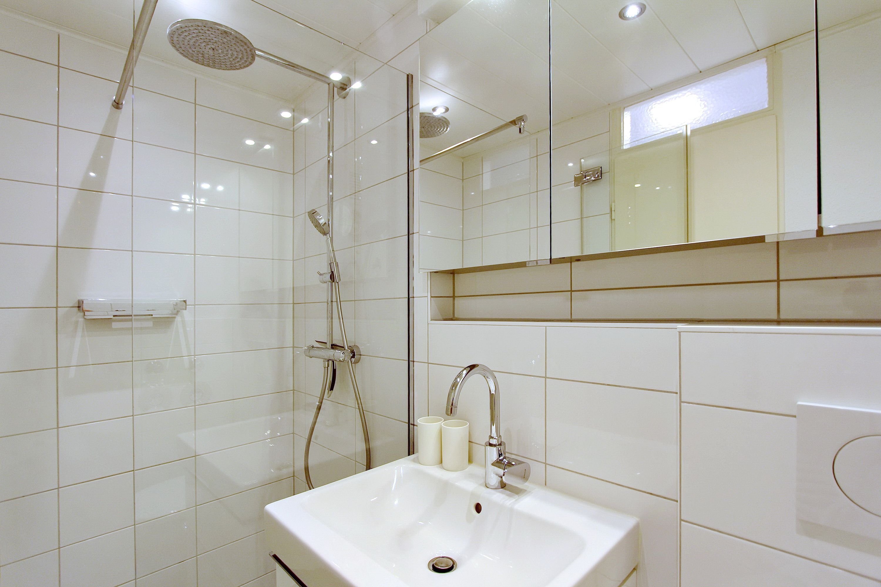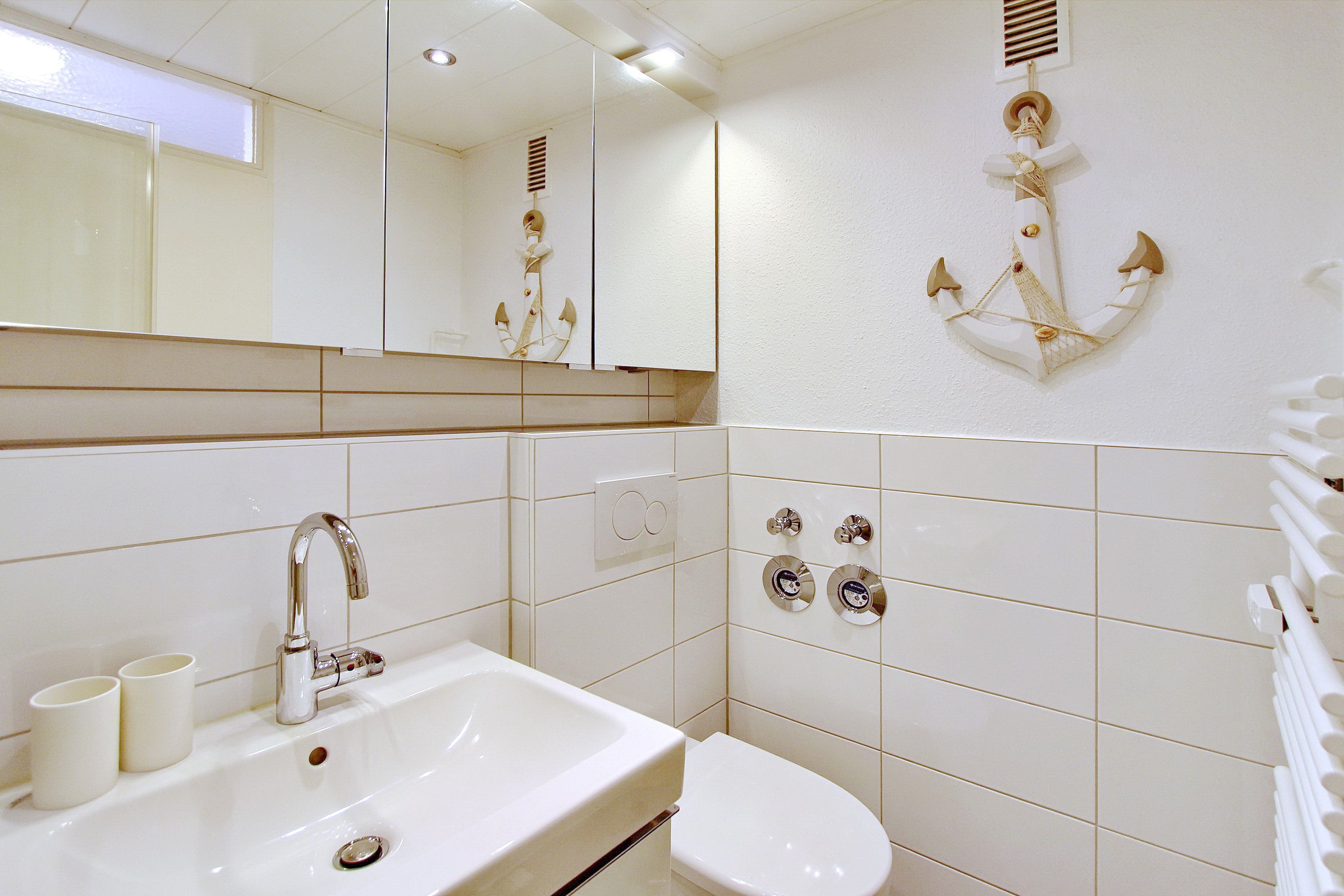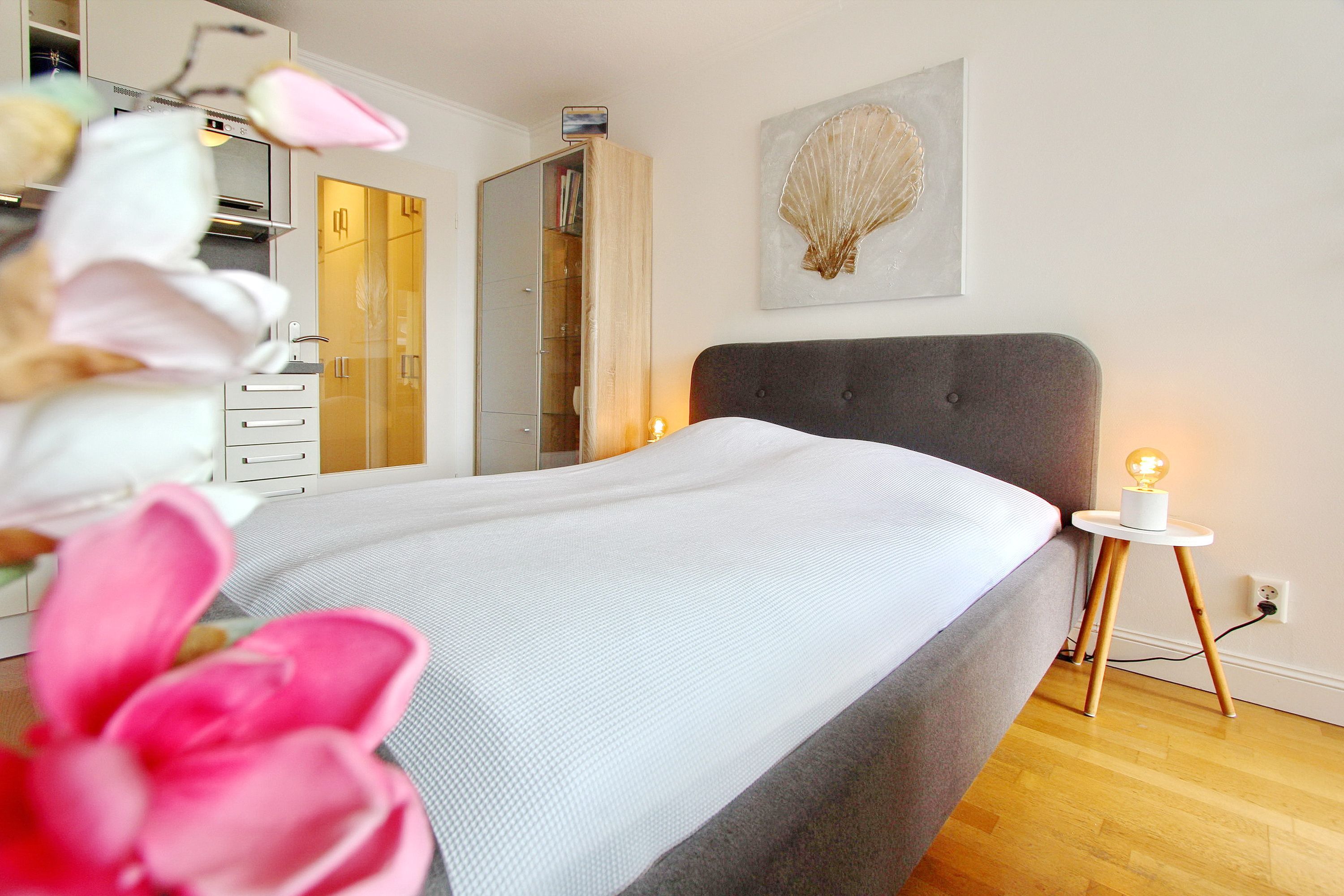 Am Fenster steht ein Essplatz mit 2 bequemen Stühlen, an dem sie alle Mahlzeiten zu sich nehmen können und das Treiben auf der Straße beobachten können. Für einen erholsamen Schlaf gibt es ein modernes Boxspringbett. Ausreichend Stauraum für Ihre persönlichen Dinge ist vorhanden, da es im Flur große Einbauschränke gibt. Das kleine Badezimmer in weiß hat eine Dusche (niedriger Einstieg) mit Glastrennwand und einen beheizten Handtuchhalter. Zur technischen Ausstattung dieser Nichtraucherwohnung gehört: ein 32 Zoll Fernseher und ein kostenfreier WLAN (WEG Haus Metropol - Passwortfrei - ohne Gewähr). Diese Wohnung ist ca. 23m² groß.