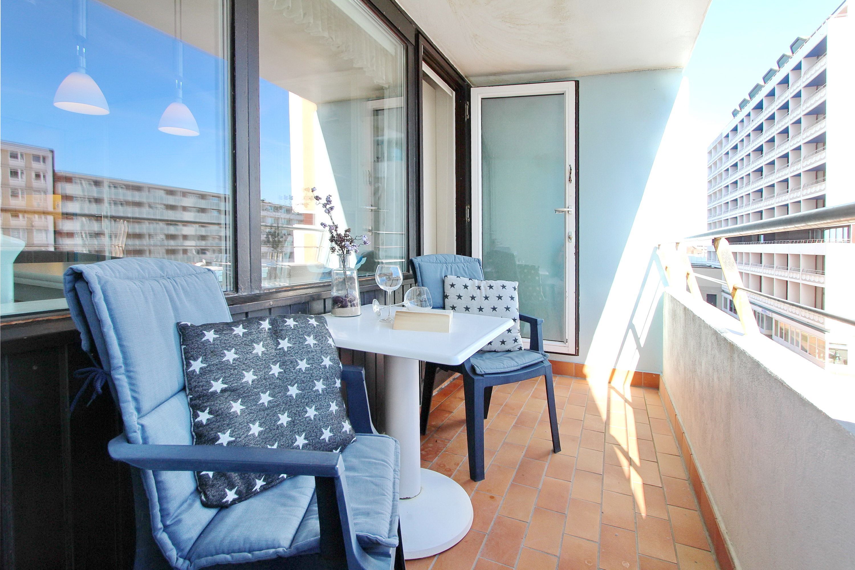 Diese hell und freundlich eingerichtete Nichtraucherwohnung befindet sich in der 1. Etage des Haus Metropol. Der kombinierte Wohn-/Schlafraum hat einen Ostbalkon mit Balkonmöbeln und Sitzauflagen. Sie können hier schon in den Morgenstunden die Sonne genießen. Das Appartement ist mit Einzelschrankbetten, einem Essplatz mit 2 Stühlen und einer Couch ausgestattet. Der Laminatfußboden verleiht dem Raum Wärme und Gemütlichkeit und macht die Wohnung auch für Allergiker geeignet. Das helle Badezimmer hat eine Dusche mit flachem Einstieg. In der Einbauküche mit Geschirrspüler und Mikrowelle können sie bequem kleine Mahlzeiten zubereiten. Zur technischen Ausstattung der Wohnung gehört: ein Flachbildfernseher von Sony, ein Radio mit CD Player sowie ein freier Zugang zum WLAN Netzwerk des Hauses (WEG Haus Metropol - Passwortfrei - ohne Gewähr). Wohnungsgröße: ca.30 m².