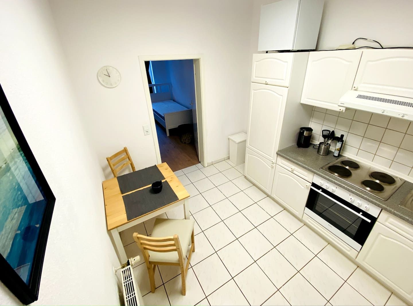 Auf knapp 40qm bietet es ein helles Wohn- und Schlafzimmer (Bett, Sofa, Kommode, TV) nach Westen mit zwei großen Altbaufenstern, ein Arbeitszimmer mit Schreibtisch & Bücherregal nach Osten mit Blick in einen grünen Innenhof, ein modernes Bad (Dusche, WC, Waschbecken, Waschmaschine und Wäscheständer) und eine voll ausgestattete Küche mit Spüle, Kühlschrank, Ofen, Ceranfeld-Herd und Essecke inkl. Töpfe, Teller, Geschirr, Besteck, Wasserkocher, Toaster, Espressomaschine, etc..