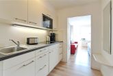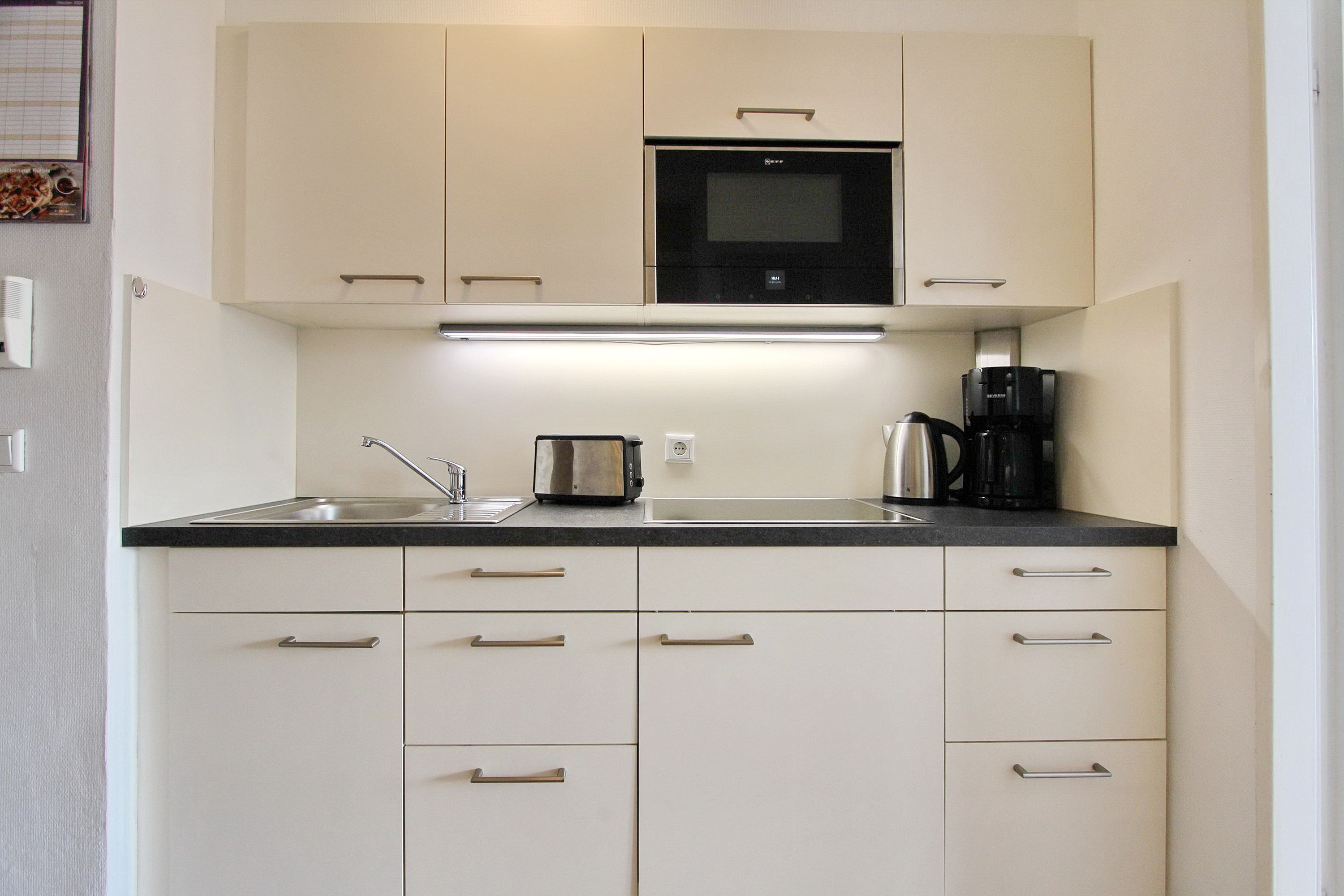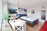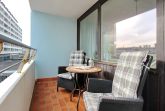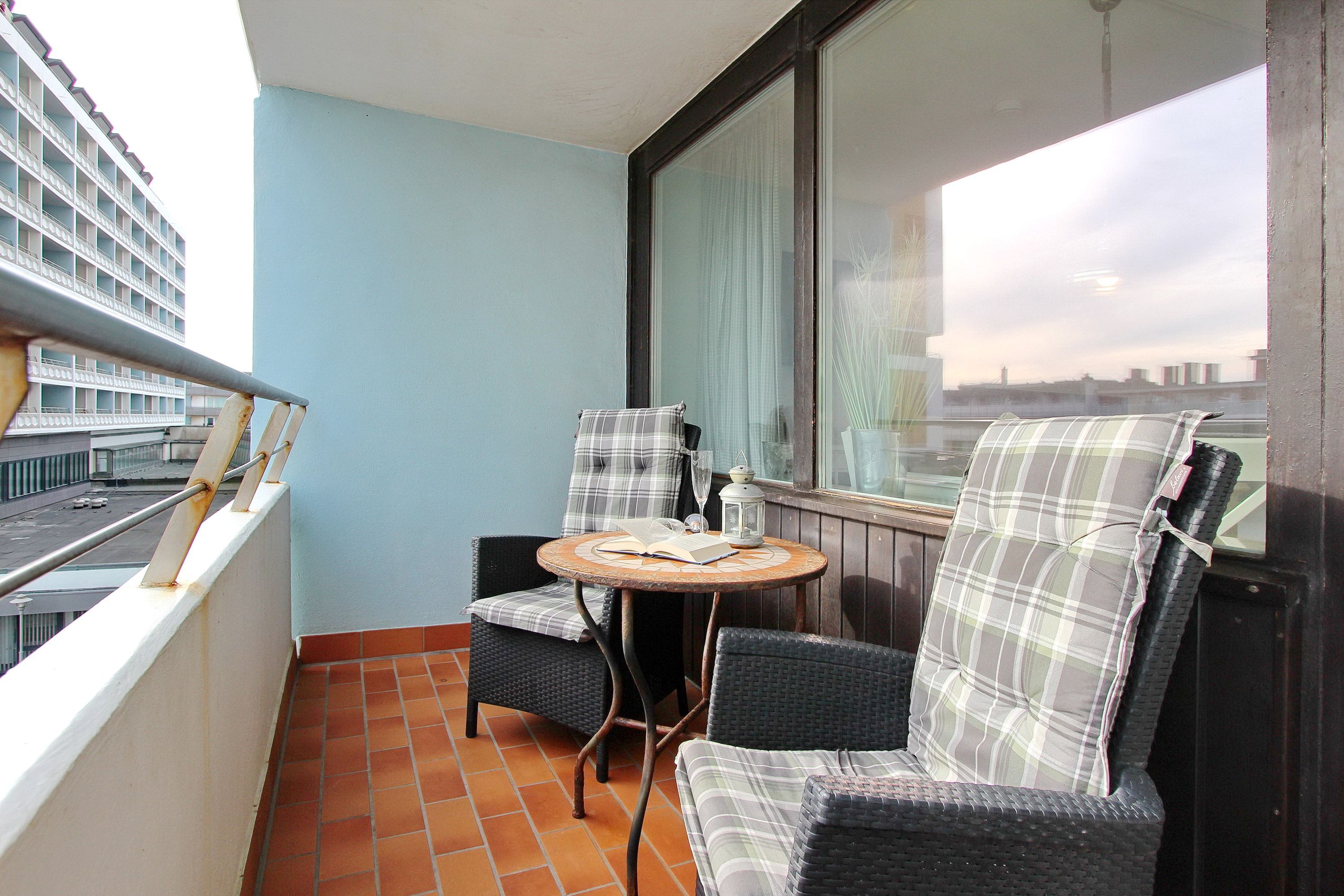Hell und freundlich eingerichtete Nichtraucherwohnung in der 1. Etage im Haus Metropol. Der kombinierte Wohn-/Schlafraum mit vorgelagertem Ostbalkon verfügt über ein feststehendes Doppelbett, einen Essplatz am Fenster mit 2 Stühlen, eine bequeme Ledercouch sowie einen Sessel und einen kleinen Couchtisch. Laminatfußboden macht diese Wohnung besonders für Hausstauballergiker geeignet. Das moderne Badezimmer mit Eckdusche ist hell gefliest und hat einen Kosmetikspiegel und Fön. In der Einbauküche im Flur mit Ceranfeld und Mikrowellen Backkombination können kleinere Mahlzeiten bequem zubereitet werden. Zur technischen Ausstattung dieser Wohnung gehört: ein Flachbildfernseher, ein DVD Player, ein Telefon mit Flatrate ins dt. Festnetz sowie ein Radio mit CD Spieler. Ein freies WLAN Netzwerk (WEG Haus Metropol - Passwortfrei - ohne Gewähr) steht ihnen kostenfrei zur Verfügung. Wohnungsgröße: ca. 30 m².