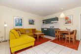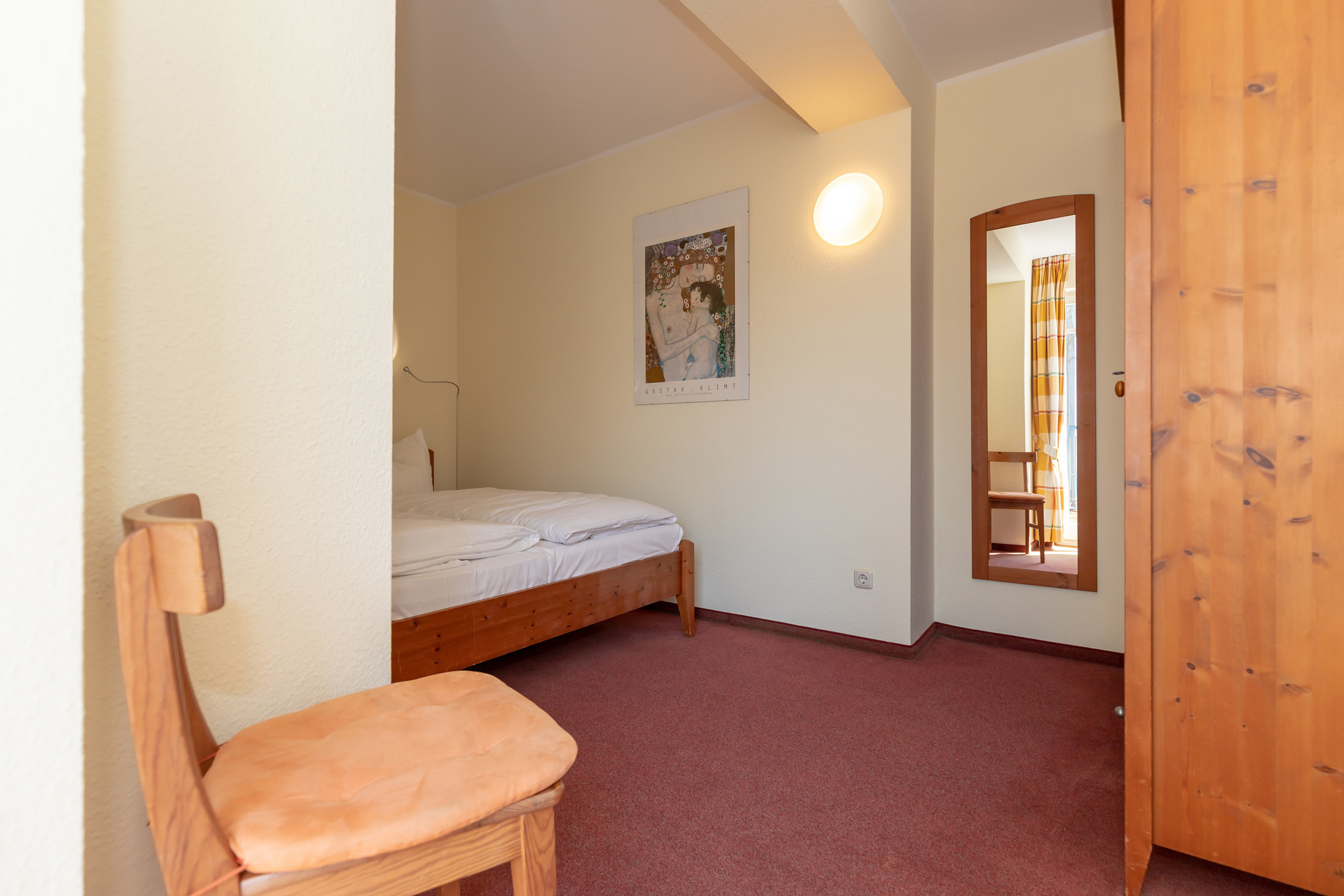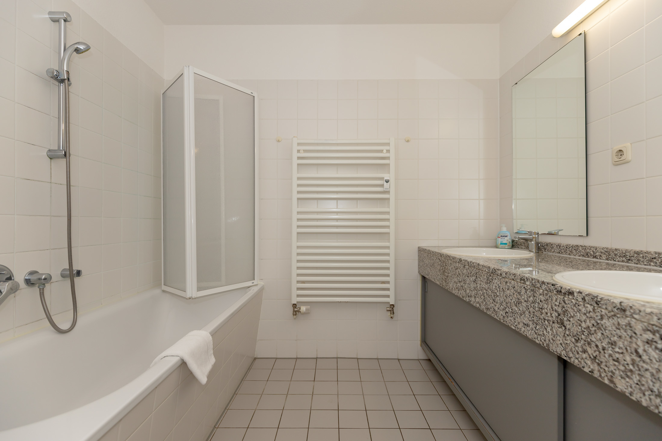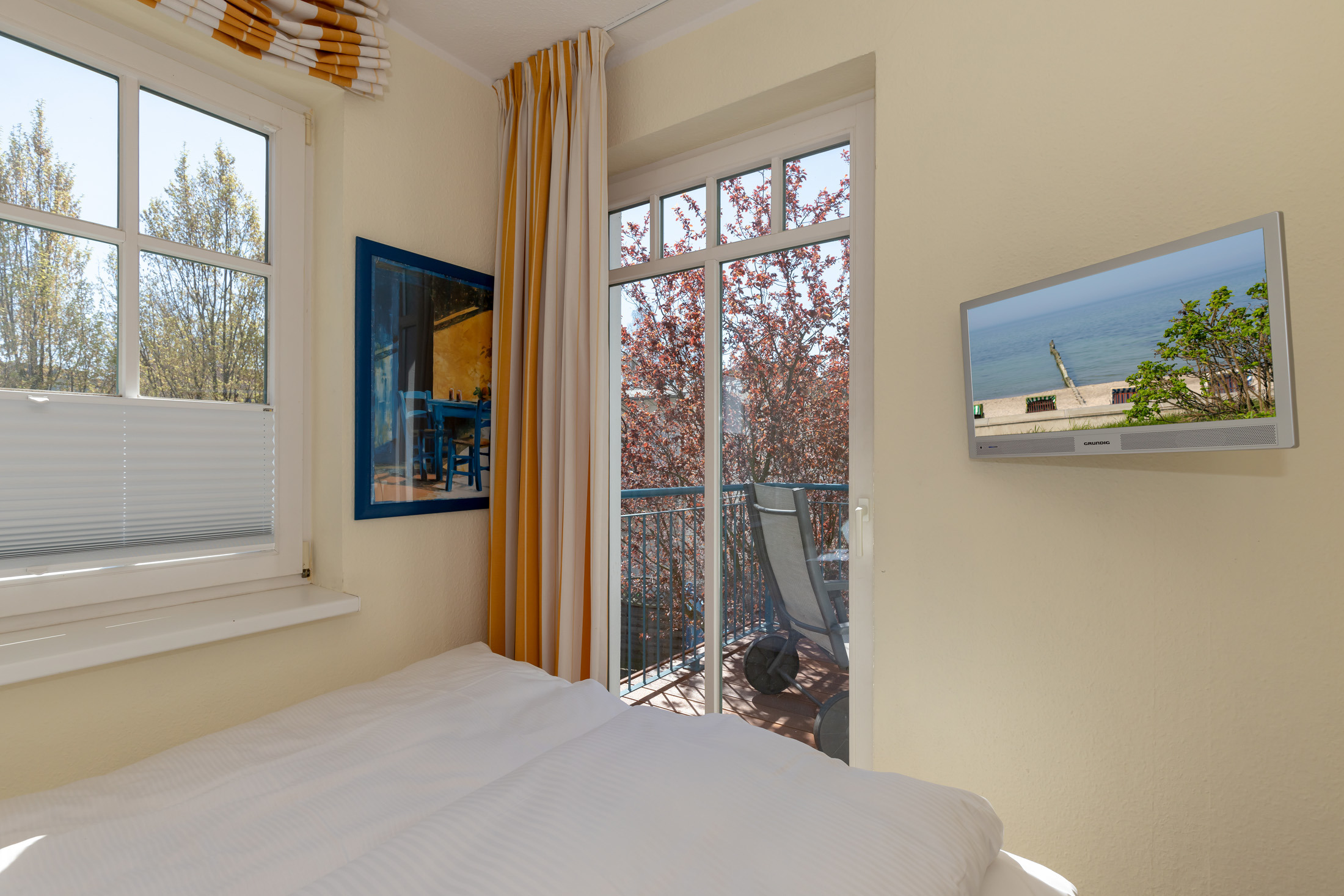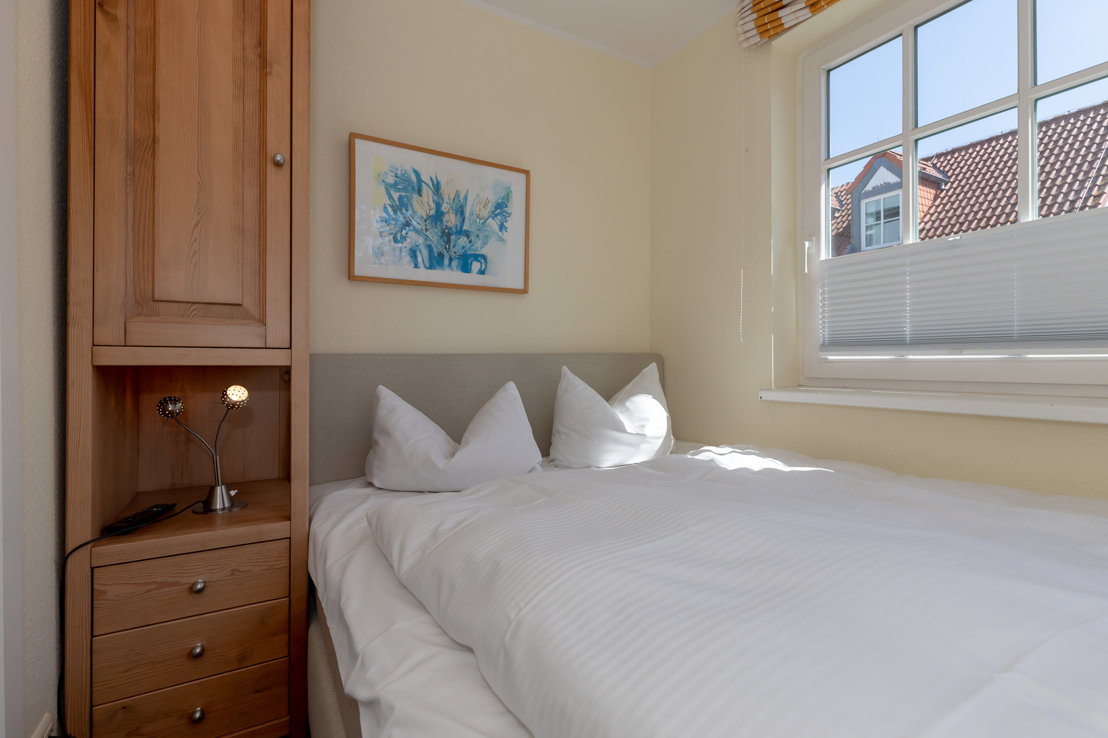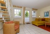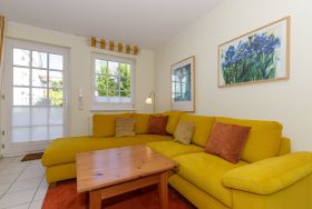 Die 3-Zimmer-Maisonette-Wohnung ist ruhig im Innenhof unserer Anlage gelegen und geeignet für 4 - 5 Personen. Im Erdgeschoss befindet sich das Wohnzimmer mit Wohnlandschaft (kann als Schlafmöglichkeit für eine weitere Person genutzt werden - jedoch nicht ausziehbar) und Küchenzeile sowie das Wannenbad. Über eine Treppe gelangt man in das Obergeschoss mit 2 getrennten Schlafzimmern, die jeweils mit einem Ehebett ausgestattet sind. Auch den Balkon in südlicher Richtung finden Sie hier. Die Wohnung ist im Erdgeschoss gefliest und im Obergeschoss mit Teppichboden ausgelegt.