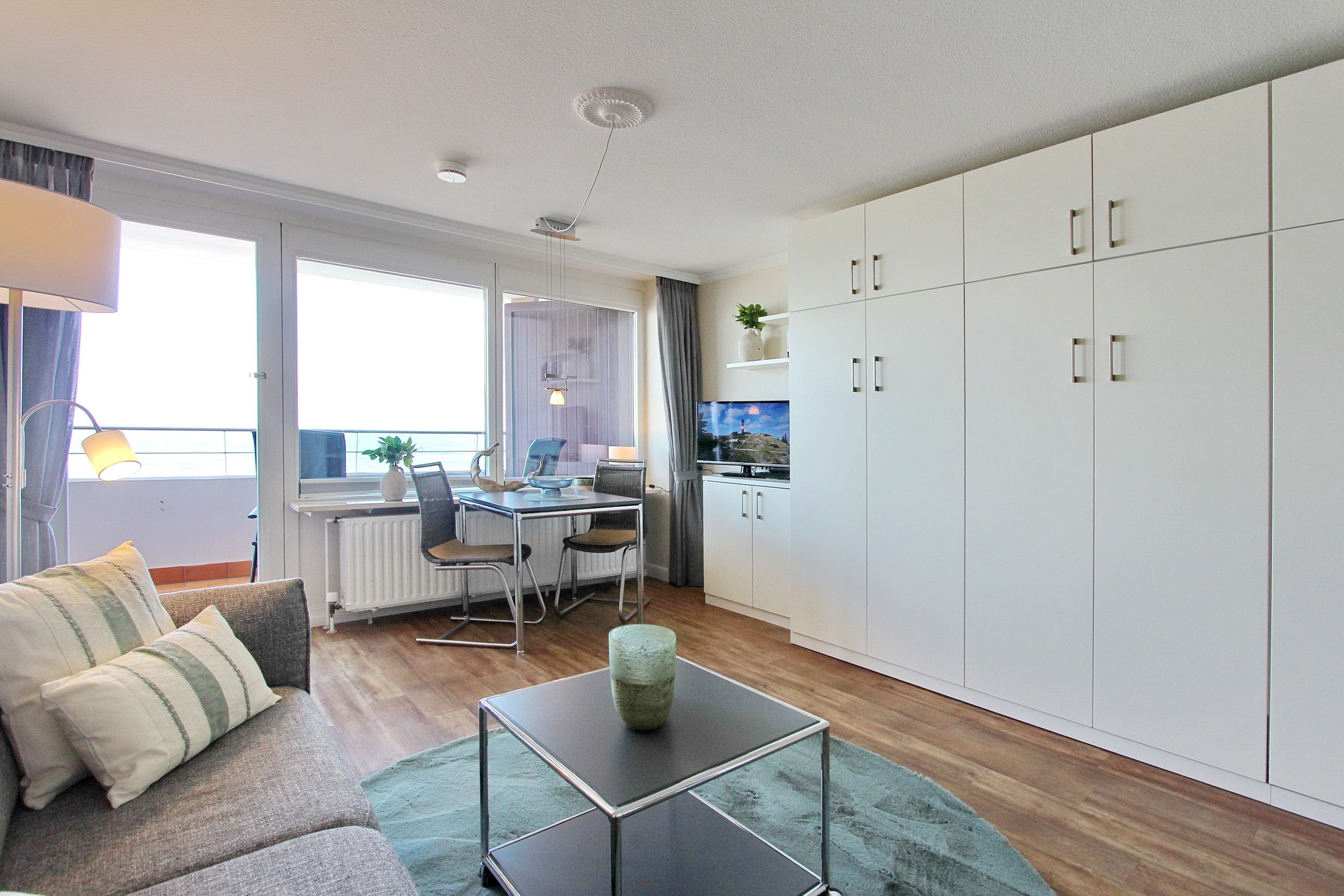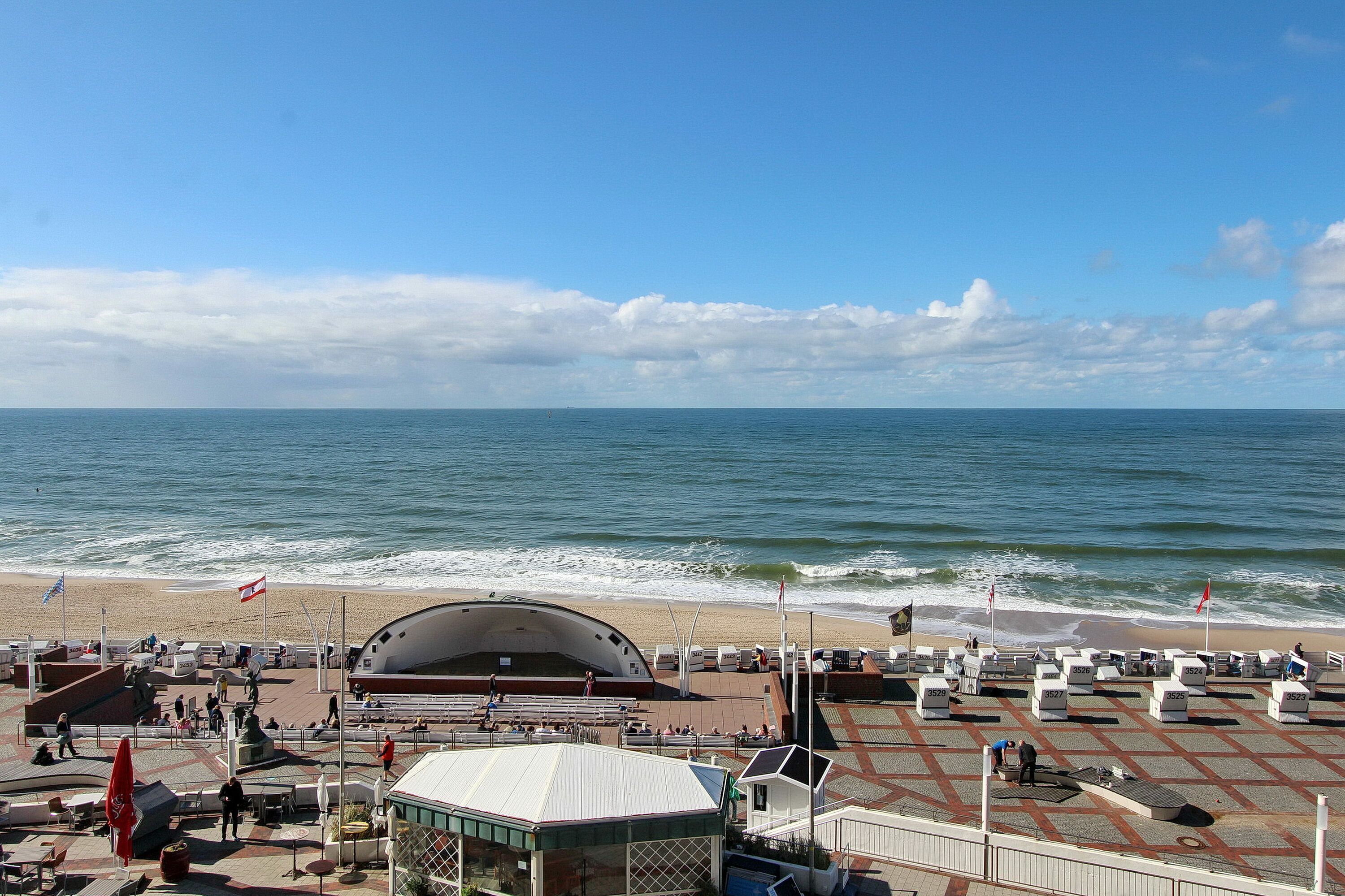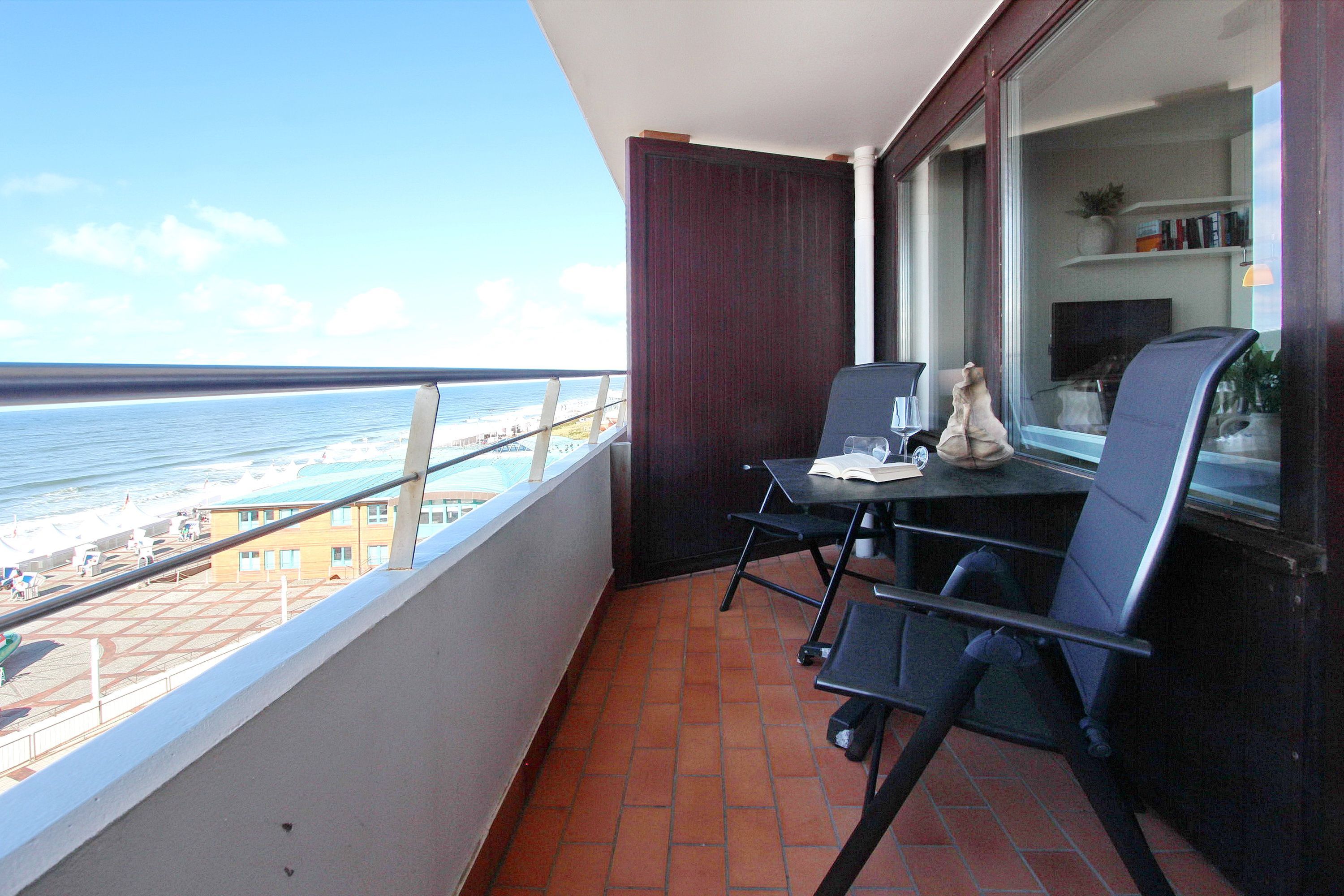 In der 3. Etage des Haus Metropol finden sie diese Einzimmerwohnung mit einmalig schönem Blick auf den Strand und die Nordsee. Der kombinierte Wohn-/Schlafraum hat einen vorgelagerten Westbalkon mit Balkonmöbeln und Auflagen. Einzelschrankbetten, ein Essplatz am Fenster mit 2 Stühlen sowie eine Couch und ein Fernsehsessel stehen ihnen zur Verfügung. In der Wohnung wurde hochwertiger Laminatfußboden verlegt. Im Badezimmer gibt es eine Dusche, Fön, Kosmetikspiegel und einen Handtuchtrockner. In der Einbauküche im Flur mit Ceranfeld, Mikrowellen-Backkombination, zusätzlicher Nespressomaschine und Spülmaschine können sie sich selbst verpflegen. Hochwertiges Geschirr und Töpfe stehen Ihnen dafür zur Verfügung. Zur technischen Ausstattung gehört ein Flachbildfernseher von Panasonic und eine Bluetoothanlage mit CD Player von Sony. Ein freies WLAN Netzwerk (WEG Haus Metropol - Passwortfrei - ohne Gewähr) steht ihnen kostenfrei zur Verfügung. Die Größe dieser Nichtraucherwohnung beträgt: ca. 34 m².