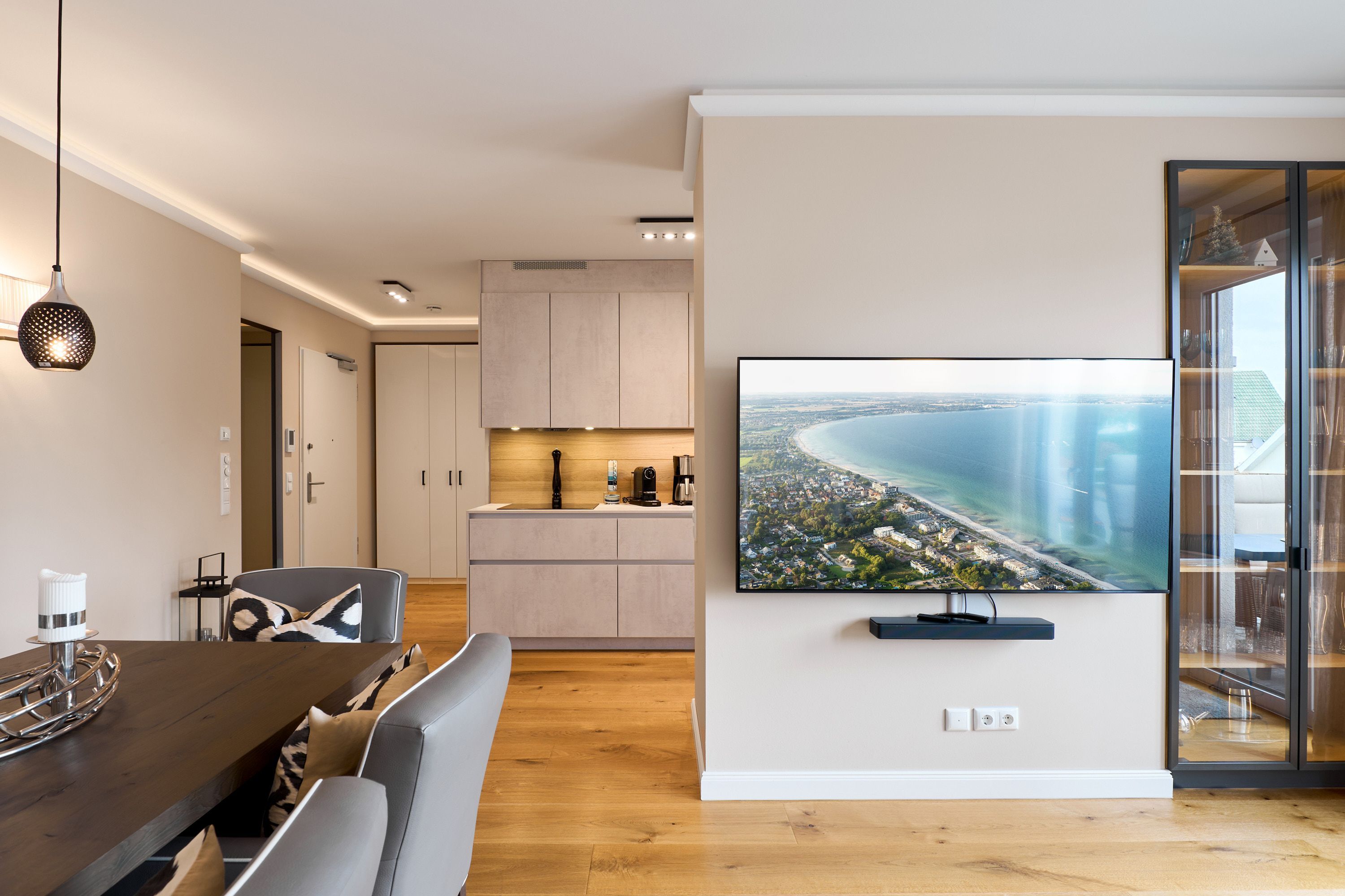 Sehr geschmackvoller Wohn-Essbereich. Die separate, abgegrenzte Einbauküche ist komplett ausgestattet. Backofen, Ceran-Kochfeld, Mikrowelle, Geschirrspüler, Kühlschrank mit Gefrierschrank, Filterkaffeemaschine, Kapselmaschine, Eierkocher, Mixer, Toaster und Wasserkocher, Teekanne und noch vieles mehr. Der Wohnbereich ist mit einem hochwertigen Sofa, einem Wohnzimmertisch, einem TV (65 Zoll), einer Bose-Anlage sowie einem sehr ansprechenden Essbereich ausgestattet. Aus dem Wohnbereich gelangen Sie auf den Westbalkon. Hier stehen Ihnen Tisch und Stühle zur Verfügung. Das 1. Schlafzimmer ist mit einem Boxspringbett (1,80m x 2,00m), einem großen Kleiderschrank, 2 Nachttischen sowie einem Wand-TV (55Zoll) ausgestattet. Das 2. Schlafzimmer ist ebenso mit einem Boxspringbett (1,80m x 2,00m), 2 Nachttischen, einem Kleiderschrank sowie einem Wand-TV (55 Zoll) ausgestattet. Alle Fenster haben elektrische Außenrollläden. Das Duschbad, in heller Optik, mit bodengleicher Dusche / Regendusche, mit separater Handbrause, Handtuchheizkörper, Fön, Kosmetikspiegel. Die gesamte Wohnung verfügt über eine Fußbodenheizung.