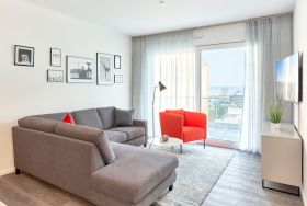 Sehr ansprechende, feine Wohnung. Aus dem Wohnzimmer sowie vom Balkon haben Sie einen Teilmeerblick.