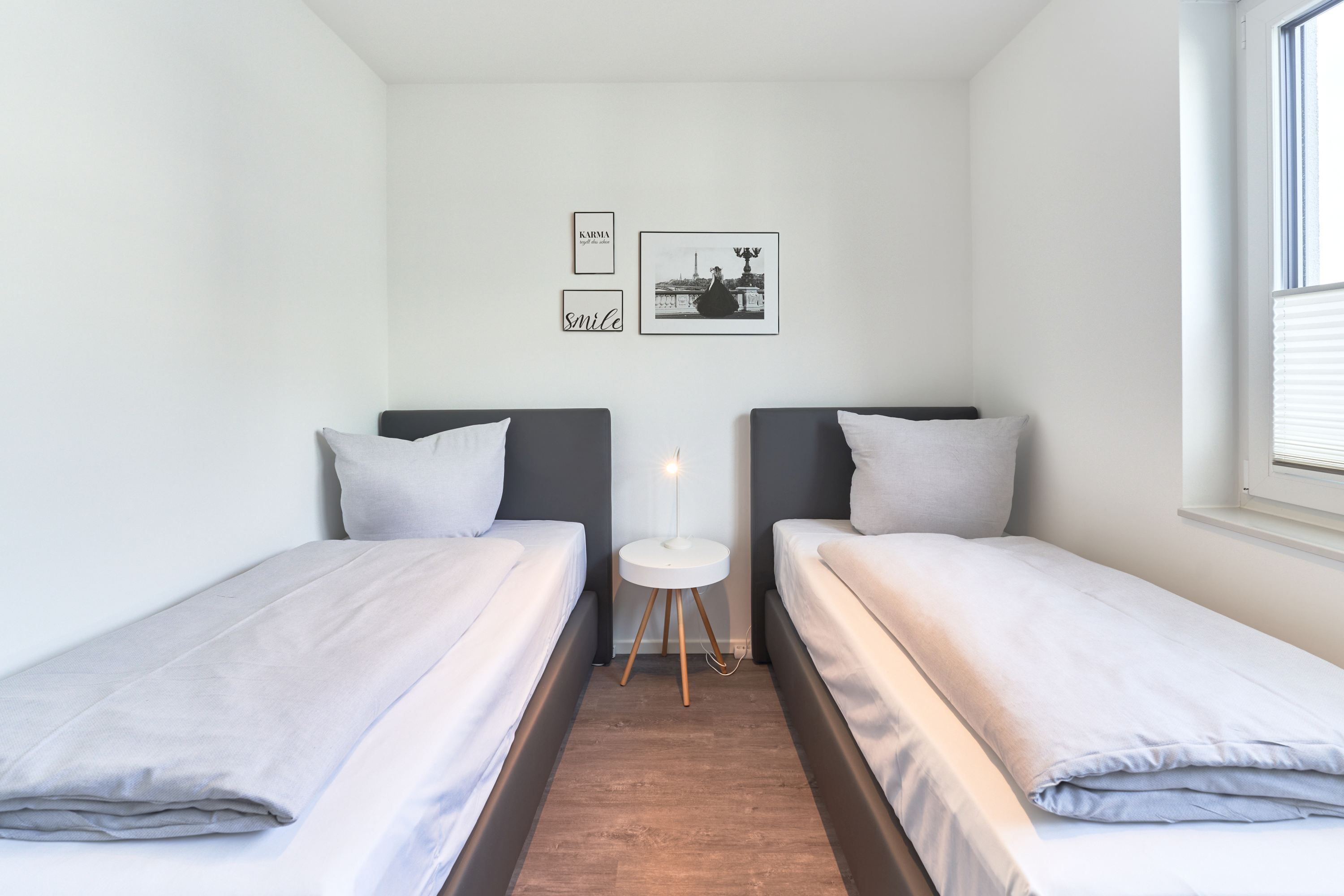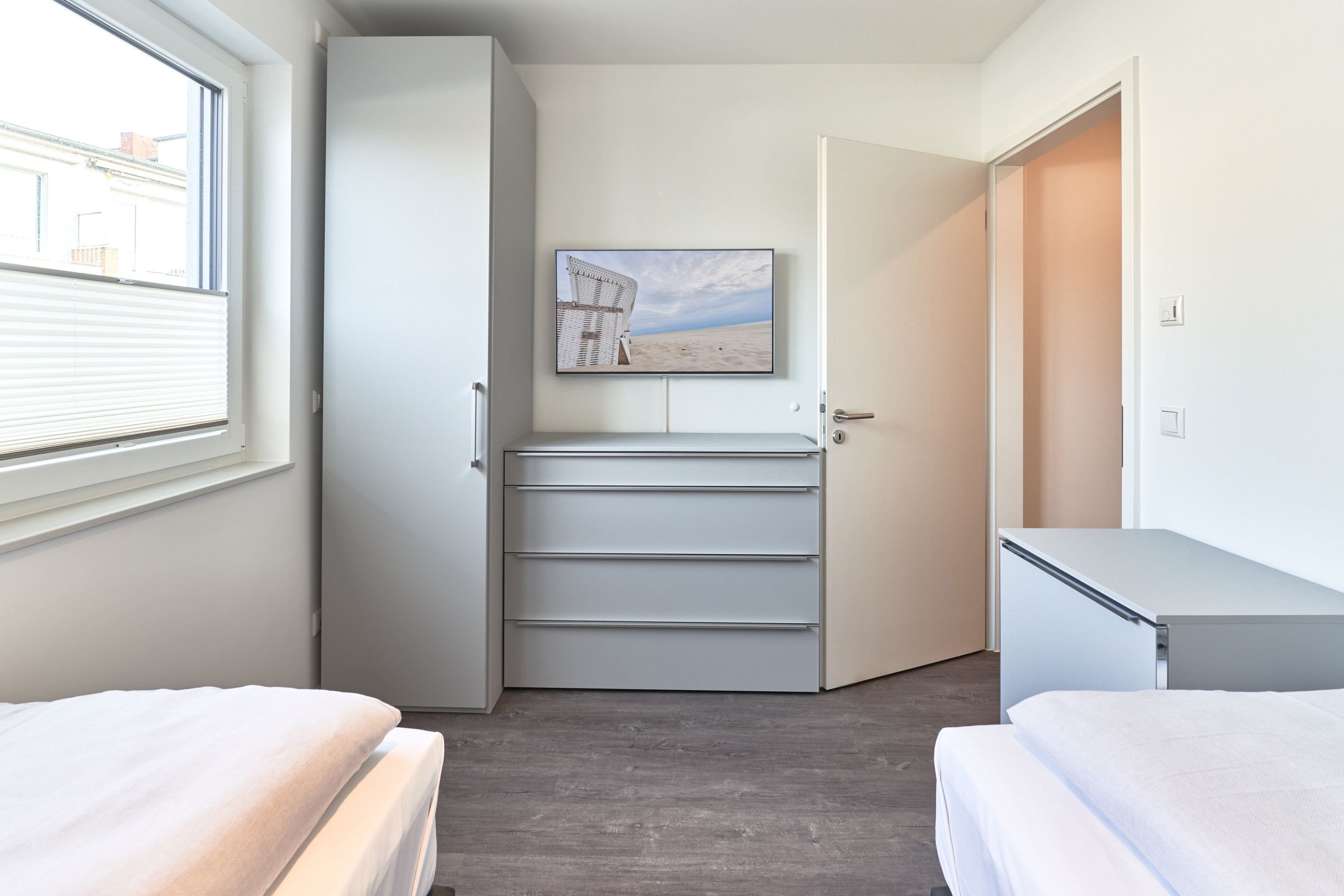Das erste Schlafzimmer ist mit einem Boxspringbett (1,80 x 2,00m), einem Smart-TV (43) sowie einem Kleiderschrank ausgestattet. Im 2. Schlafzimmer befinden sich zwei Einzel-Boxspringbetten (1,00 x 2,00m) sowie ein 43-TV. Alle Räume lassen sich durch Außenrollläden verdunkeln. Das Duschbad ist mit einem Handtuchheizkörper und einer bodengleichen Dusche ausgestattet. Kosmetikspiegel und Haartrockner sind hier selbstverständlich vorhanden.