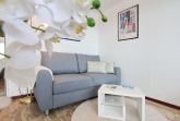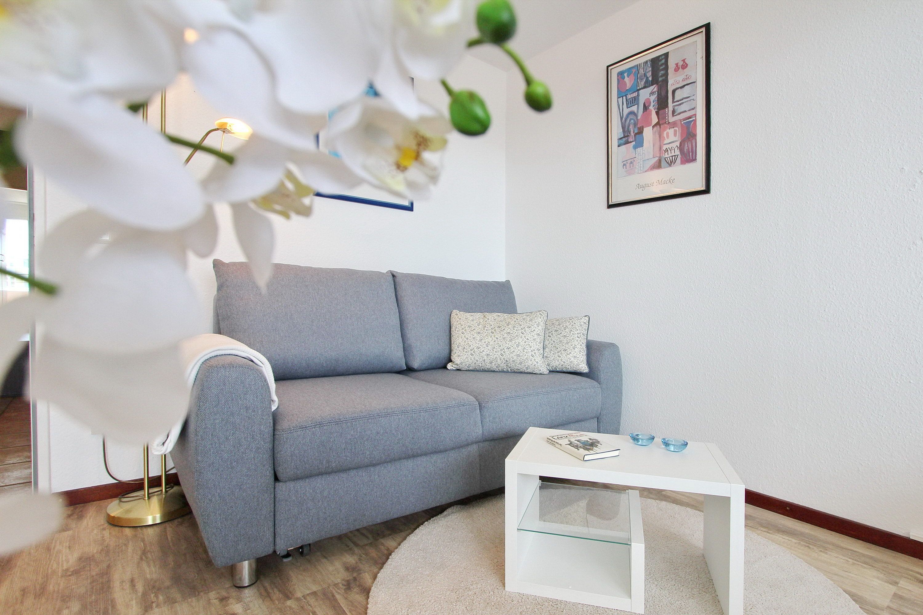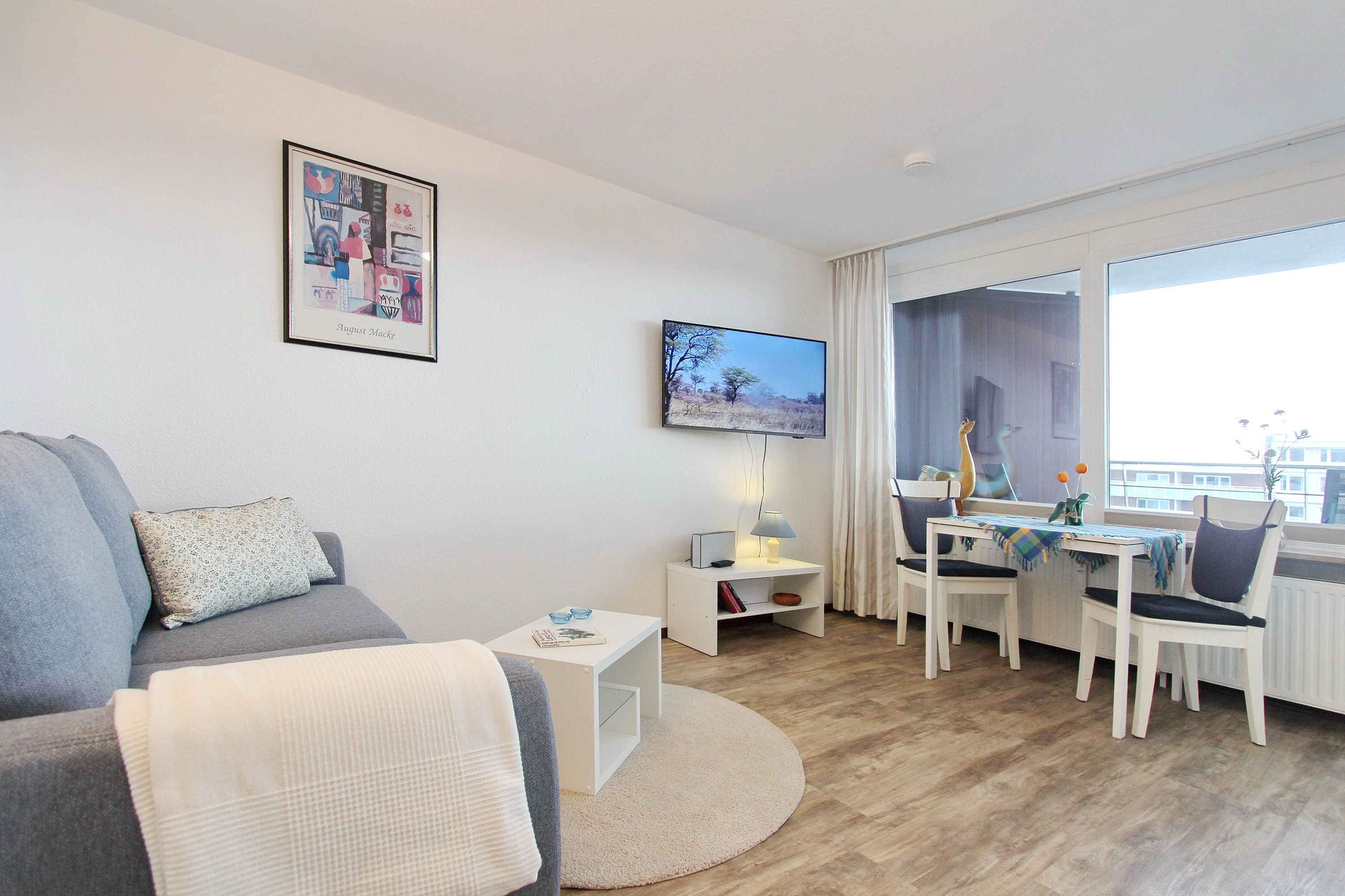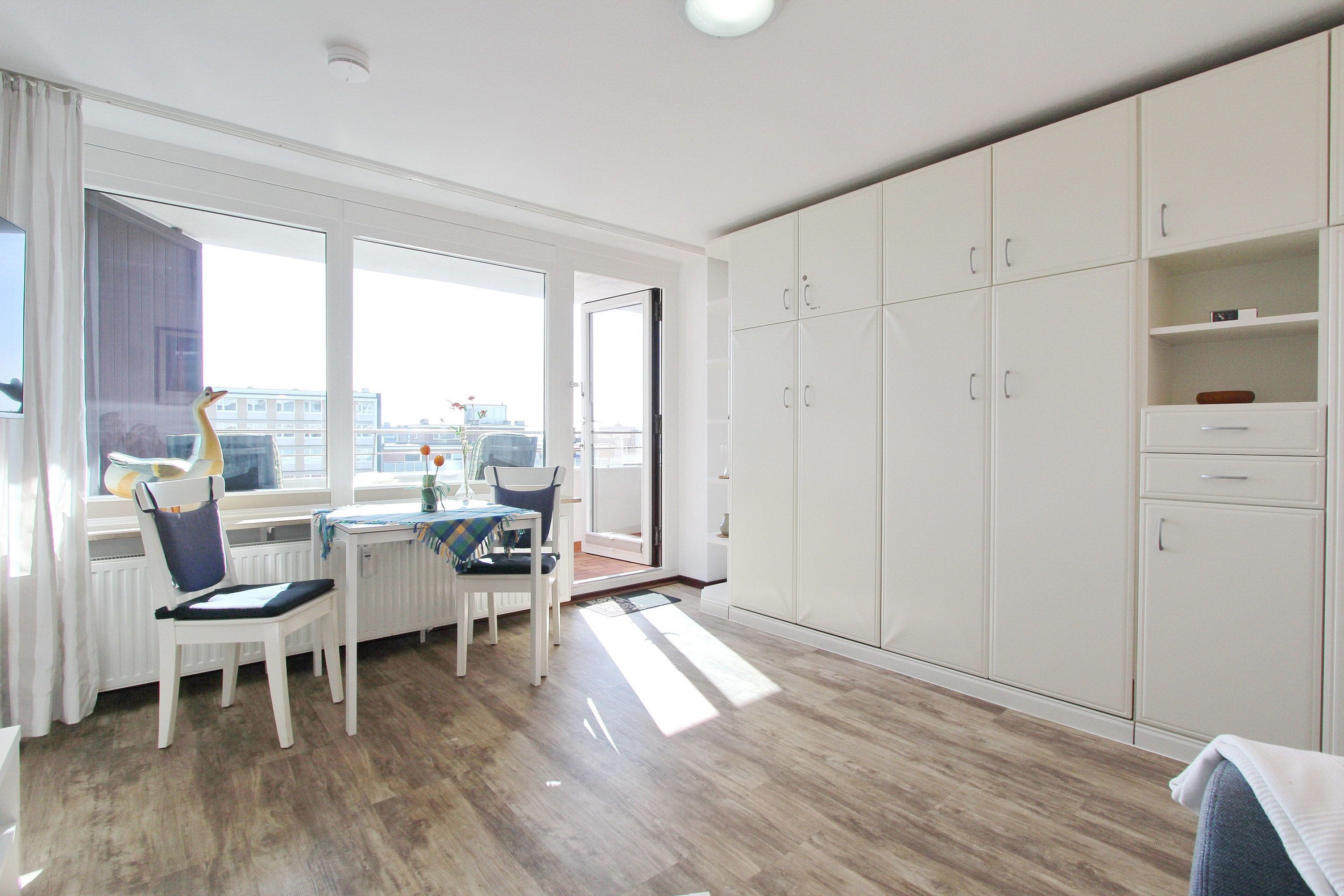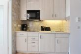Diese hell und freundlich eingerichtete Nichtraucherwohnung befindet sich in der 3. Etage des Haus Metropol. Der kombinierte Wohn-/Schlafraum hat einen vorgelagerten großen Ostbalkon mit Balkonmöbeln und Auflagen. Es gibt Einzelschrankbetten, einen Essplatz am Fenster mit 2 Stühlen und eine gemütliche Couch. Designfussboden wurde verlegt. Das Badezimmer hat eine Dusche, ein großes Waschbecken, einen Handtuchtrockner sowie einen Fön. In der Einbauküche im Flur mit Cerankochfeld mit 4 Platten und Mikrowellen-Backkombination können sie sich selbst verpflegen. Zur technischen Ausstattung dieser Wohnung gehört ein Flachbildfernseher, ein Radio und ein Wecker. Ein freies WLAN Netzwerk (WEG Haus Metropol - Passwortfrei - ohne Gewähr) steht ihnen kostenfrei zur Verfügung. Wohnungsgröße: 30 m².