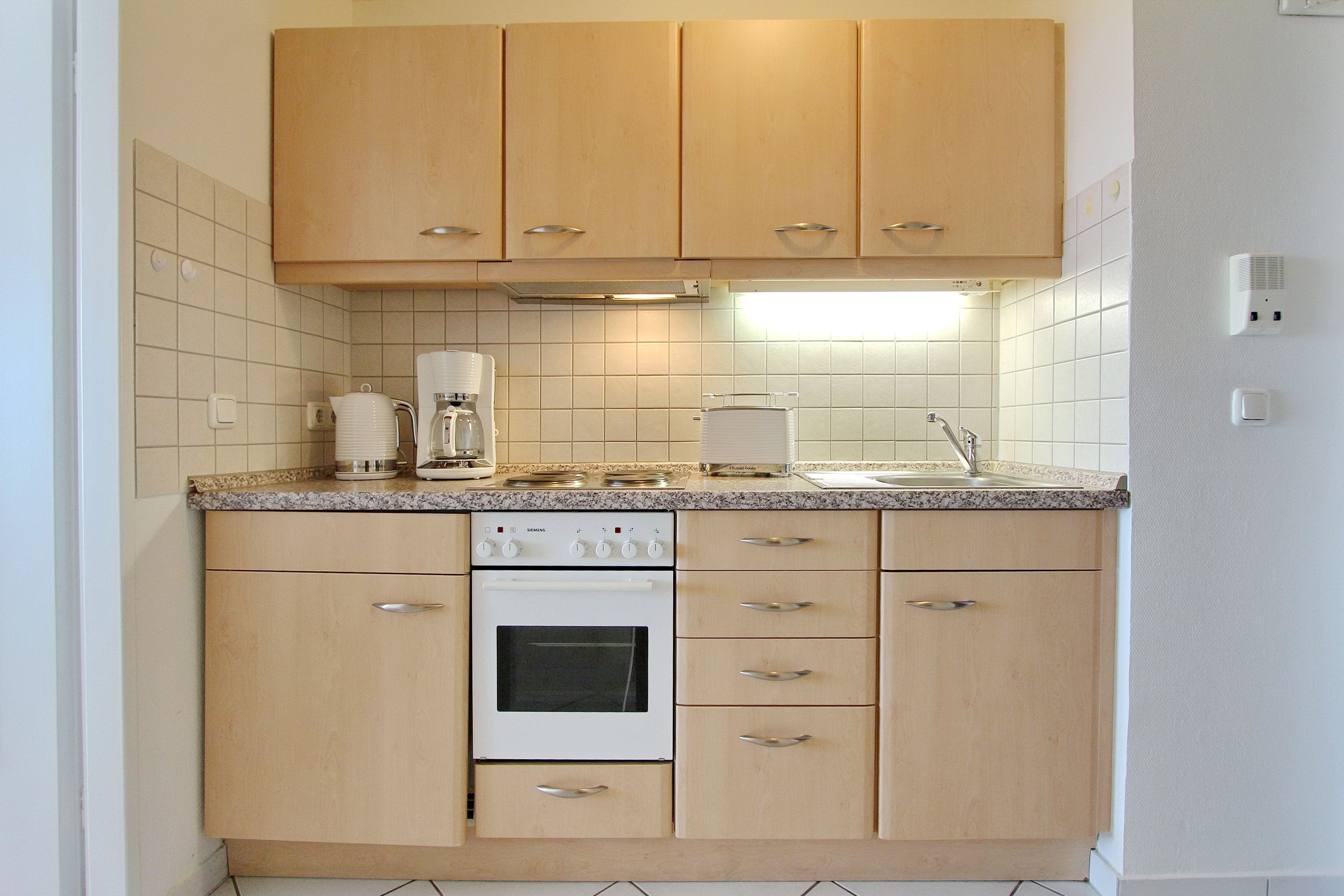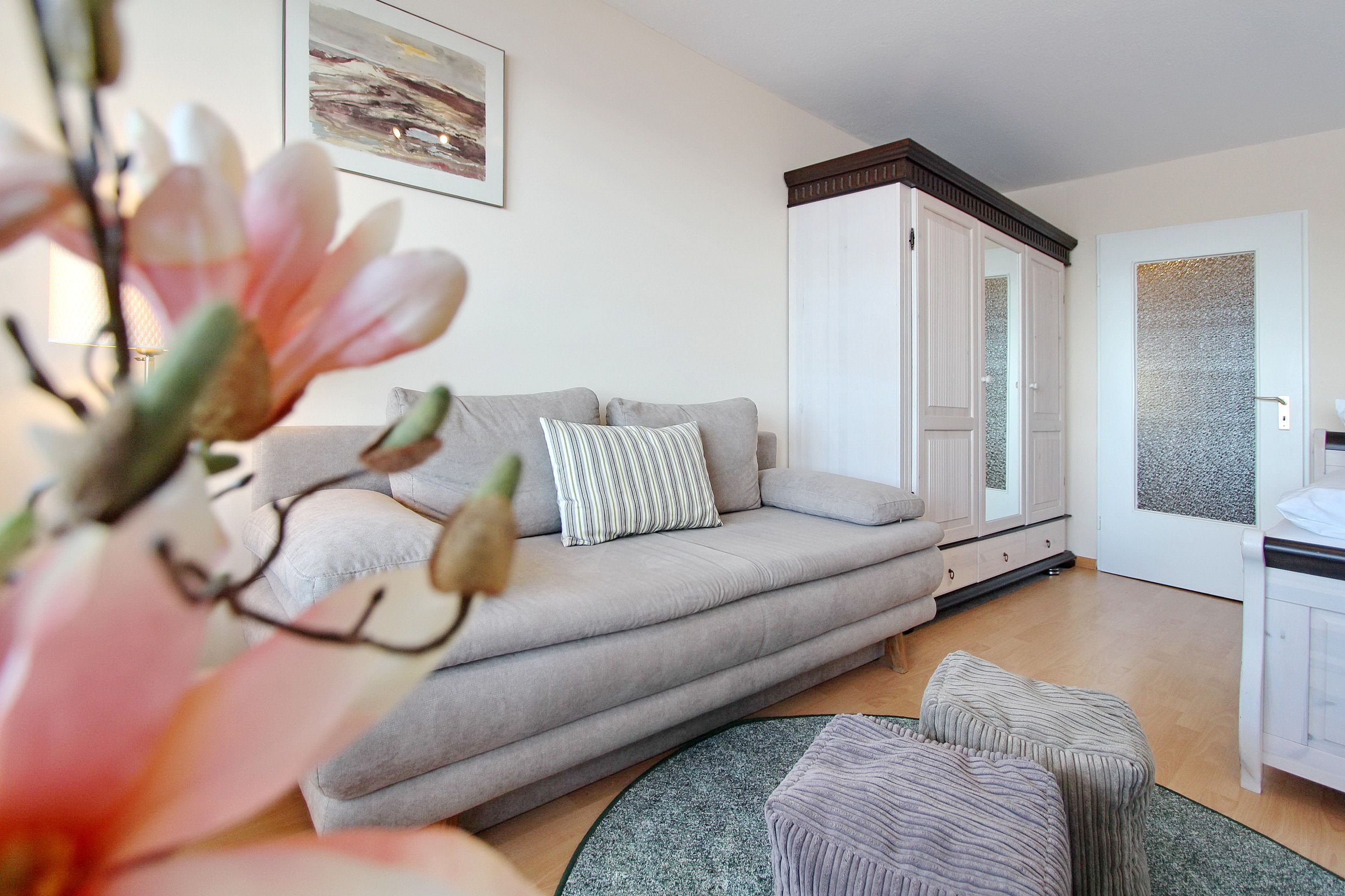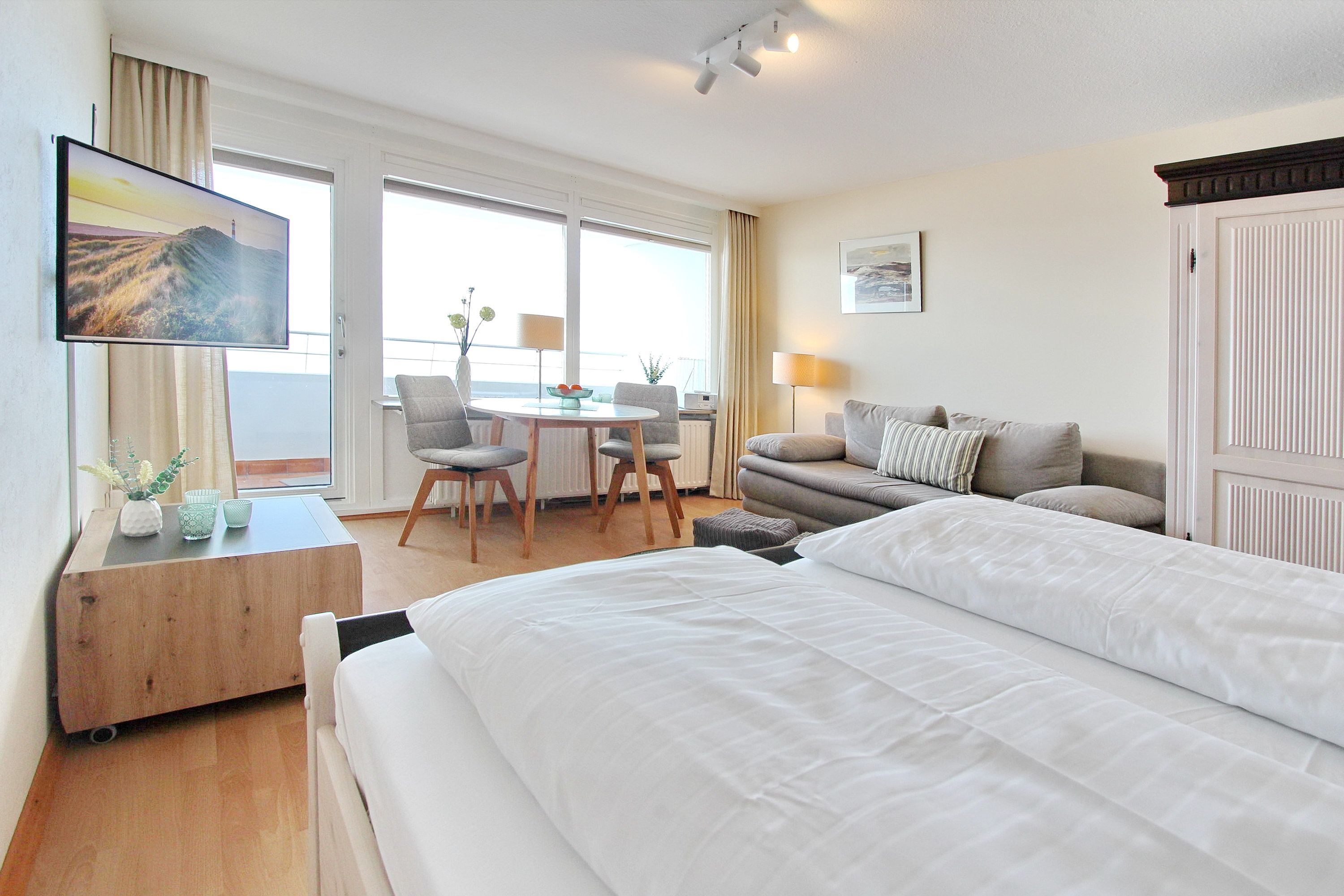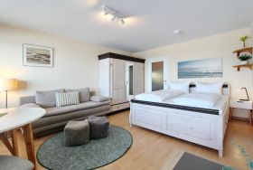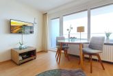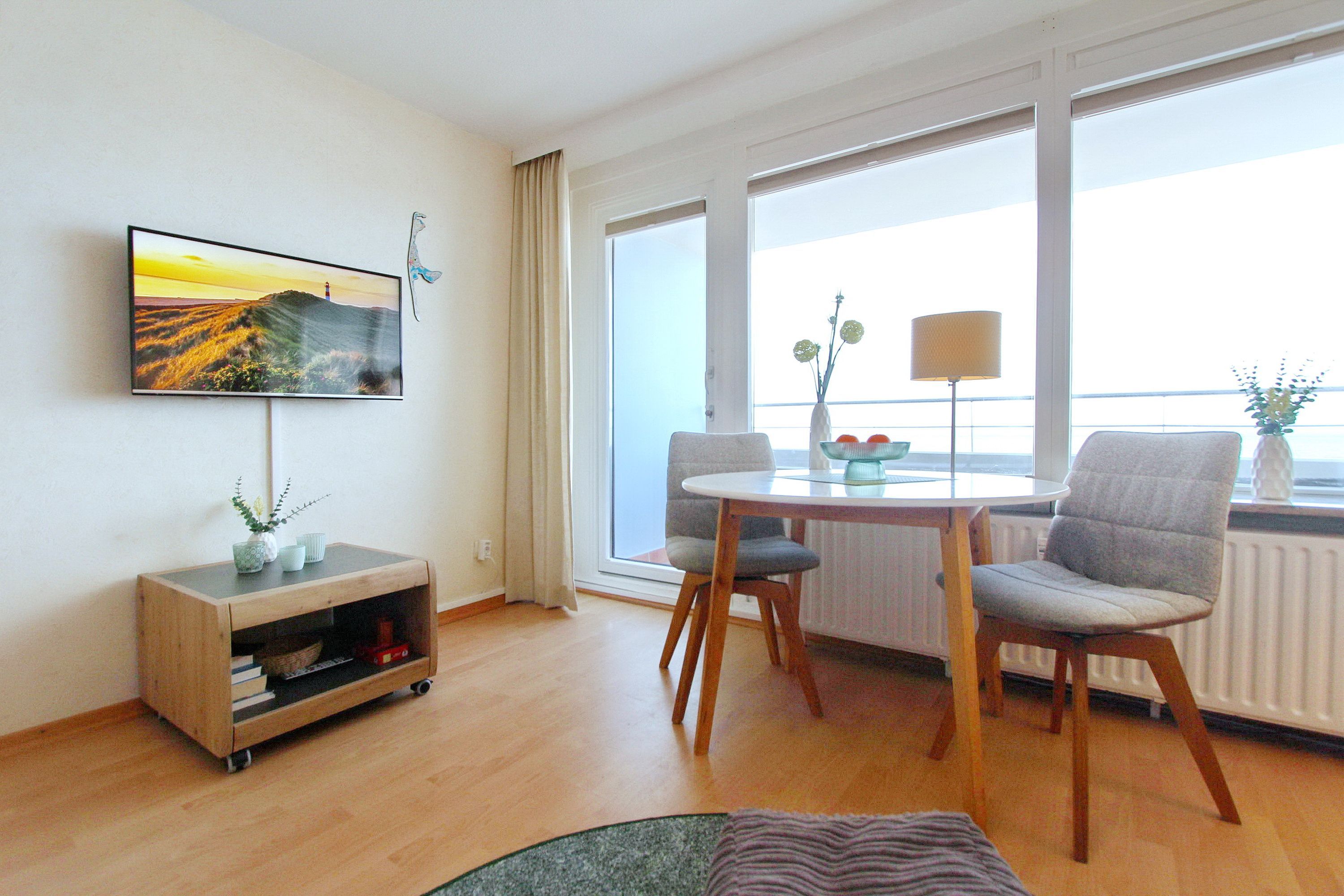Einzimmerwohnung in der 4. Etage im Haus Metropol mit herrlichem Blick über den Strand und das Meer. Der kombinierte Wohn-/Schlafraum mit vorgelagertem Westbalkon und Balkonmöbeln verfügt über ein modernes Doppelbett, eine große Couch sowie eine Essgruppe mit 2 Stühlen am Fenster. In der Wohnung wurde Laminatfußboden verlegt. Das Badezimmer hat eine Dusche und eine kleine Einbauküche mit Backofen befindet sich im Flur. Zur technischen Ausstattung dieser Nichtraucherwohnung gehört : ein Flachbildfernseher und ein Radio mit CD Player. Ein freies WLAN Netzwerk (WEG Haus Metropol - Passwortfrei - ohne Gewähr) steht ihnen ebenfalls kostenfrei zur Verfügung. Wohnungsgröße: ca. 34 m².