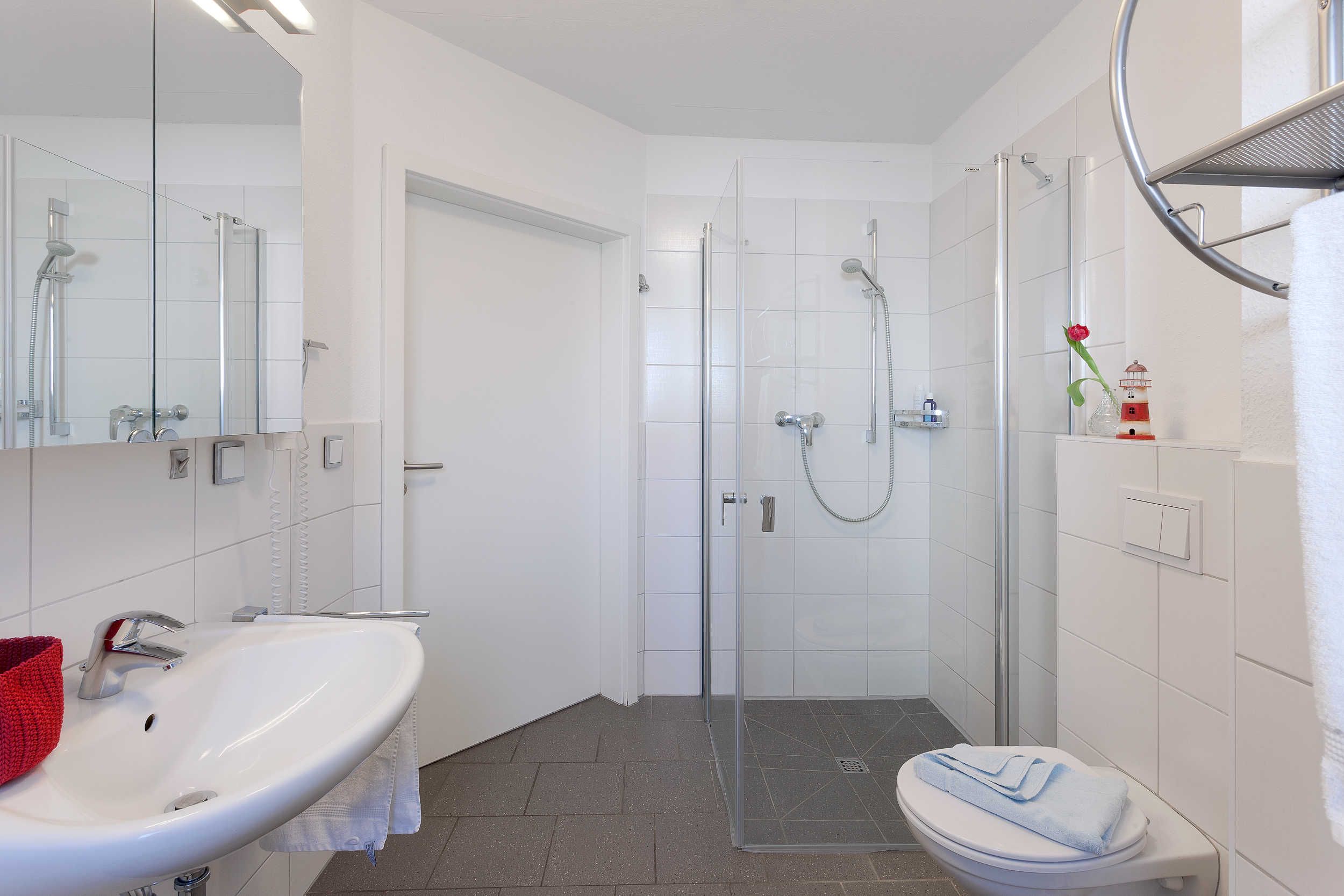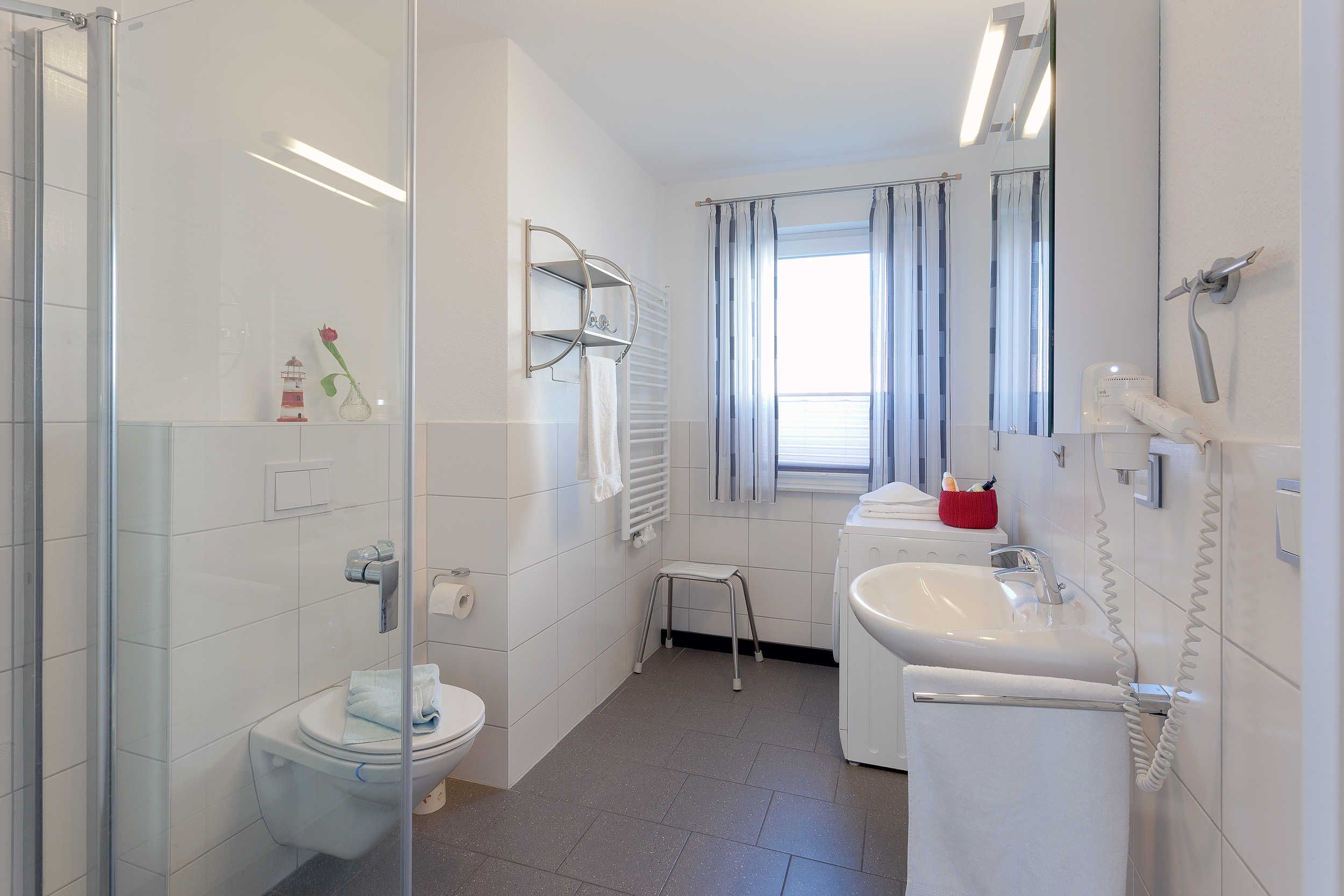 Das helle, geräumige Badezimmer ist mit Dusche, WC und Waschmaschine ausgestattet praktisch und komfortabel, auch für längere Aufenthalte.