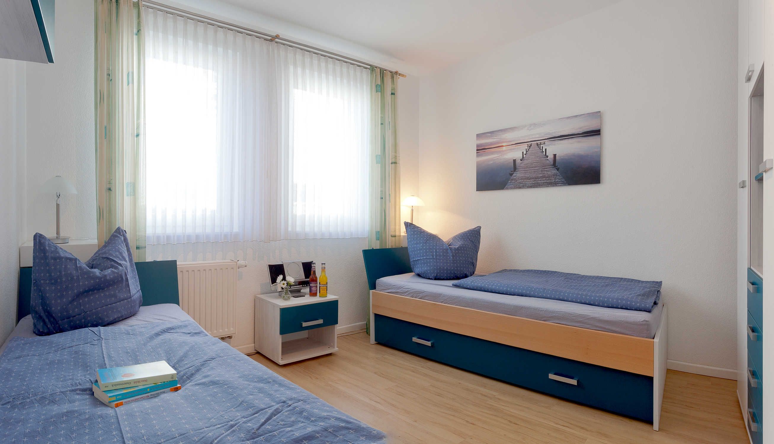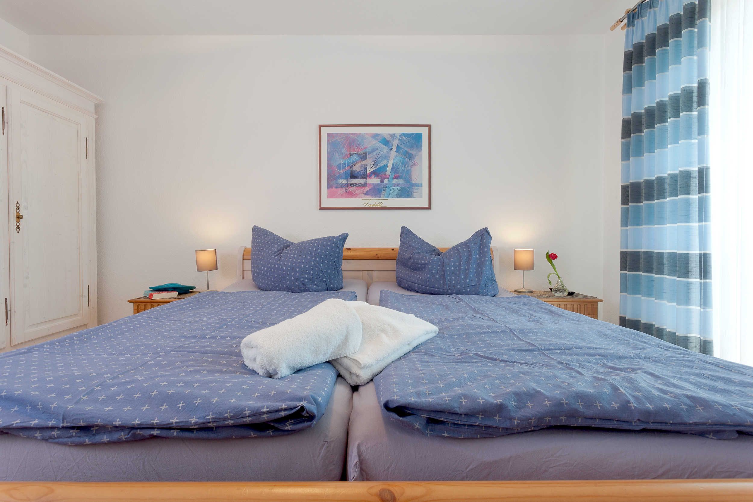 Zwei komfortable Schlafzimmer sorgen für erholsamen Schlaf: Eines mit einem kuscheligen Doppelbett, das andere mit zwei bequemen Einzelbetten ideal für Familien, Freunde oder Paare.
