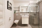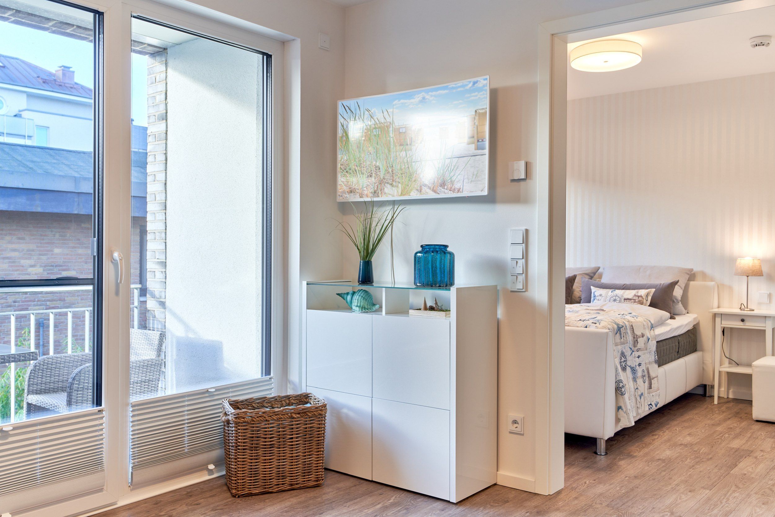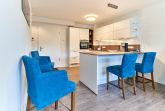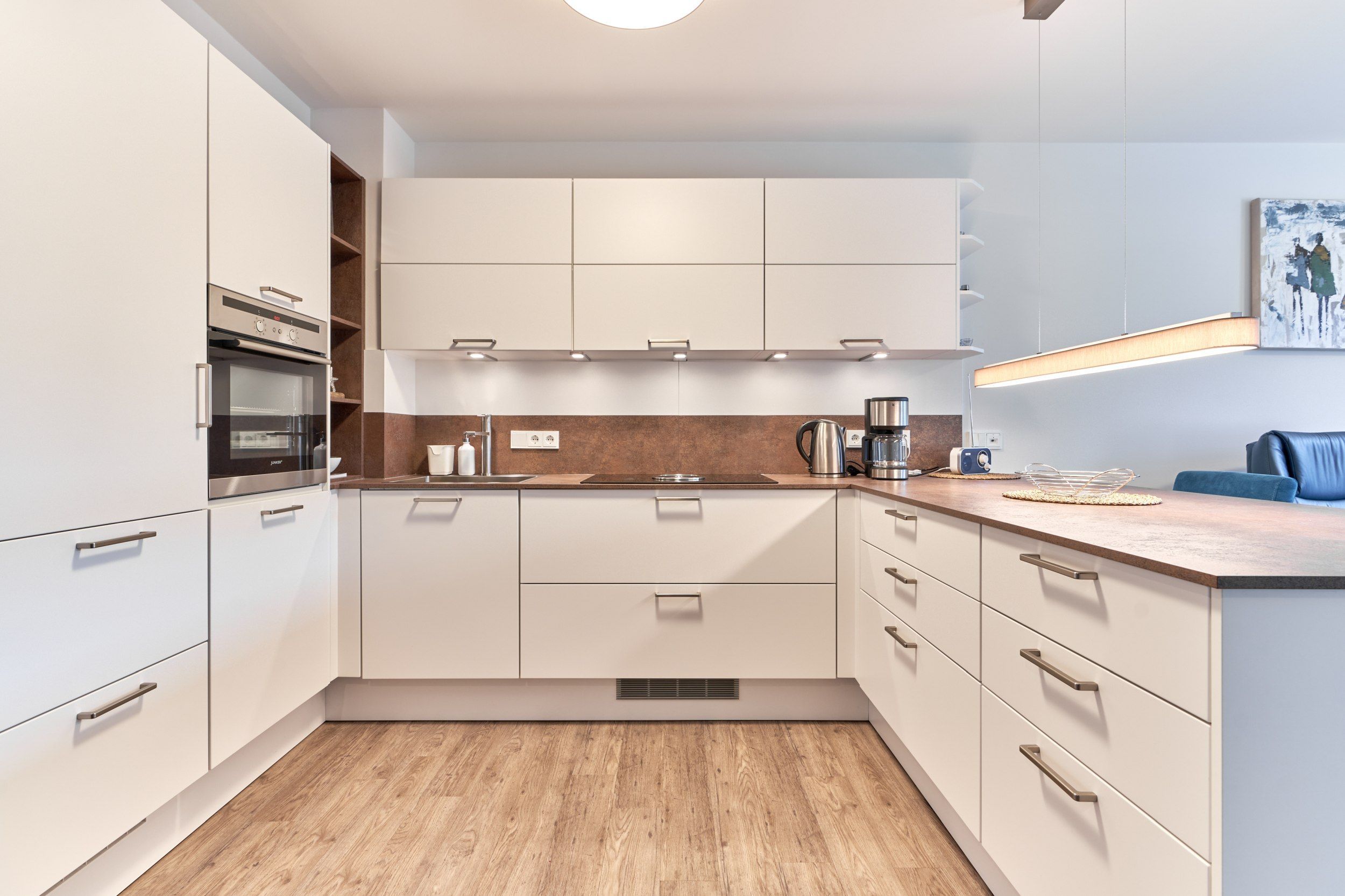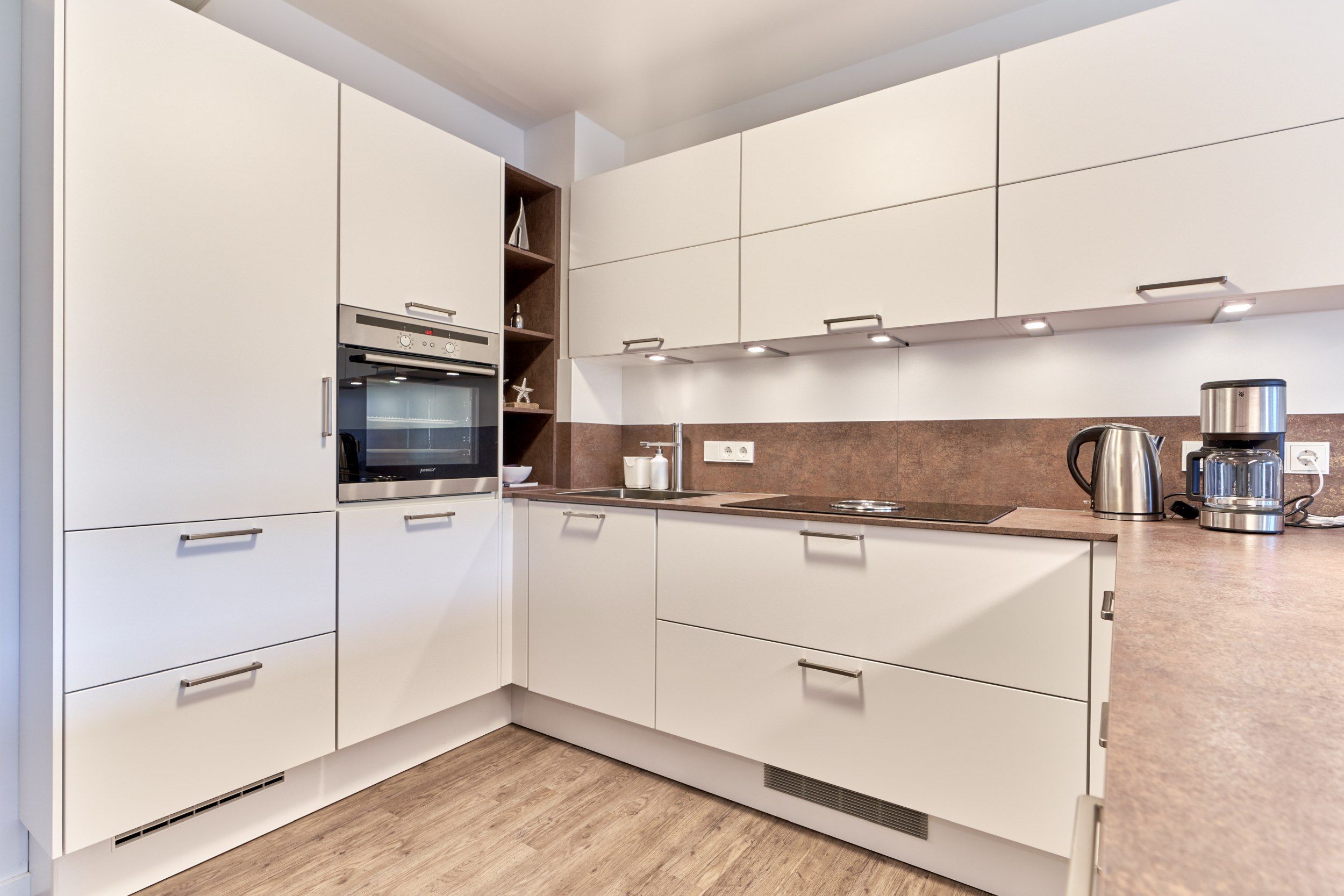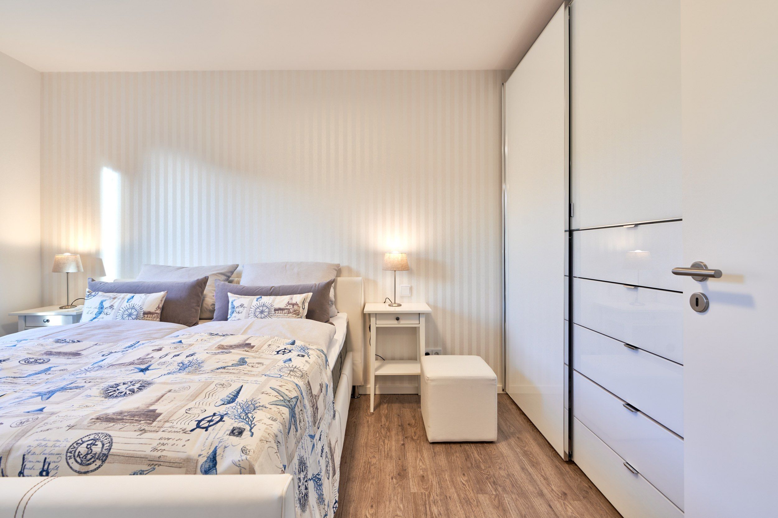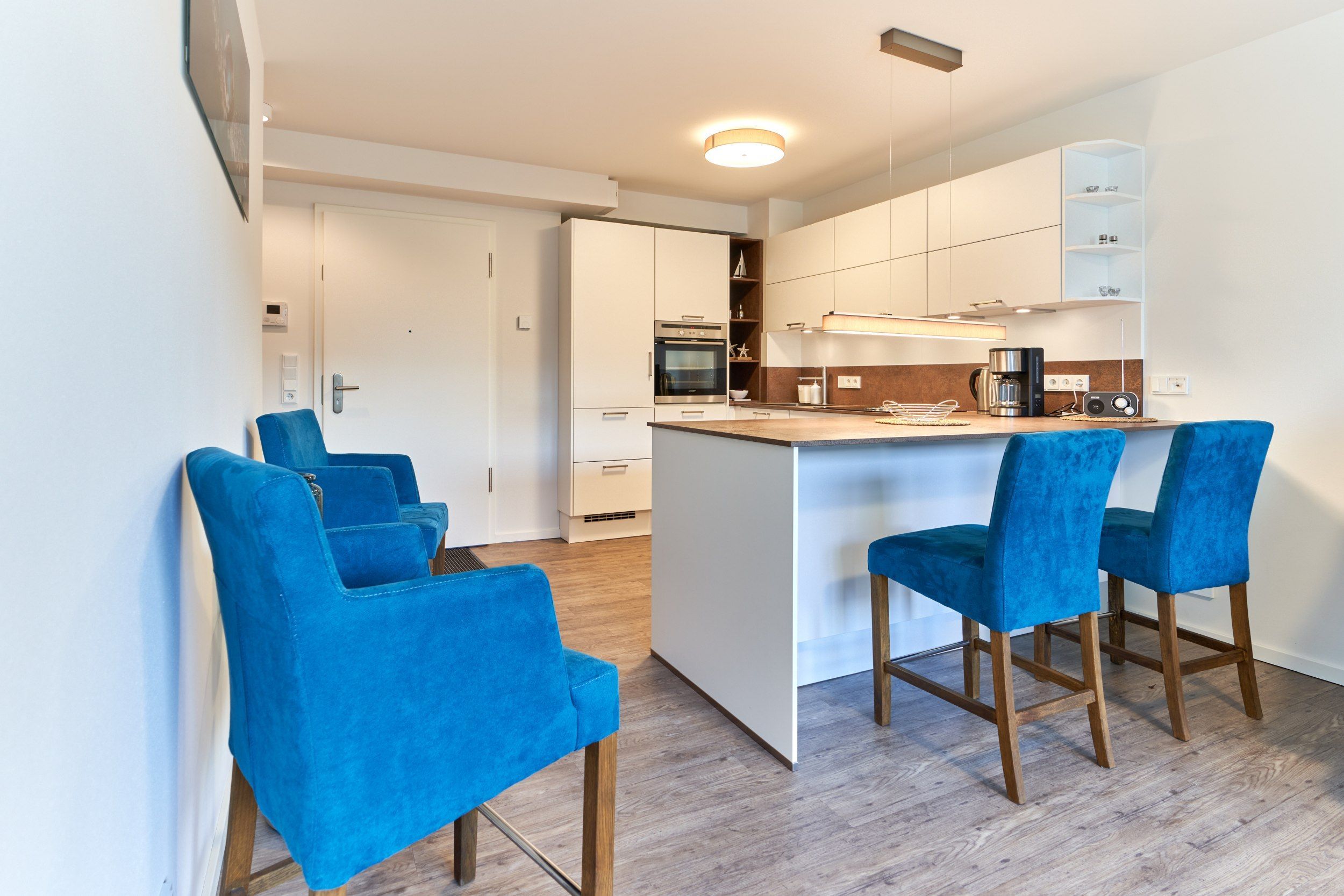 Die offene Küche ist komplett ausgestattet, mit einem Esstresen sowie zwei Stühlen. Der Wohn-Essbereich ist hell und freundlich gestaltet. Der Wohnbereich bietet zwei bequeme Relaxsessel und ein Sofa. Ein Flachbildschirm sowie eine Stereoanlage sorgen für Unterhaltung. Ein kostenfreies WLAN ist selbstverständlich. Im Schlafzimmer steht ein bequemes Doppelbett mit Einzelmatratzen (0,80 x 2,00m) sowie ein geräumiger Schrank. Auch im Schlafzimmer ist ein Flachbildfernseher für Sie angebracht. Das Badezimmer verfügt u. a. über eine großzügige, bodentiefe Dusche und einen zusätzlichen Handtuchheizkörper. Es gibt einen Abstellraum, in diesem ist eine Waschmaschine mit Trocknerfunktion untergebracht.