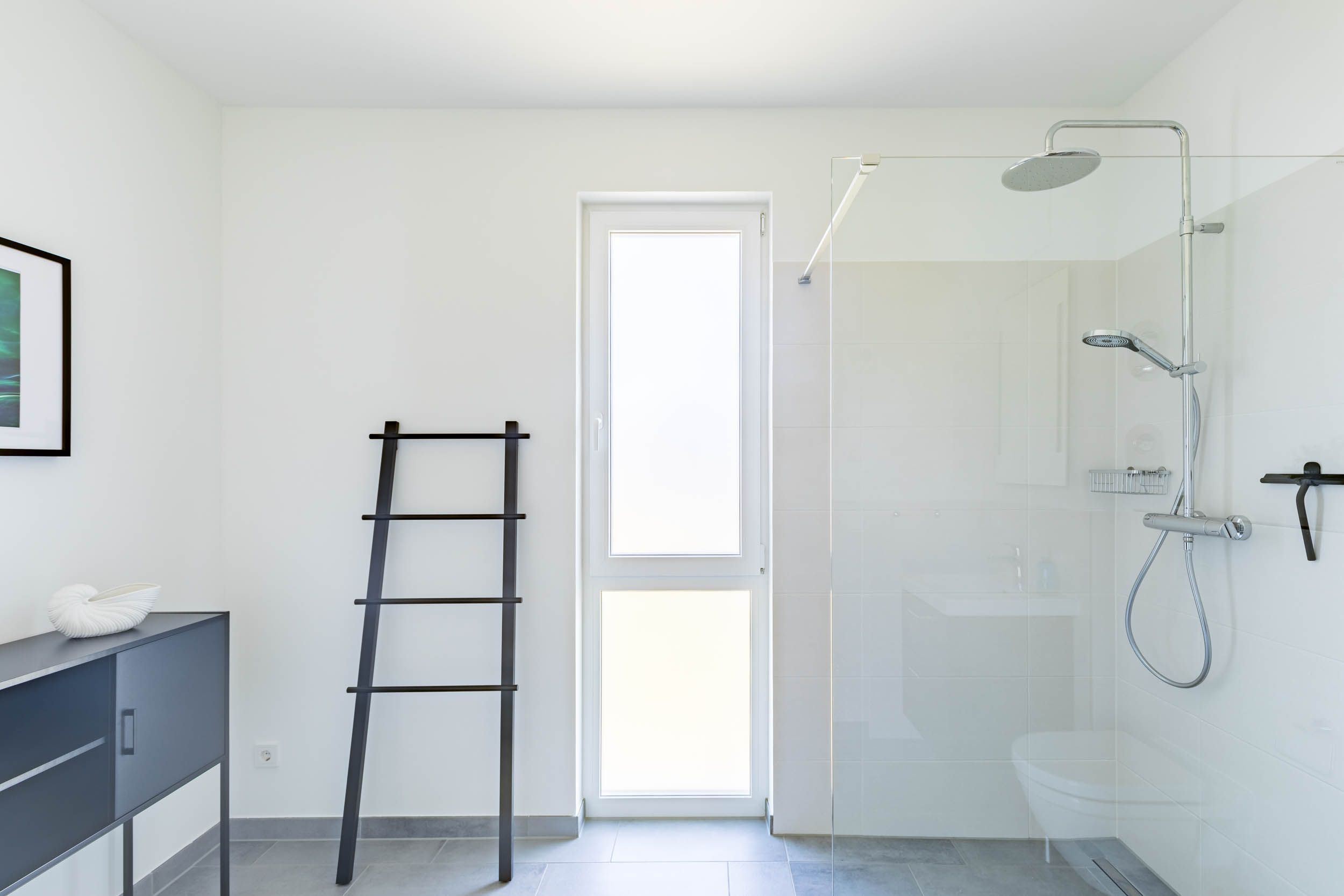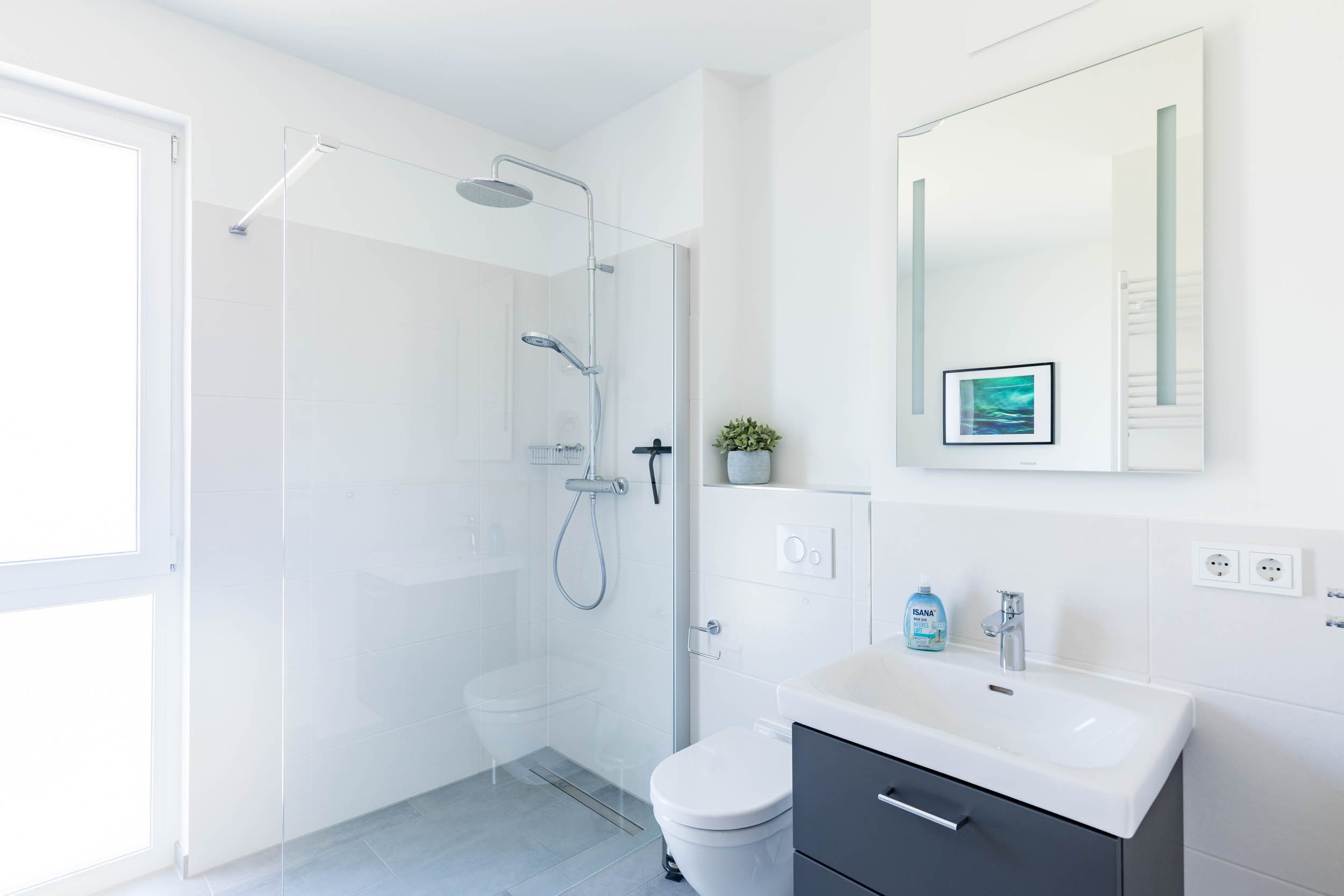 Ein großzügiges modernes Duschbad mit ebenerdiger Dusche und WC schließt sich an. Das Fenster bietet Tageslicht und hilft beim Lüften nach dem Duschen.
