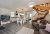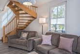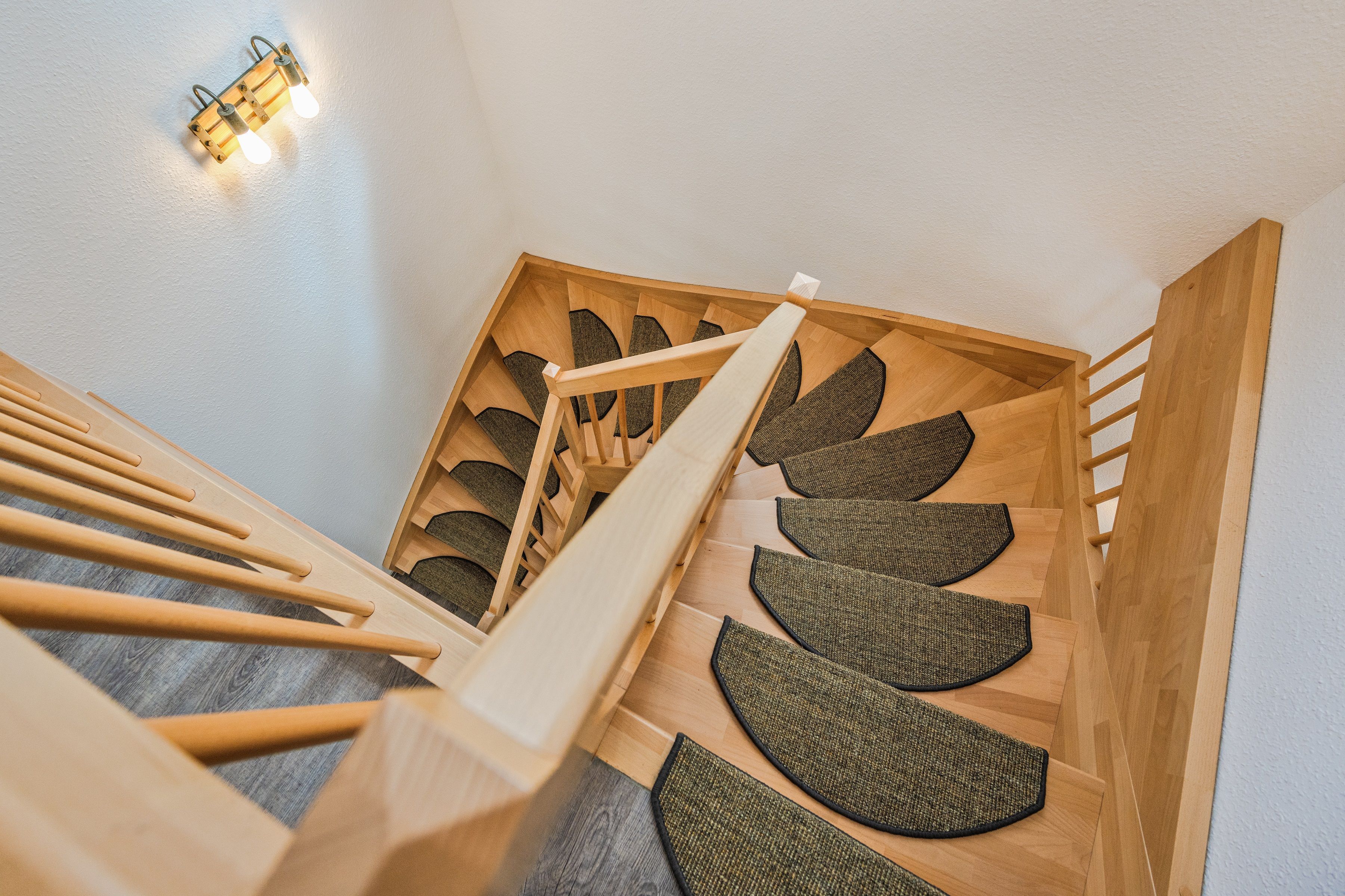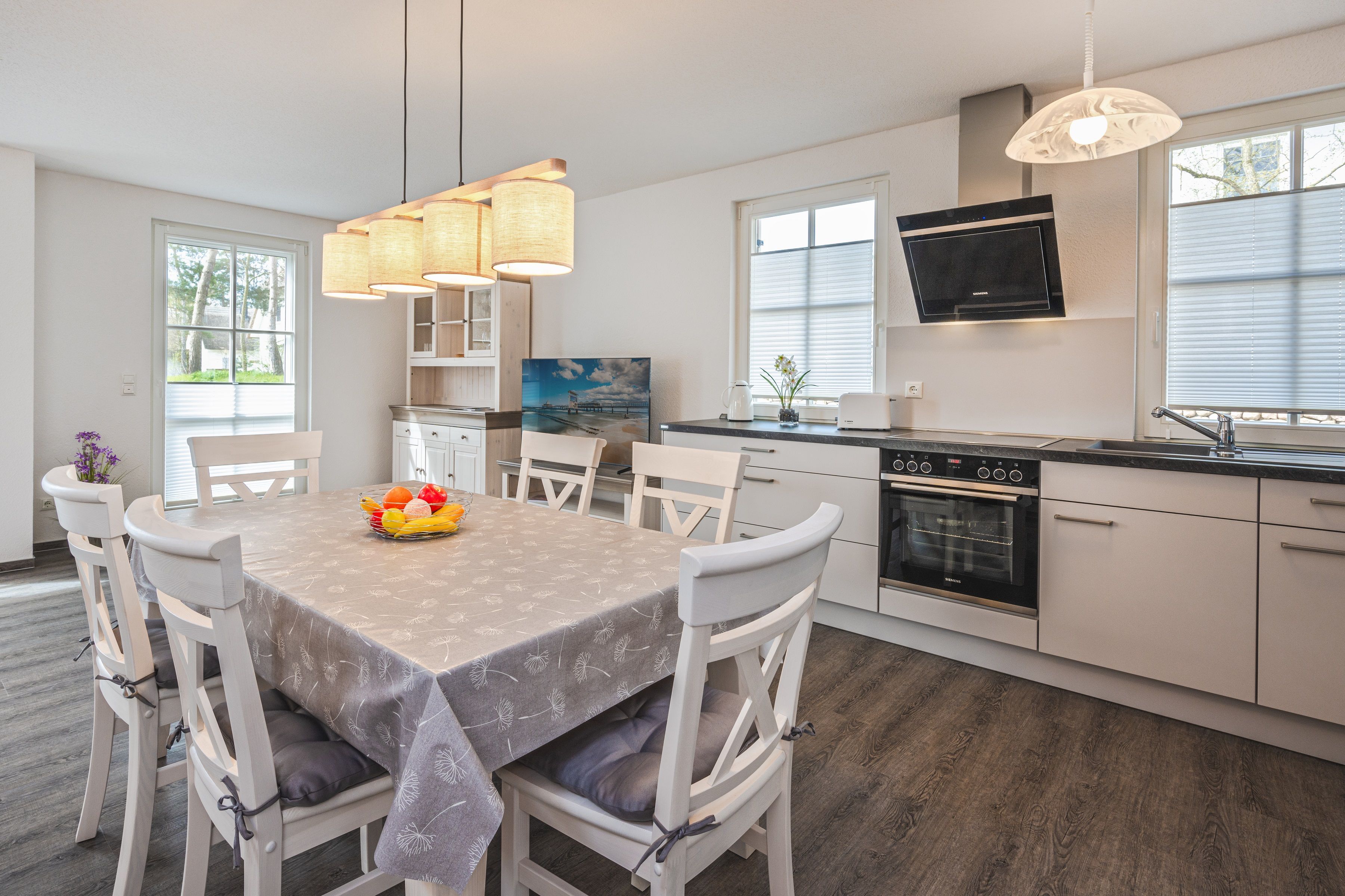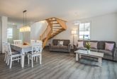 Küche und Essbereich befinden sich ebenfalls im Wohnzimmer und sind modern ausgestattet mit Backofen, Kühlschrank mit Gefrierfach, Kaffeemaschine, Toaster, Wasserkocher, Herd, Mikrowelle und Spülmaschine. Im Erdgeschoss finden Sie zusätzlich ein Gäste-WC und die hauseigene Sauna. Vor der Sauna befindet sich eine weitere Dusche und ein Waschbecken perfekt nach einem aktiven Tag.