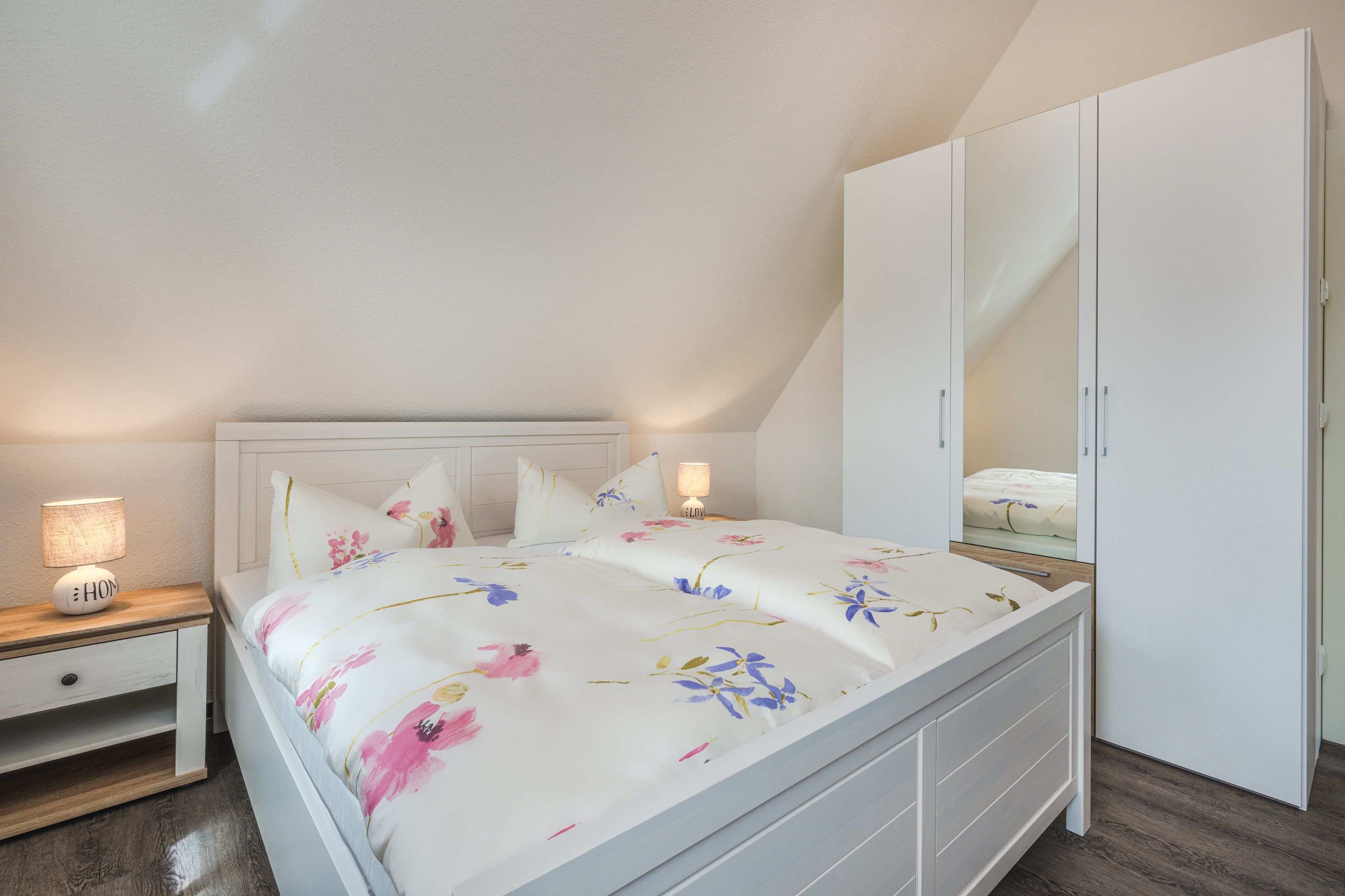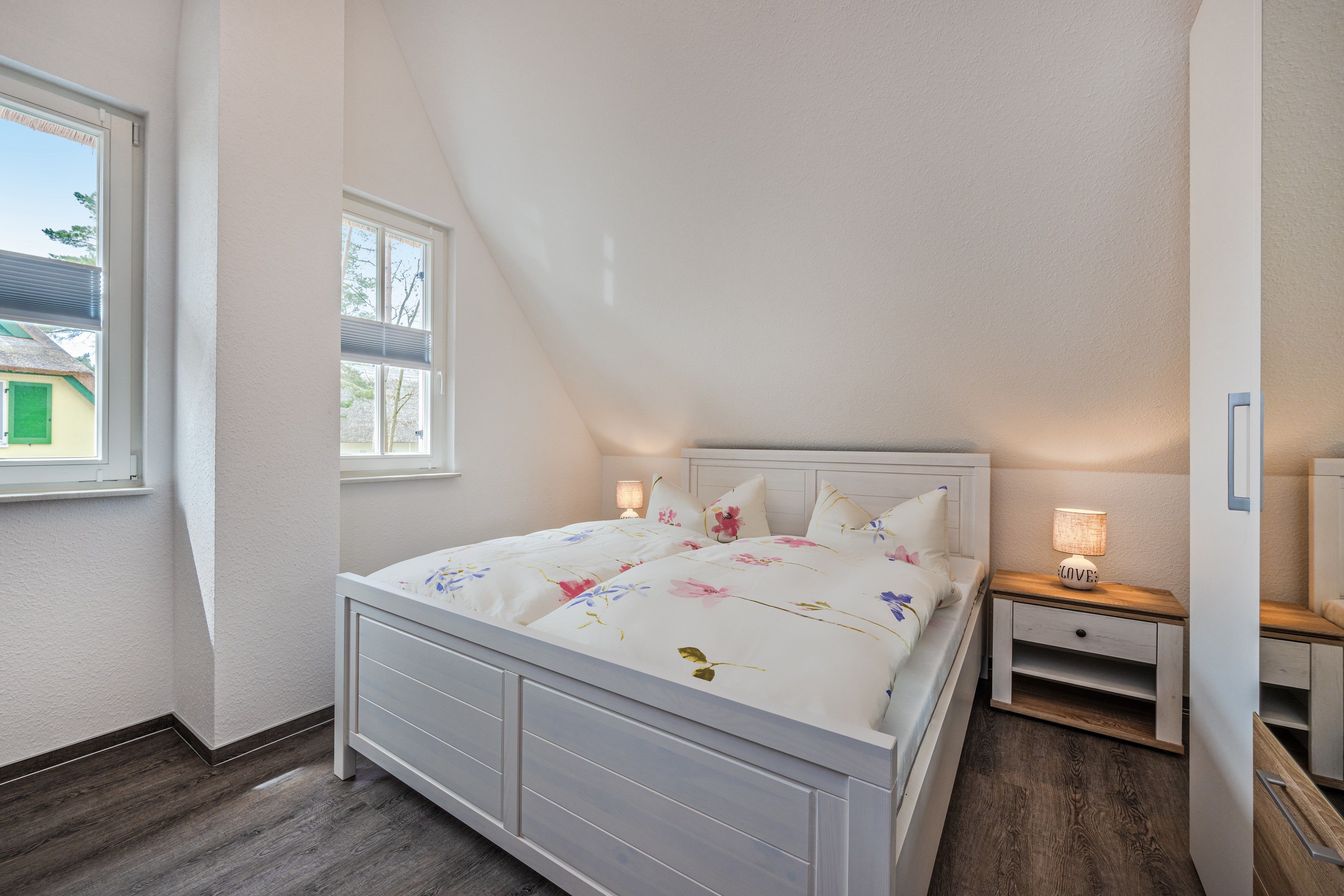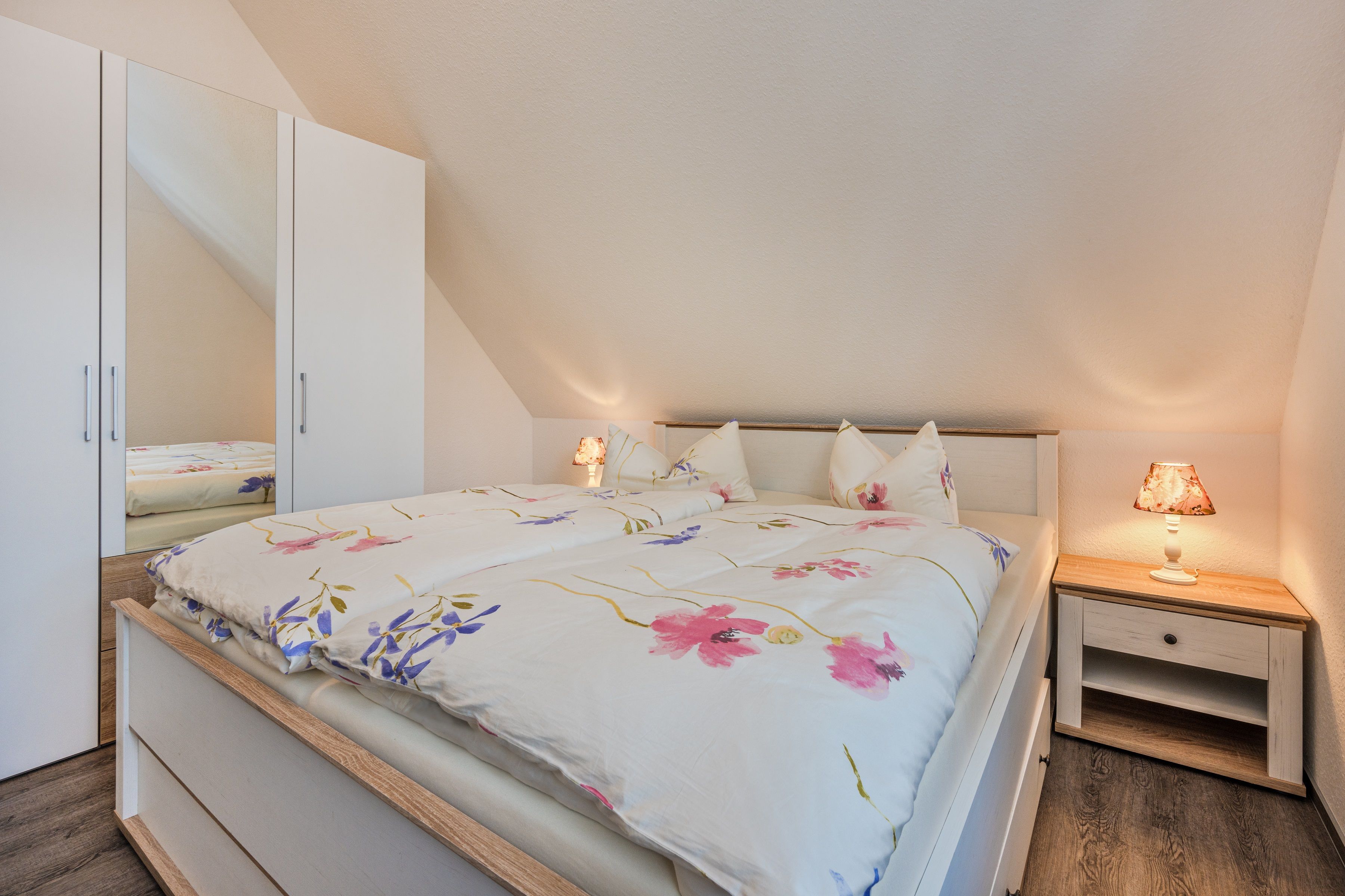 Zwei Schlafzimmer mit je einem Doppelbett und Kleiderschränken befinden sich im Obergeschoß und bieten ausreichend Rückzugsraum. Ein weiteres Badezimmer mit Dusche und Badewanne sorgt für zusätzlichen Komfort.