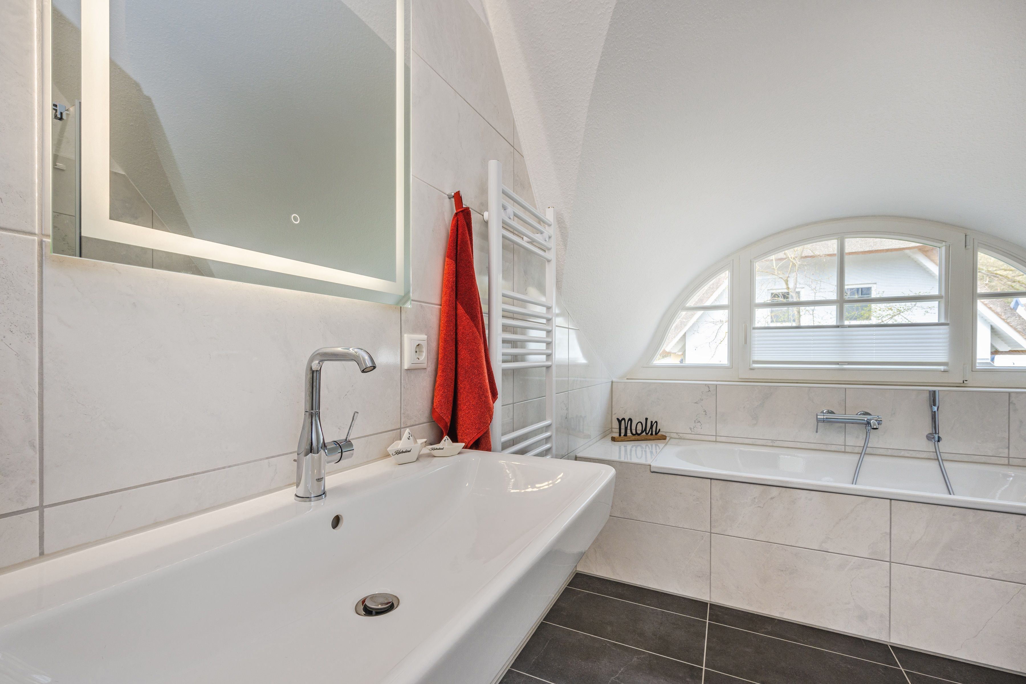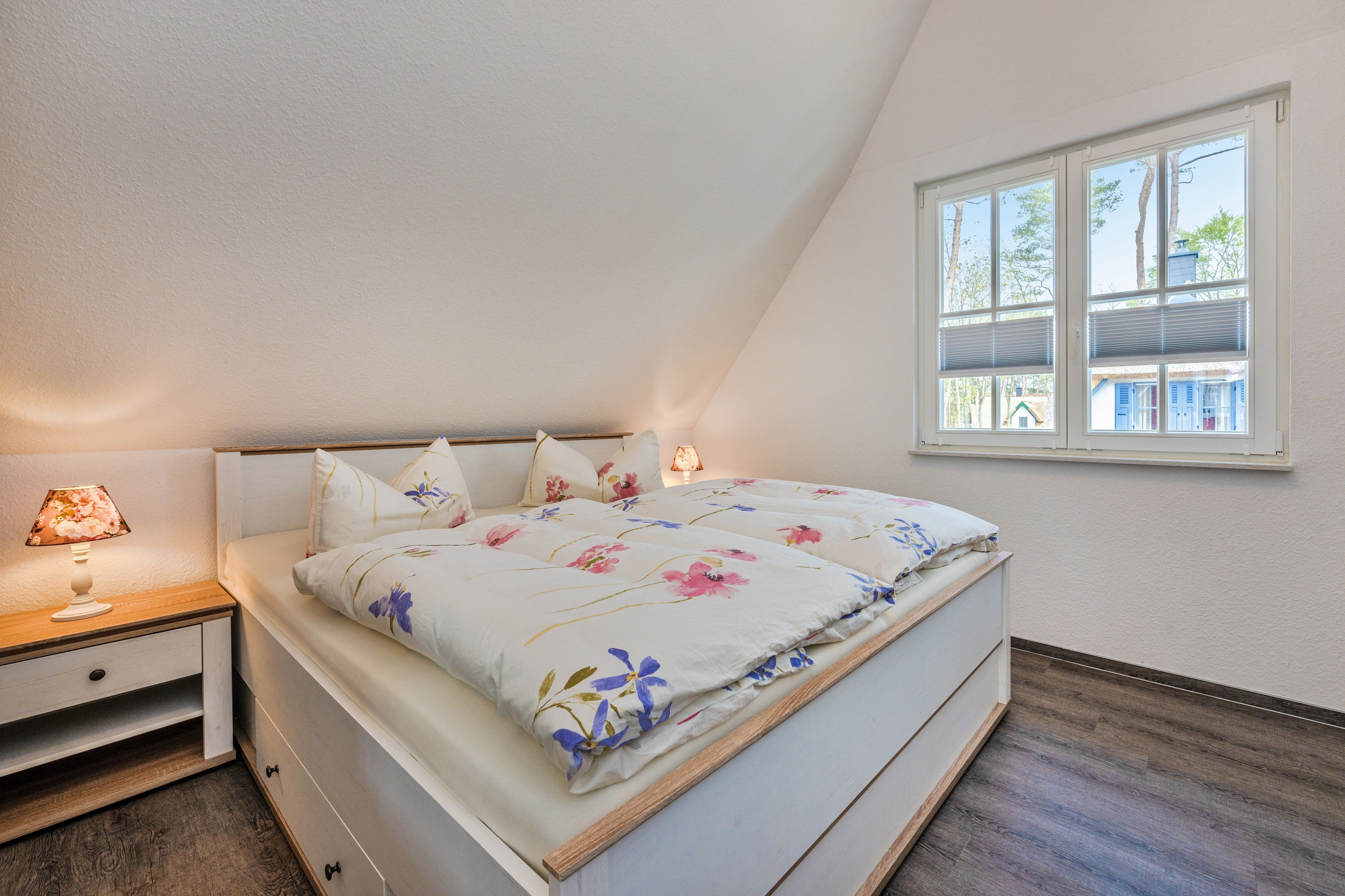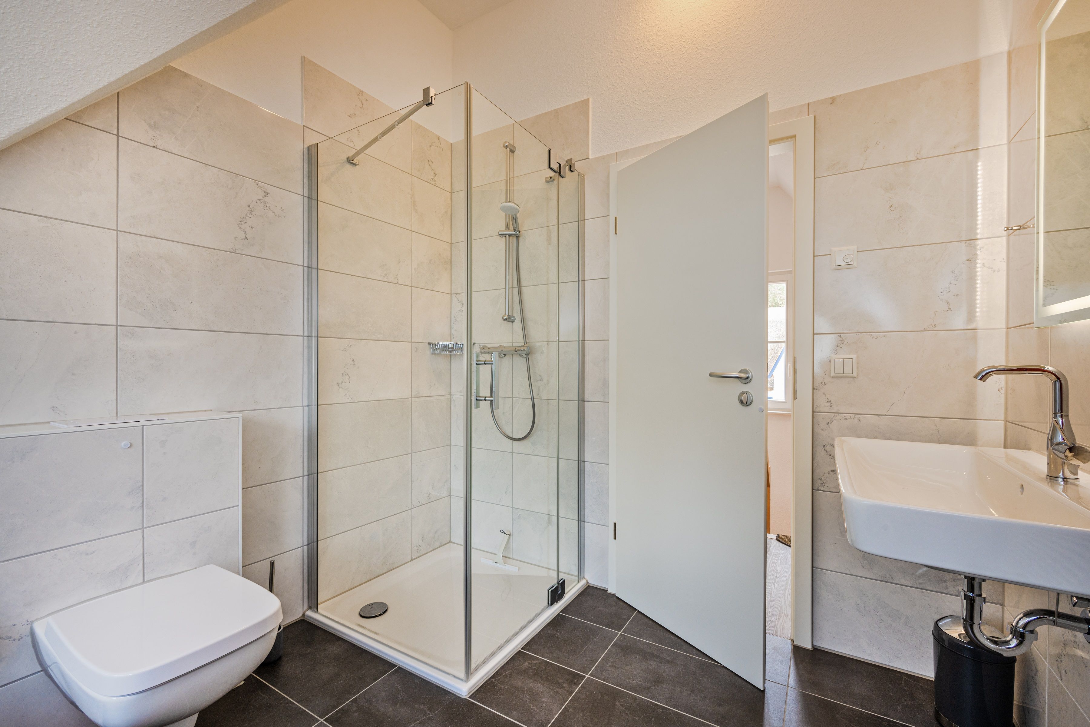 Zwei Schlafzimmer mit je einem Doppelbett und Kleiderschränken befinden sich im Obergeschoß und bieten ausreichend Rückzugsraum. Ein weiteres Badezimmer mit Dusche und Badewanne sorgt für zusätzlichen Komfort.