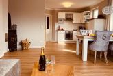 Im 1. Obergeschoss befindet sich der gemütliche, großzügige Wohnbereich mit offener Küche und Kaminofen.