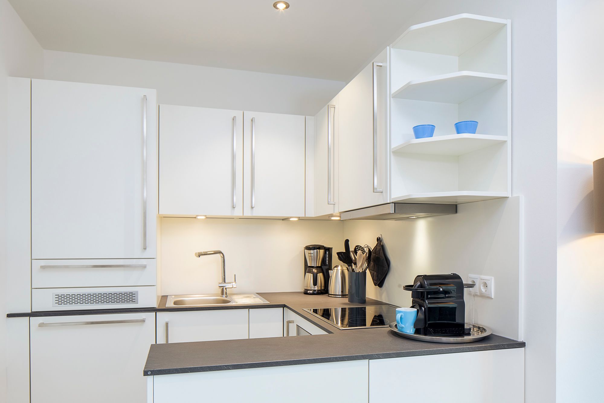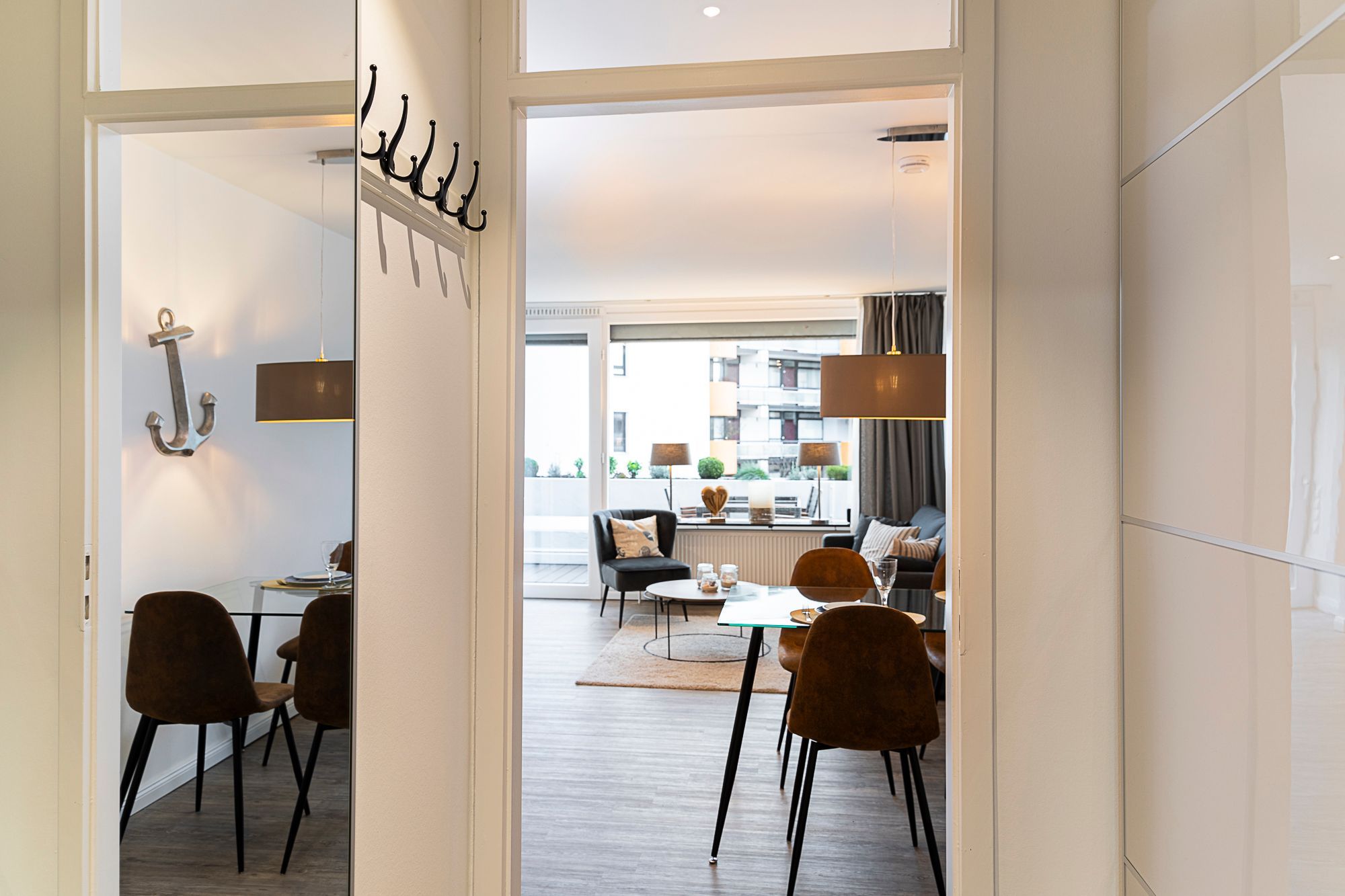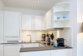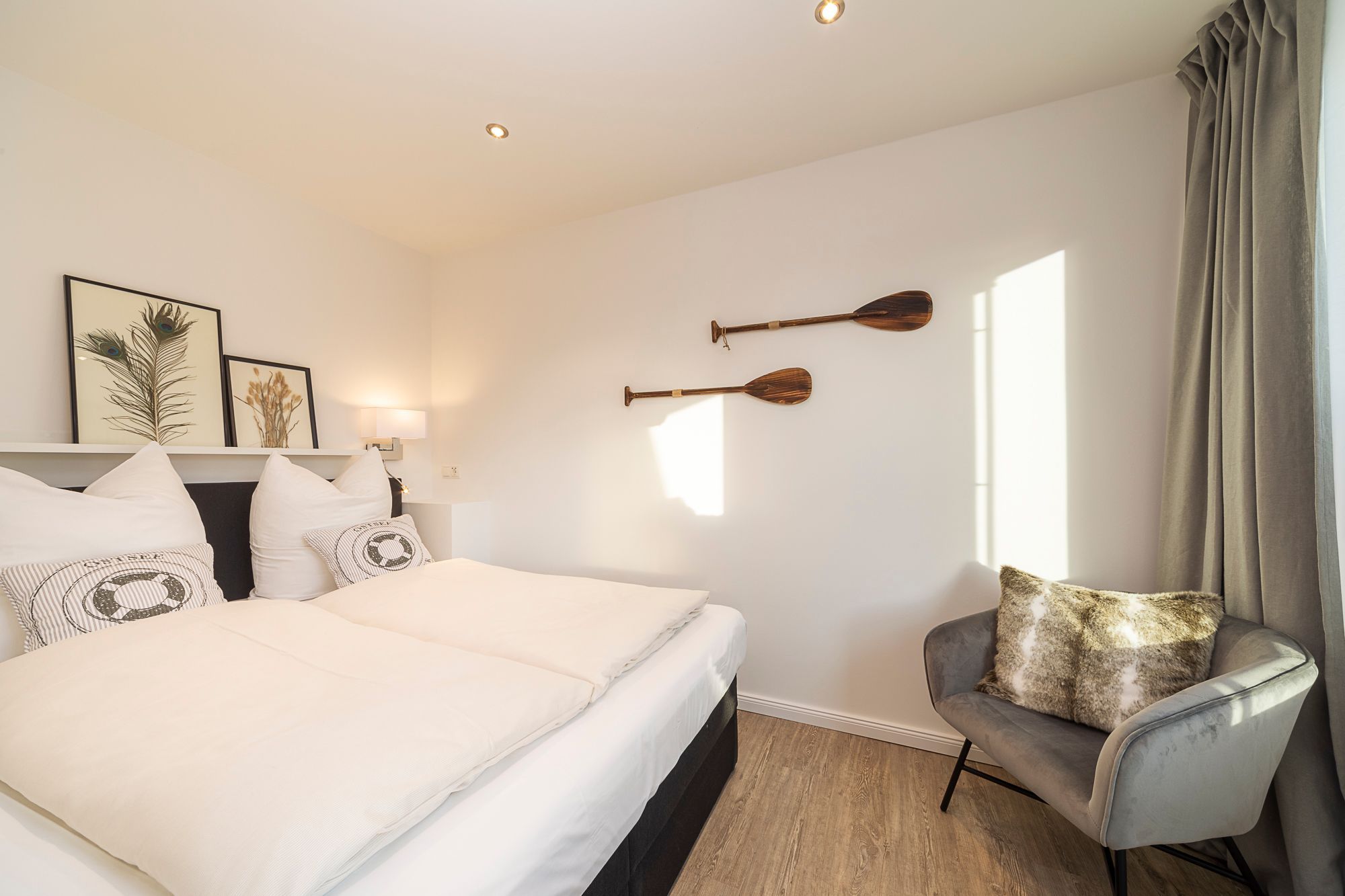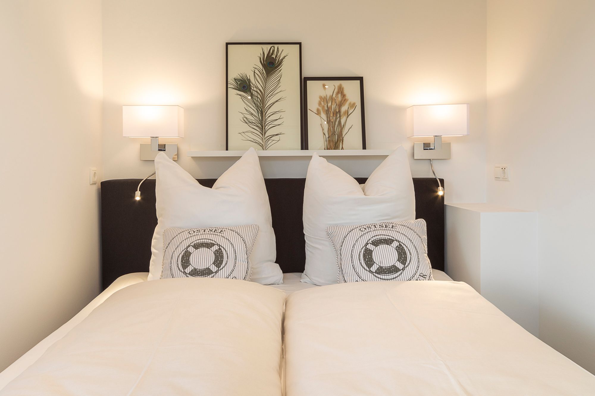 Flurbereich mit einem Einbauschrank. Großes Badezimmer mit begehbarer Dusche (1,80 x 0,90m), Kopf-/Regendusche sowie einer Sauna (bis 80 Grad), für bis zu drei Personen (canadisches Hemlocktannenholz, große Glasfront). Die sehr ansprechende Einbauküche lässt keine Wünsche offen: Spülmaschine, Nespresso-Maschine, Kaffeefiltermaschine, Toaster, Mixer, Pürierstab und vieles mehr sind vorhanden. Der gemütliche Essbereich ist für bis zu vier Personen geeignet. Hier finden Sie auch Platz für gesellige Spieleabende (Spielesammlung und Puzzle sind vorhanden). Der feine Wohnbereich ist mit einem bequemen Sofa ausgestattet, das in wenigen Handgriffen zu einem Schlafsofa/ Bettsofa (Liegefläche 1,60 x 2,00m, Federholzrahmen incl. Lattenrost und Matratze) umfunktioniert werden kann. Flach-TV 42, Radio mit Bluetooth-Lautsprecher und WLAN sind vorhanden. Vom Wohnzimmer aus gelangen Sie auf den Südbalkon. Hier warten ein Strandkorb sowie ein Tisch mit vier Stühlen auf Sie. Eine elektrische Markise spendet hier Schatten. Träumen mit Blick auf die Ostsee im Strandkorb liegt ihr Lieblingsbuch schon bereit? Das Schlafzimmer ist mit einem Boxspringbett ausgestattet. Zum Verdunkeln befinden sich Verdunklungsvorhänge an den Fenstern.