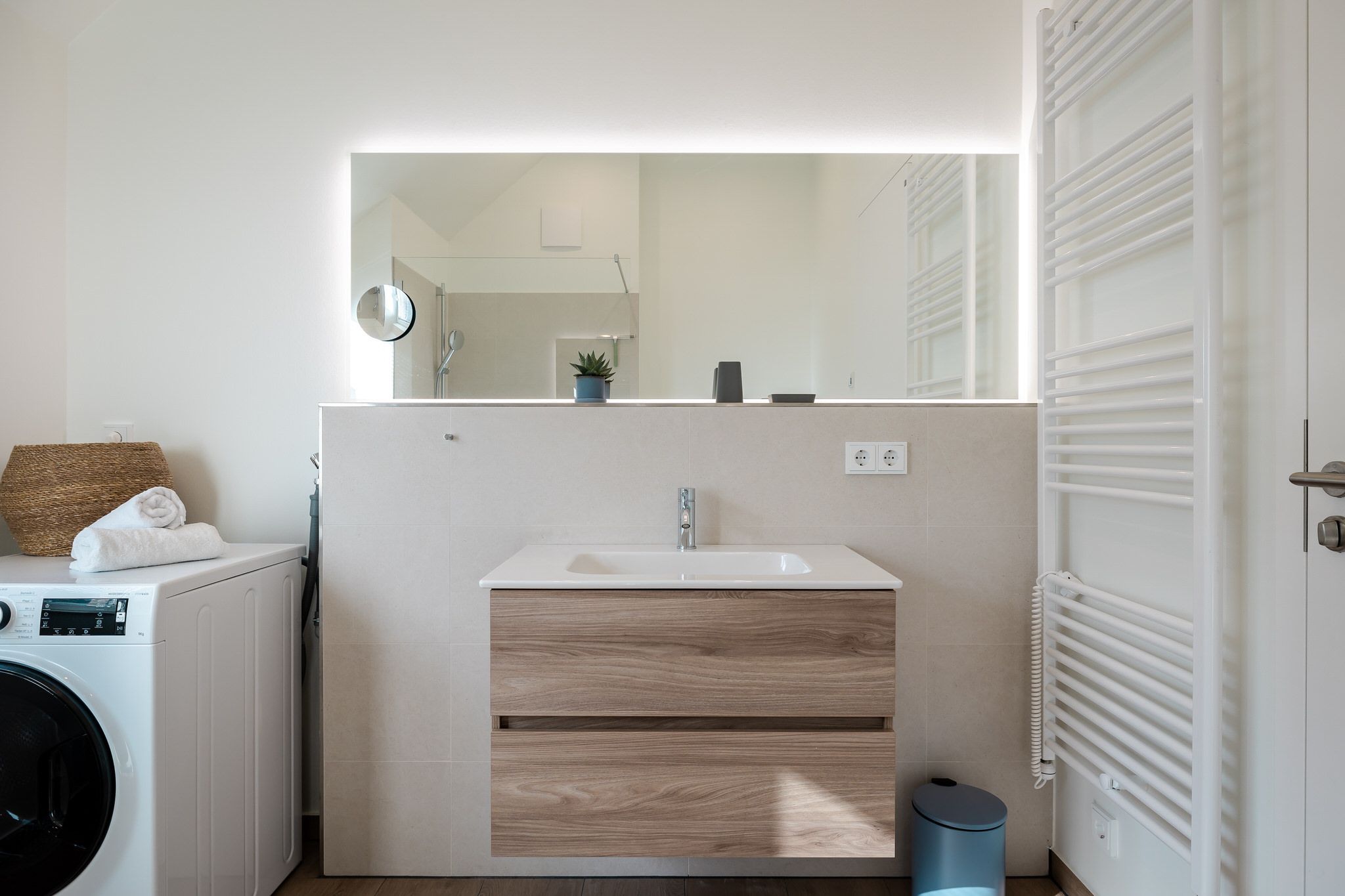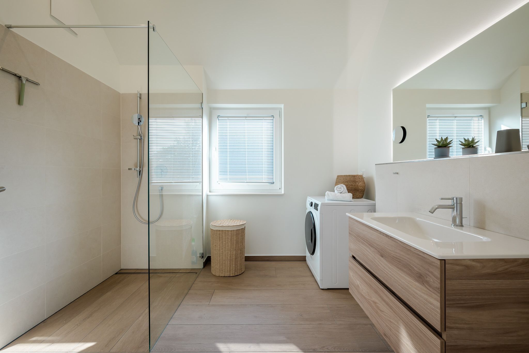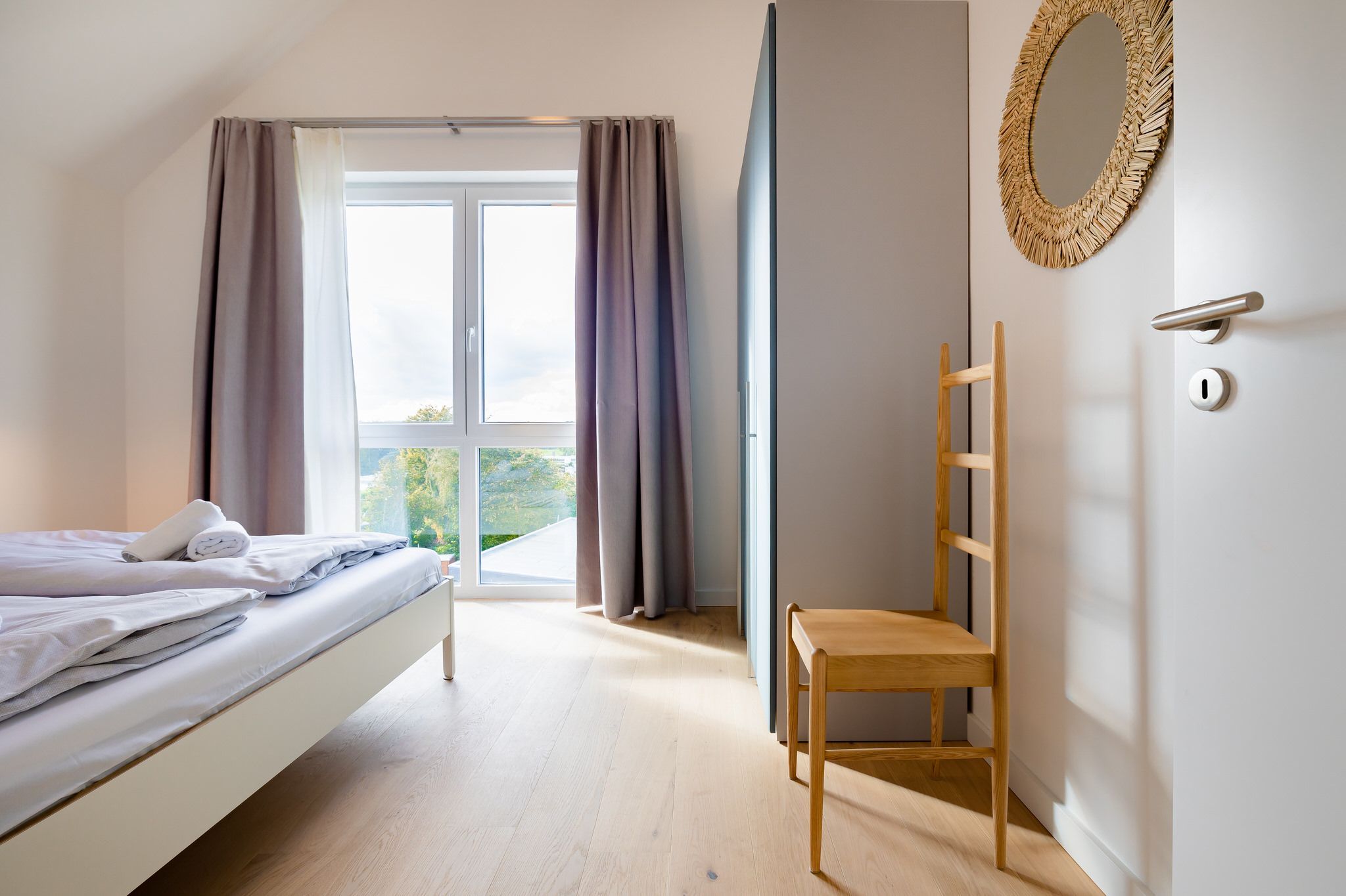 Über eine Treppe gelangen Sie in das Obergeschoss. Hier stehen Ihnen ein weiteres Schlafzimmer, ebenfalls mit Doppelbett (1,80 x 2,00m, Einzelmatratzen) und Kleiderschrank zur Verfügung. Ein Tageslichtbad mit bodengleicher Dusche, ein Handtuchheizkörper sowie eine Waschmaschine runden die Ausstattung ab. Außerdem ist auf dieser Ebene eine sehr schöne Galerie. Diese ist mit einem bequemen Sofa sowie einem Smart TV ausgestattet. Im Urlaub arbeiten