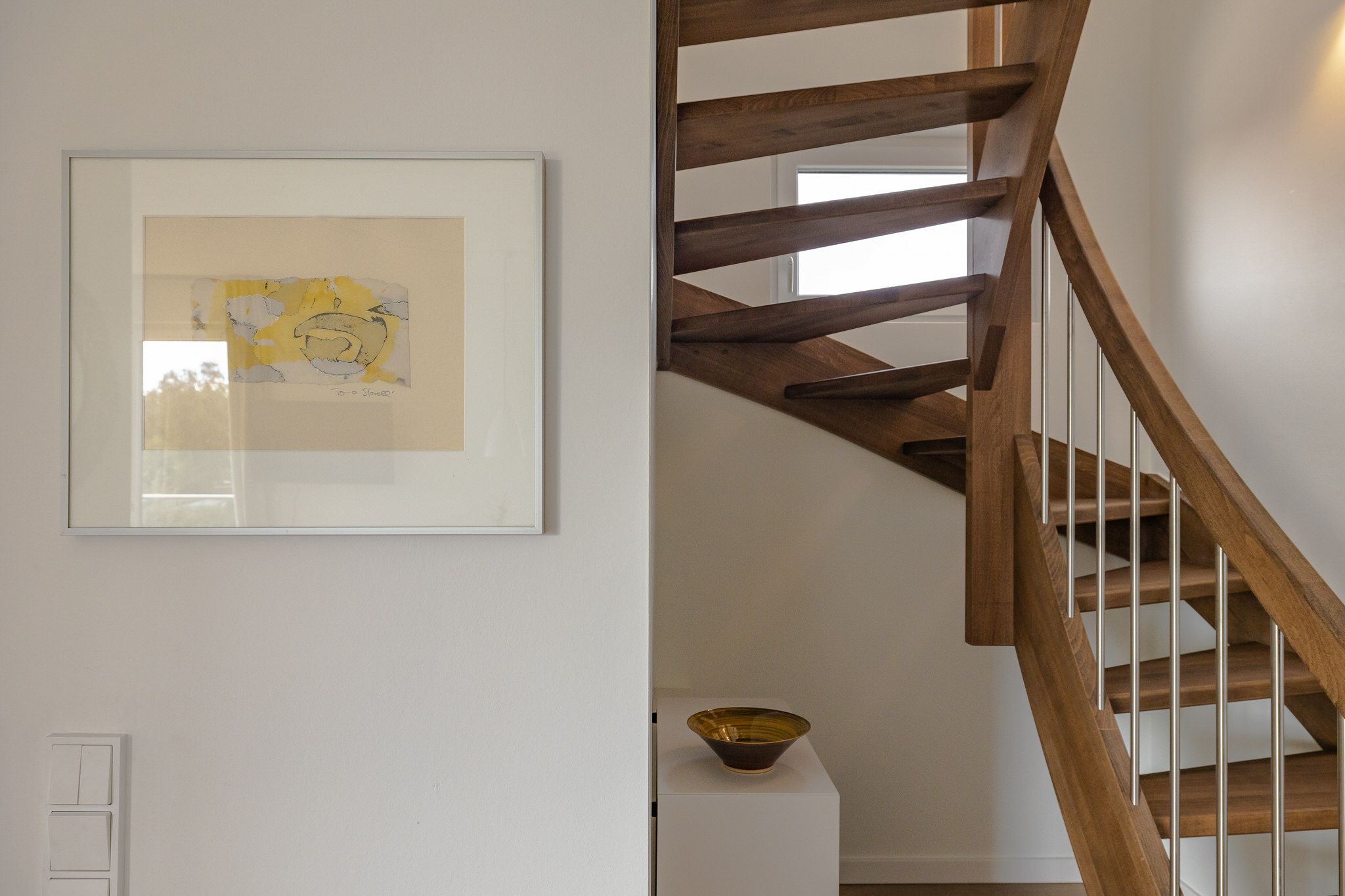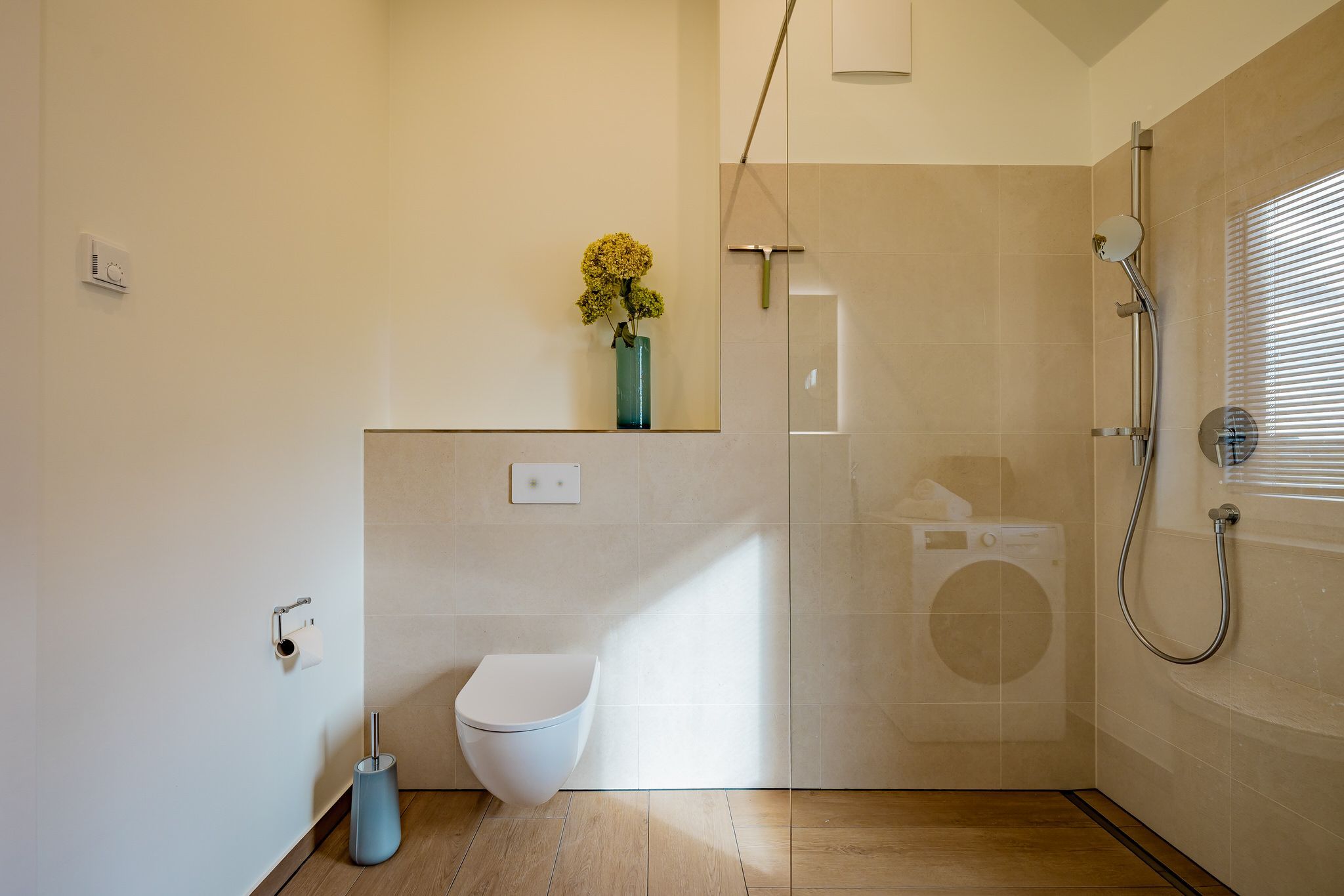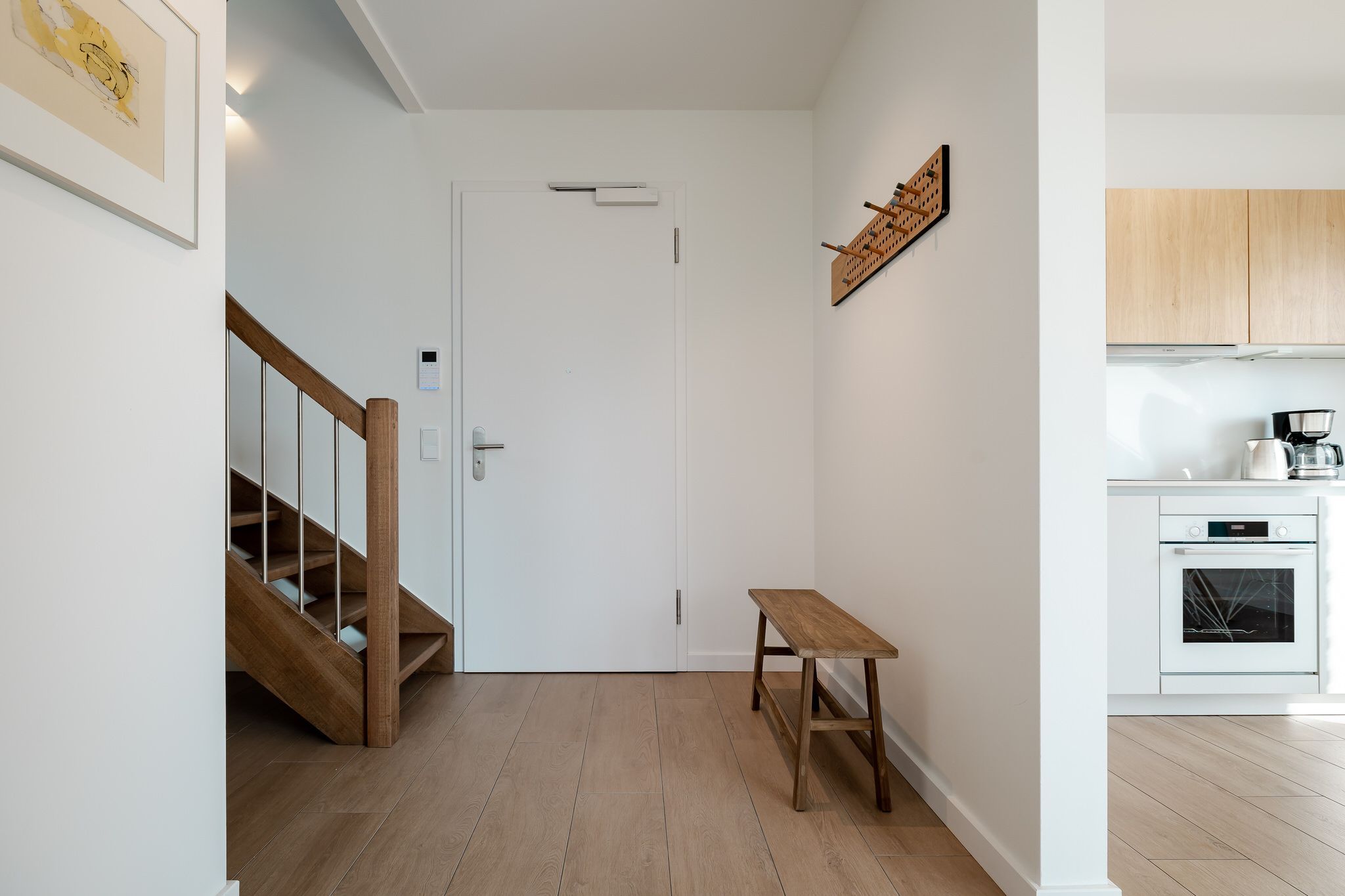 Über eine Treppe gelangen Sie in das Obergeschoss. Hier stehen Ihnen ein weiteres Schlafzimmer, ebenfalls mit Doppelbett (1,80 x 2,00m, Einzelmatratzen) und Kleiderschrank zur Verfügung. Ein Tageslichtbad mit bodengleicher Dusche, ein Handtuchheizkörper sowie eine Waschmaschine runden die Ausstattung ab. Außerdem ist auf dieser Ebene eine sehr schöne Galerie. Diese ist mit einem bequemen Sofa sowie einem Smart TV ausgestattet. Im Urlaub arbeiten