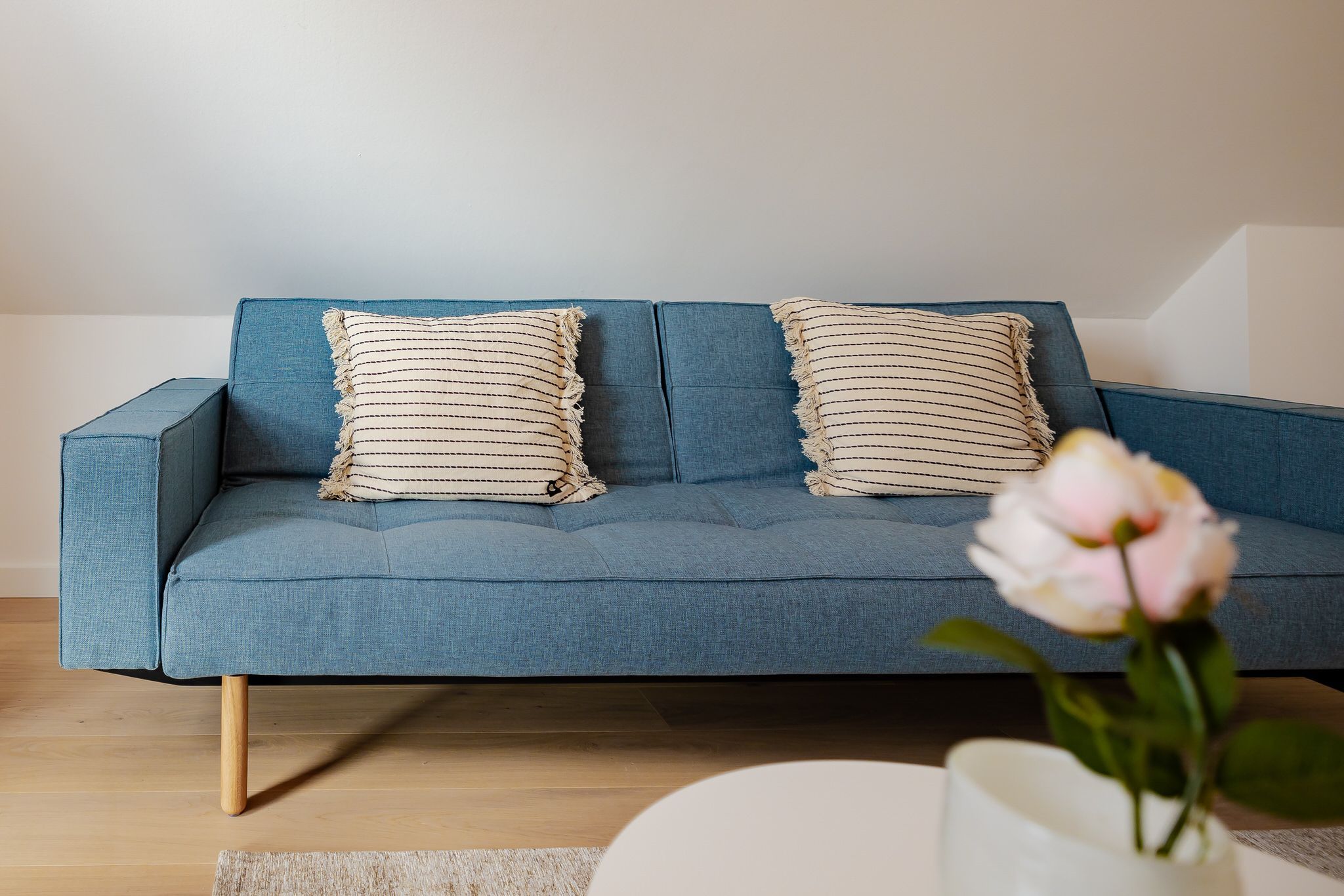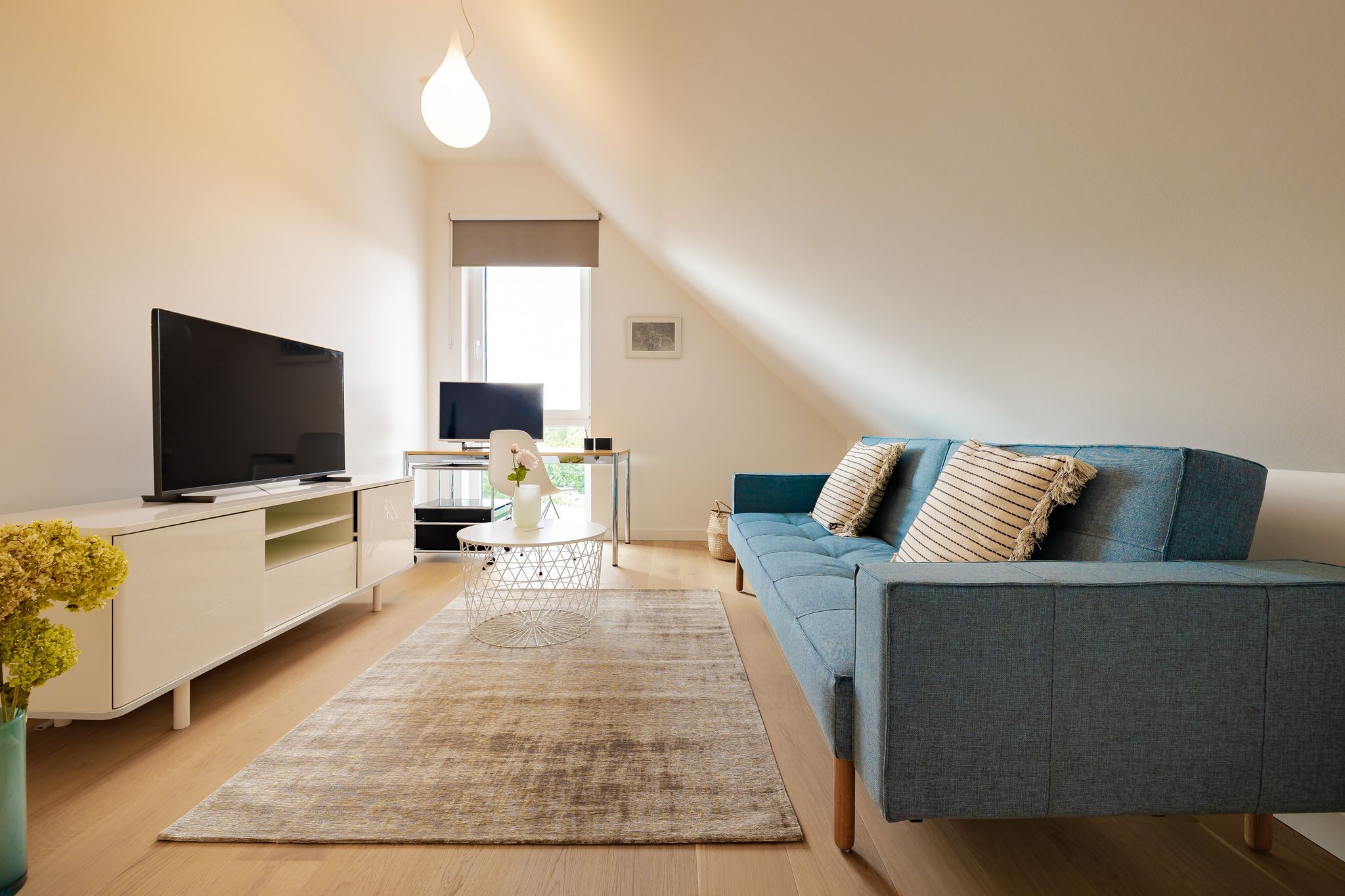 Über eine Treppe gelangen Sie in das Obergeschoss. Hier stehen Ihnen ein weiteres Schlafzimmer, ebenfalls mit Doppelbett (1,80 x 2,00m, Einzelmatratzen) und Kleiderschrank zur Verfügung. Ein Tageslichtbad mit bodengleicher Dusche, ein Handtuchheizkörper sowie eine Waschmaschine runden die Ausstattung ab. Außerdem ist auf dieser Ebene eine sehr schöne Galerie. Diese ist mit einem bequemen Sofa sowie einem Smart TV ausgestattet. Im Urlaub arbeiten … wenn es sein muss … hier steht Ihnen ein Schreibtisch zur Verfügung.