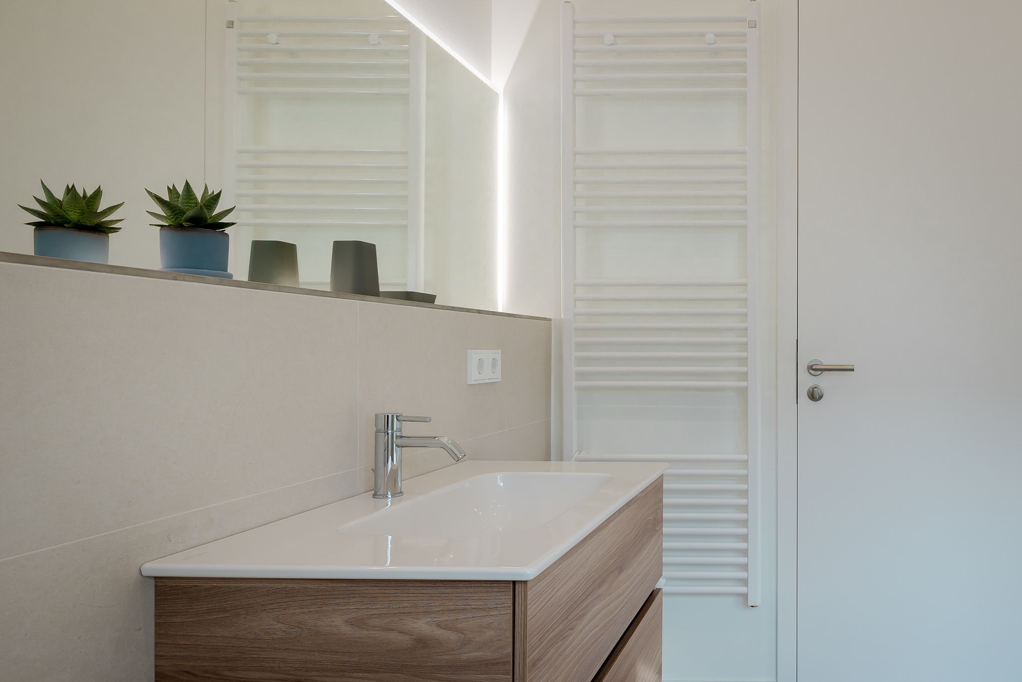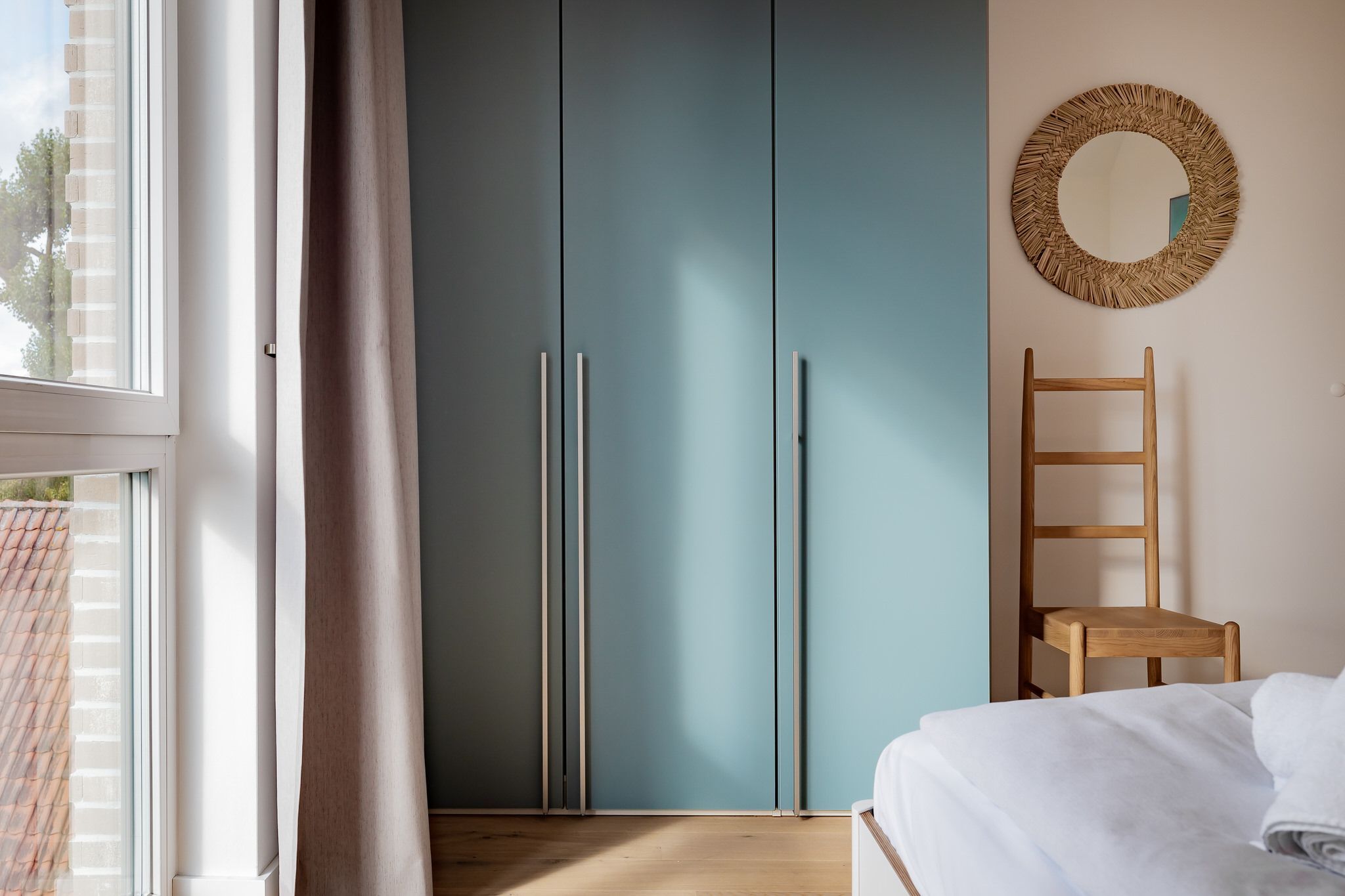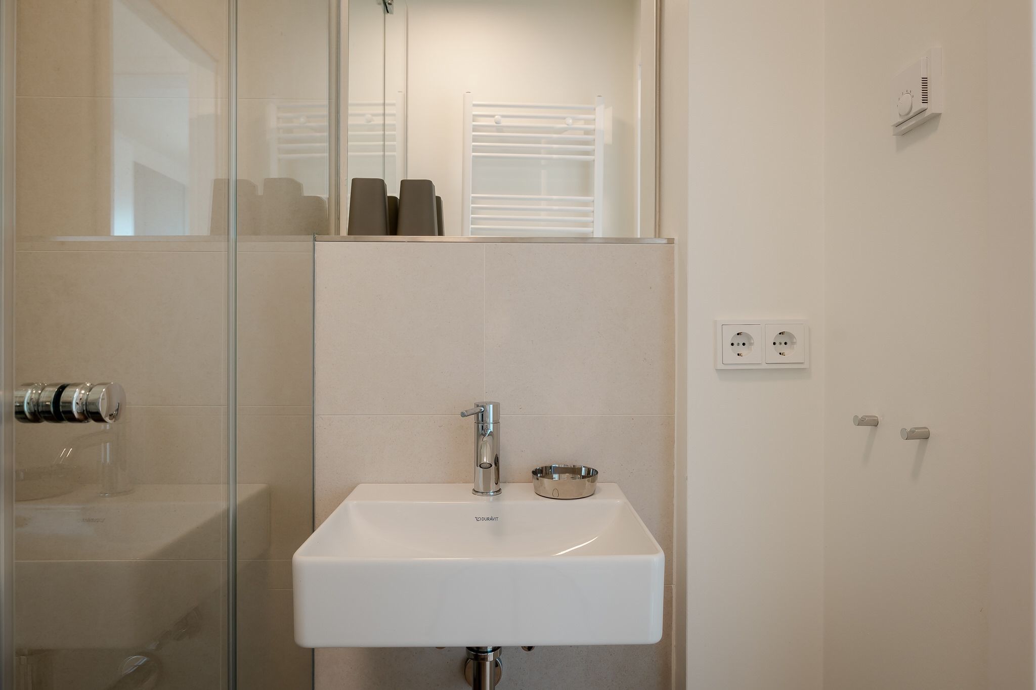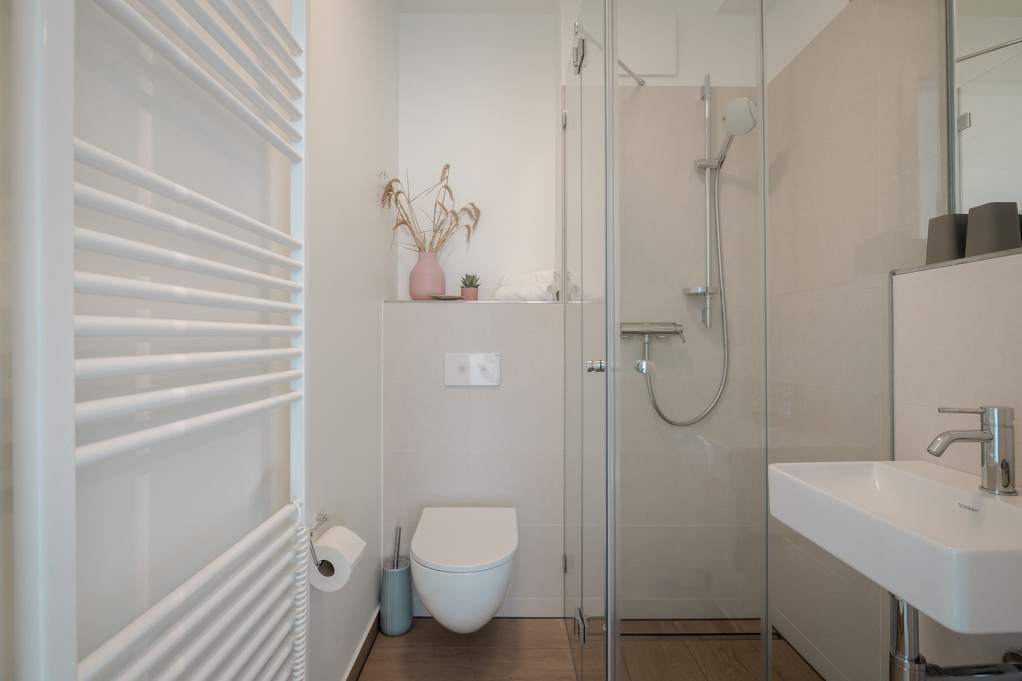 Das Duschbad im unteren Bereich ist in heller Optik gehalten, mit einem Handtuchheizkörper und einer bodengleichen Dusche. Das Schlafzimmer hat ein Doppelbett (1,80 x 2,00m, Einzelmatratzen) sowie einen großem Kleiderschrank. Die Vorhänge verdunkeln das Schlafzimmer.