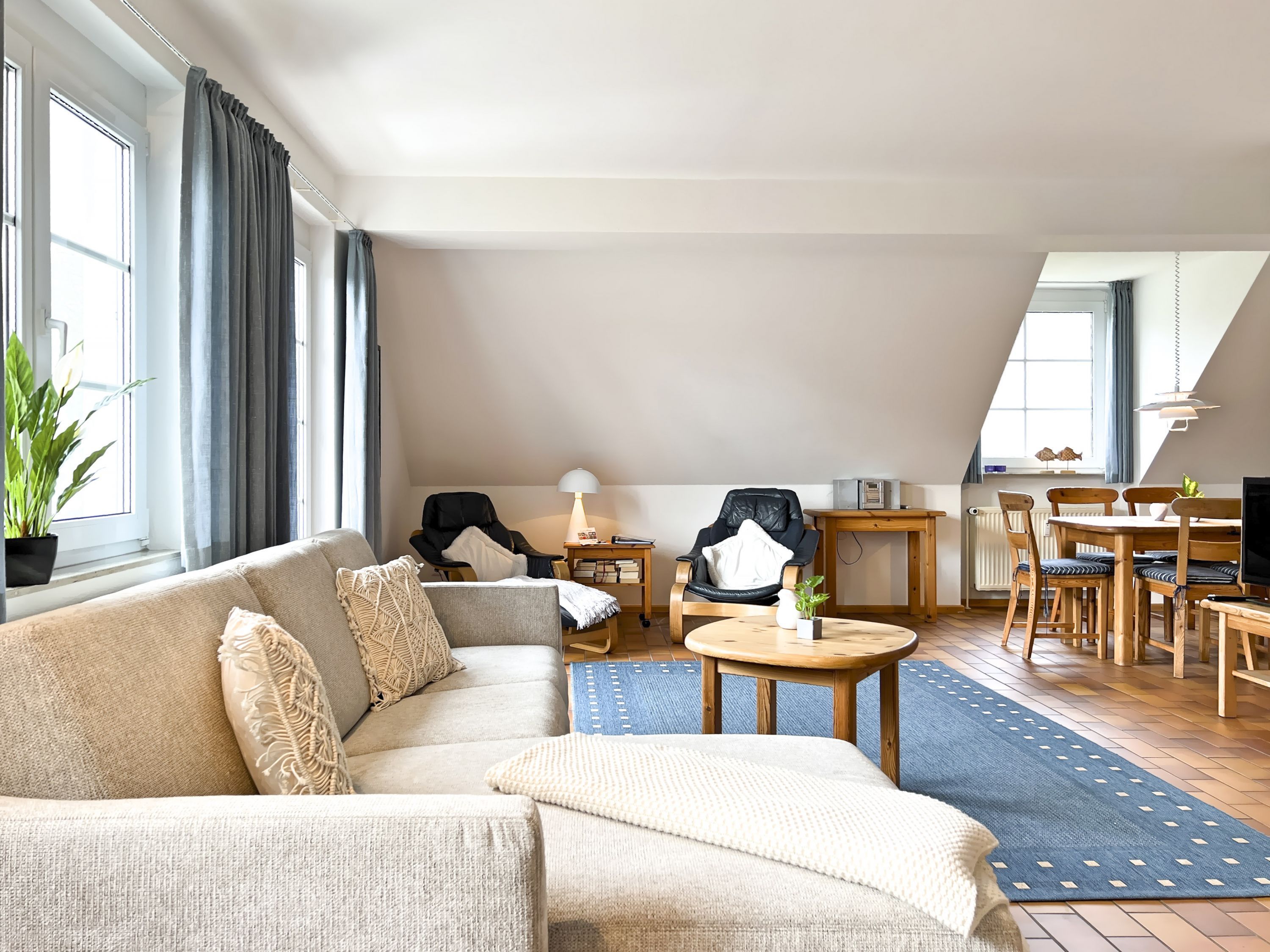 • Küche und Essbereich: Voll ausgestattete Küchenzeile mit Geschirrspüler, Kühlschrank, Filterkaffeemaschine, Toaster und Wasserkocher. Die angrenzende Essgruppe lädt zu geselligen Mahlzeiten ein.