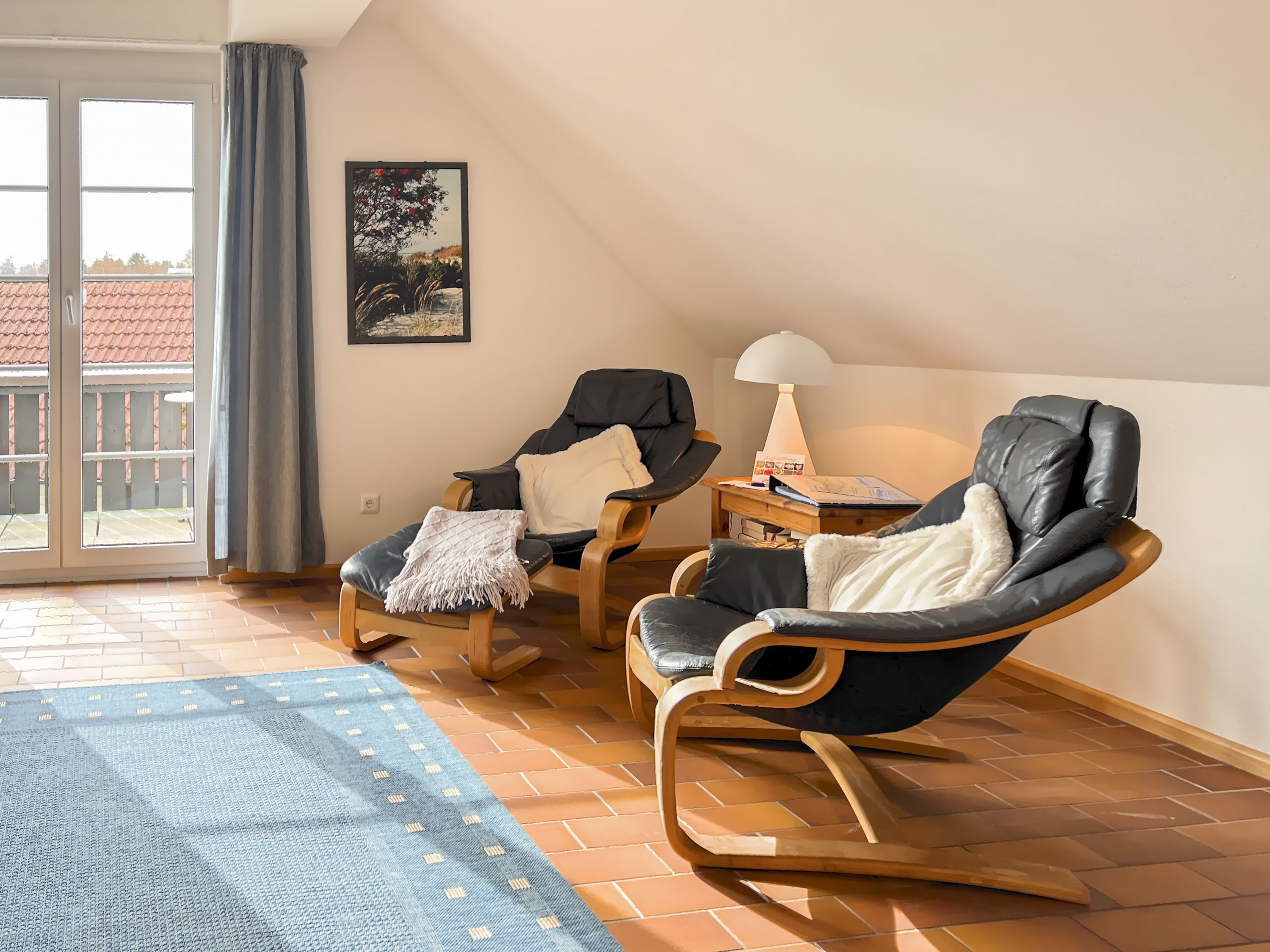 • Balkon: Idyllischer Balkon mit Gartenblick und Sonnenschirm, ideal zum Entspannen und Genießen der frischen Ostseeluft.