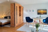 • Wohnbereich: Heller Wohnraum mit Sitzgruppe, Flachbild-TV, Radio und CD-Player