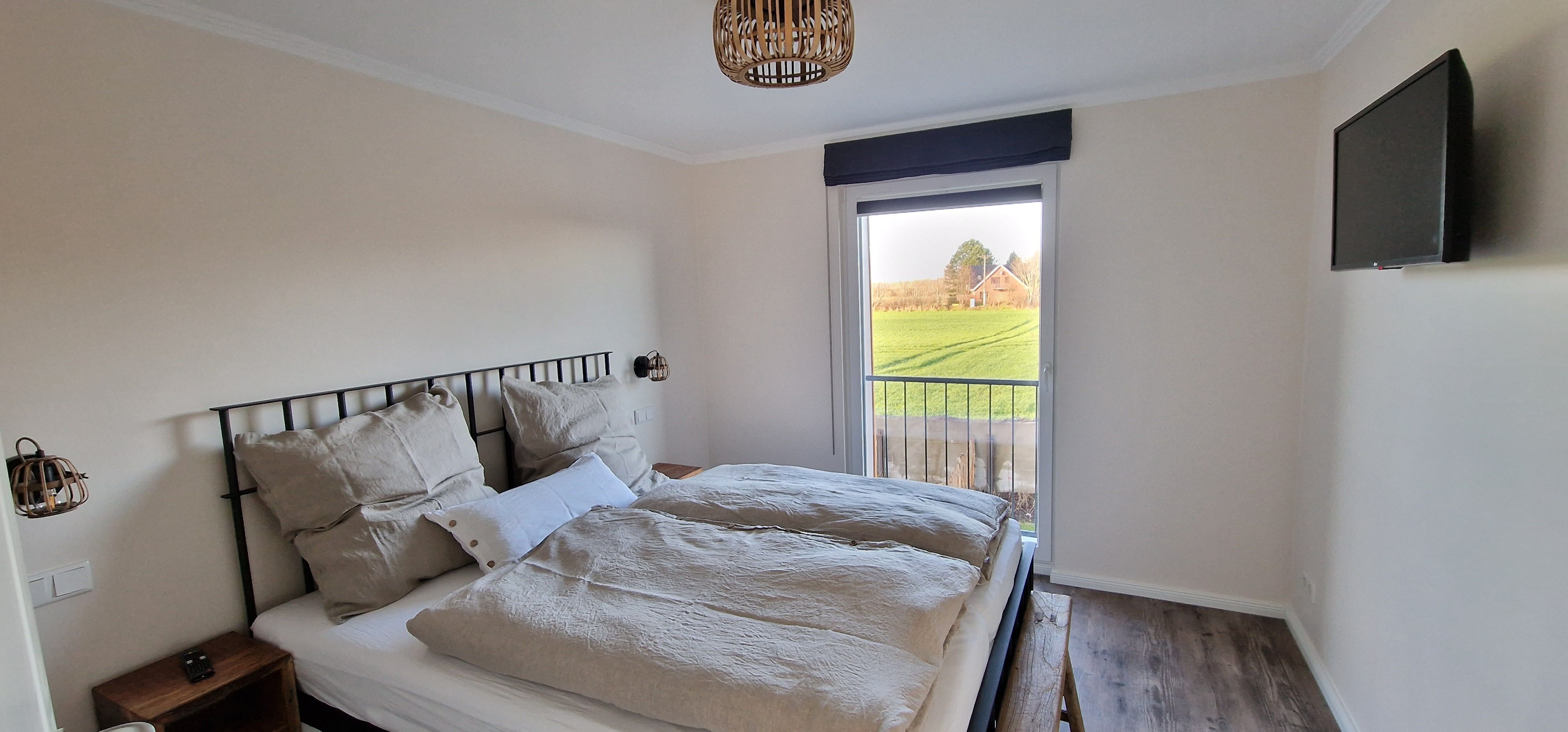 - Schlafzimmer mit großem französischen Bett (160x200), verstellbaren Lattenrosten und TV; Verdunklungs-