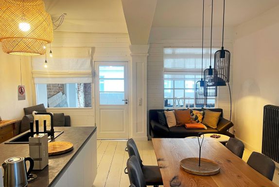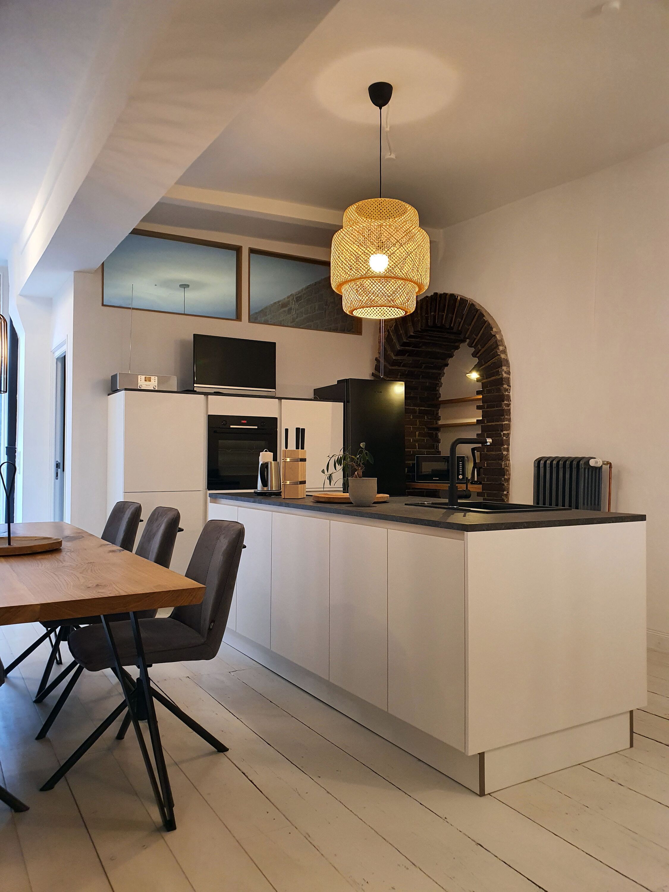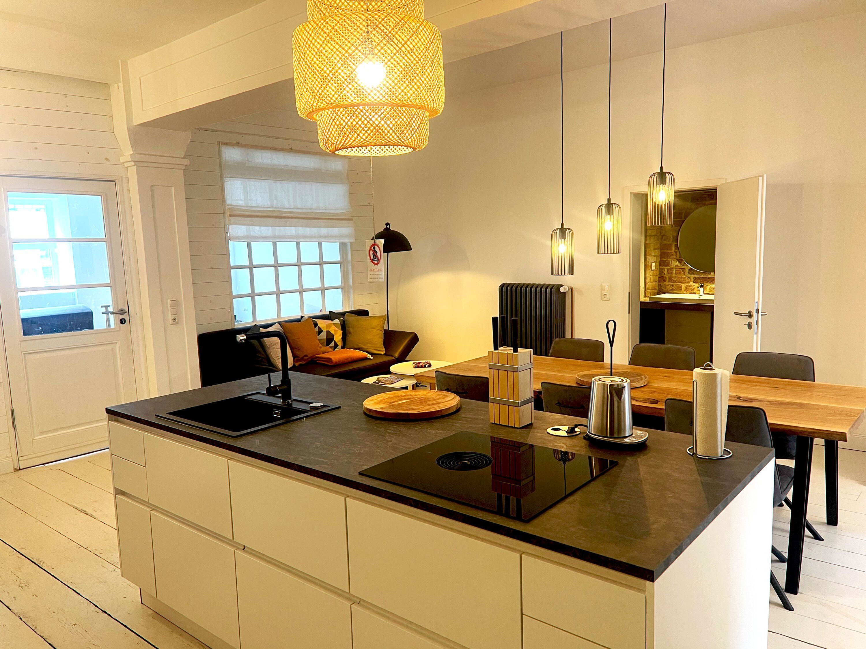 - offene Küche ausgestattet mit Geschirrspüler, Backofen, Induktionsherd, Kühlschrank, Kaffeemaschine, Wasserkocher, Geschirr, Besteck, Gläser uvm.