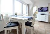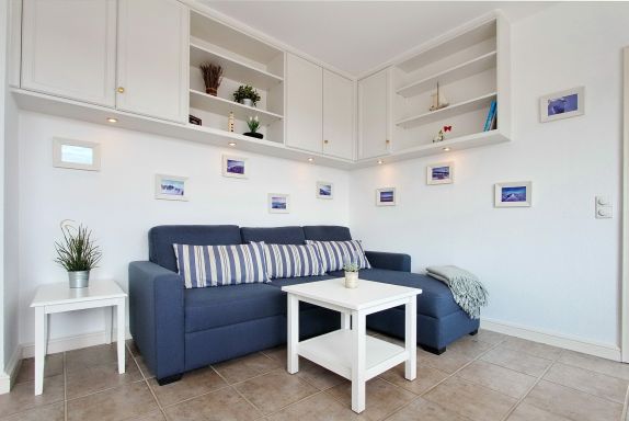 Hell und freundlich eingerichtete Zweizimmerwohnung im Haus Margaretheneck in der 3. Etage im Haus Margaretheneck mit vorgelagertem Südbalkon. Wenn die Sonne scheint, können Sie hier auf Teakholzmöbeln wunderbar entspannen und das Meer ist so nah, dass sie ein klitzekleines Stück sehen und es auf jeden Fall hören können. Im lichtdurchfluteten Wohnzimmer gibt es eine große Eckcouch mit Schlaffunktion, einen Essplatz am Fenster mit 4 Stühlen, sowie eine Kommode und einen Einbauschrank. Stauraum für Ihre persönlichen Dinge ist ausreichend vorhanden. In der ganzen Wohnung wurden helle Fliesen verlegt. Das Schlafzimmer verfügt über 2 Einzelbetten (auseinander stehend) und eine Kommode sowie einen Sessel. In der separaten Küche mit Geschirrspüler, zusätzlicher Nespressomaschine und Backofen können sie sich selbst verpflegen. Im Badezimmer gibt es eine Badewanne, einen Badezimmerhocker und einen mobilen Haltegriff, der für mehr Sicherheit beim Ein- und Aussteigen sorgt. Fön und Kosmetikspiegel sind ebenfalls vorhanden. Zur technischen Ausstattung gehört ein Flachbildfernseher und ein Bose Radio. Vierbeinige Sylturlauber sind herzlich willkommen. Wohnungsgröße: ca. 48 m².