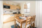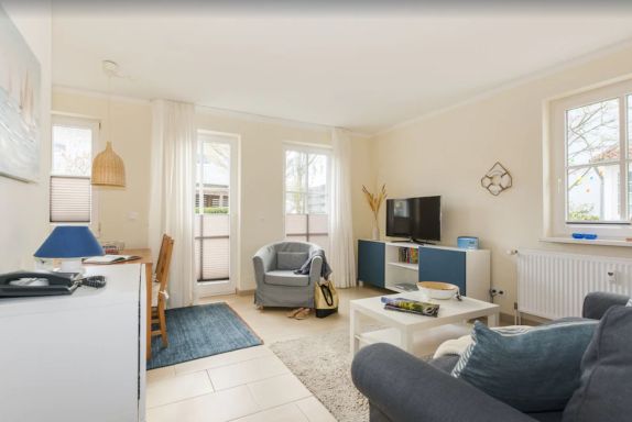 Das moderne, helle 2-Zimmer-Appartement Nr. 237 liegt im Erdgeschoss mit einer kleinen Terrasse inkl. Strandkorb und Gartenmöbel in Richtung Süden. Die zwei Räume sind optimal aufgeteilt und bieten ausreichend Platz für 2 bis 4 Feriengäste. Der gemütliche, helle Essplatz für vier Personen verbindet das Wohnzimmer mit der offenen Küche, die mit Mikrowelle, Geschirrspüler, Wasserkocher, Kaffeemaschine, Toaster und sogar eigenem Mini-Backofen überdurchschnittlichen Komfort garantiert. Das großzügige Schlafzimmer bietet ein komfortables Doppelbett (1,80 x 2,00 m) und dem modernen Flatscreen-TV.