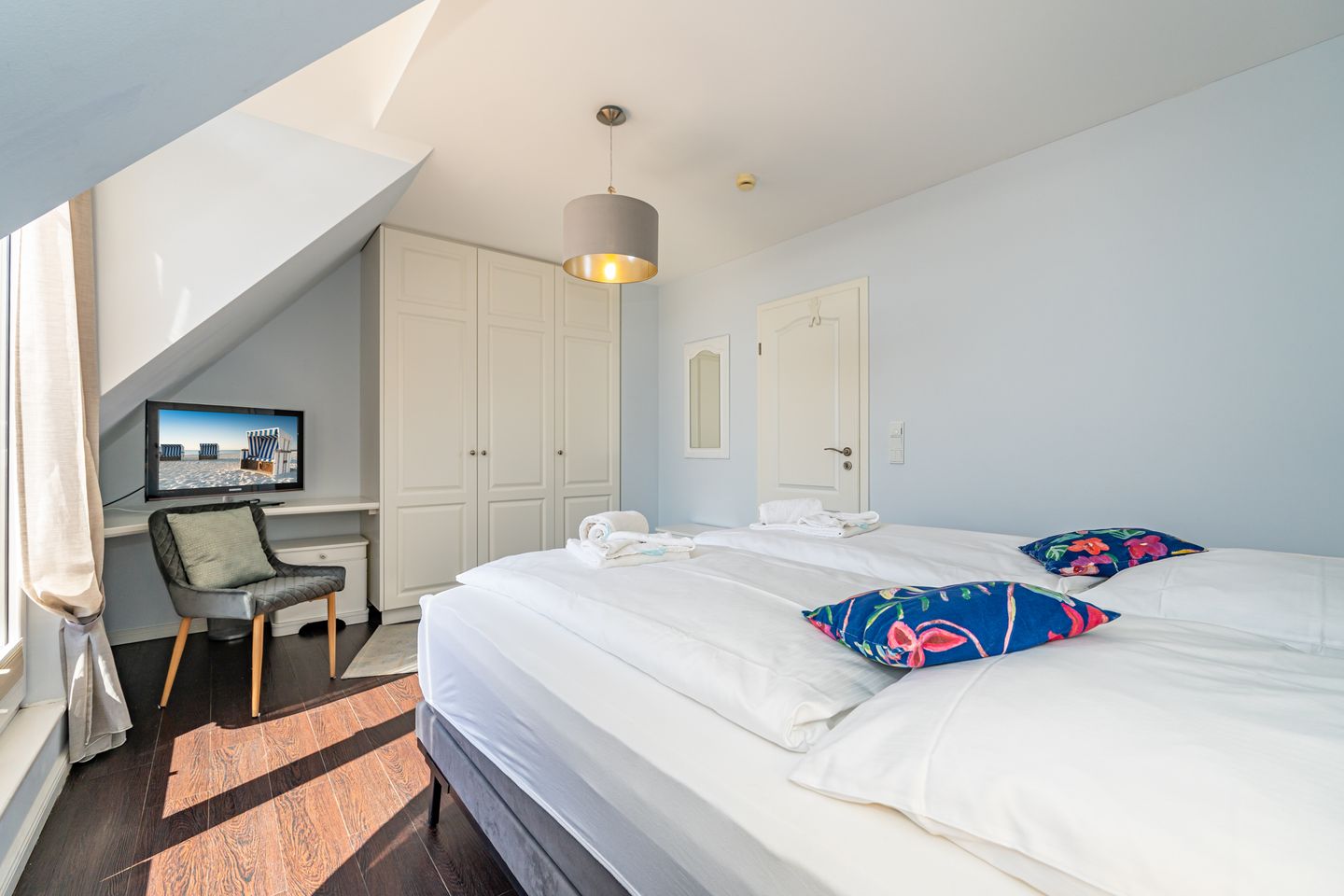 Ab sofort ist das Ferienhaus Charlotte nur noch für 4 Personen buchbar. Alle bestehenden Buchungen bleiben wie gebucht bestehen und werden so wie gebucht durchgeführt. Im EG befinden sich der helle Wohn-/Essbereich mit Fußbodenheizung, Flachbild-TV und direktem Zugang zur Südterrasse. Diese ist ausgestattet mit Sylter Strandkorb und Gartenmöbeln (saisonal). Im Erdgeschoss befindet sich ebenfalls ein Badezimmer mit WC, bodentiefer Dusche und Waschtrockner. Sowie eine separate Küche mit Backofen Geschirrspüler, Cerankochfeld und Mikrowelle. Ein Schlafzimmer mit Doppelbett, Flachbild-TV und Balkon und ein weiteres Schlafzimmer mit zwei Einzelbetten, sowie das angrenzende helle, Duschbad befinden sich im Obergeschoss. Das Dachgeschoss verfügt über ein weiteres Schlafzimmer mit Doppelbett. Es steht Ihnen kostenfreies WLAN sowie kostenfreie Telefonate ins deutsche Festnetz zur Verfügung. Ein Parkplatz sowie ein Fahrradständer stehen Ihnen vor dem Haus zur Verfügung. Tiere sind in diesem Haus nicht erlaubt.