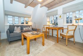 Wenn Sie die Wohnungstür öffnen, gelangen Sie direkt in den charmanten Wohn- / Essbereich mit Flachbildfernseher, Blue-Ray-Player, Stereoanlage, Schlafsofa und der weißen offenen Küche die mit einer Nespresso Maschine, Cerankochfeld, Backofen, Mikrowelle, Kühlschrank und Spülmaschine ausgestattet ist.