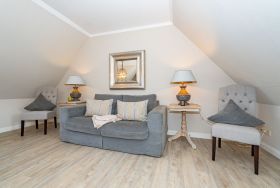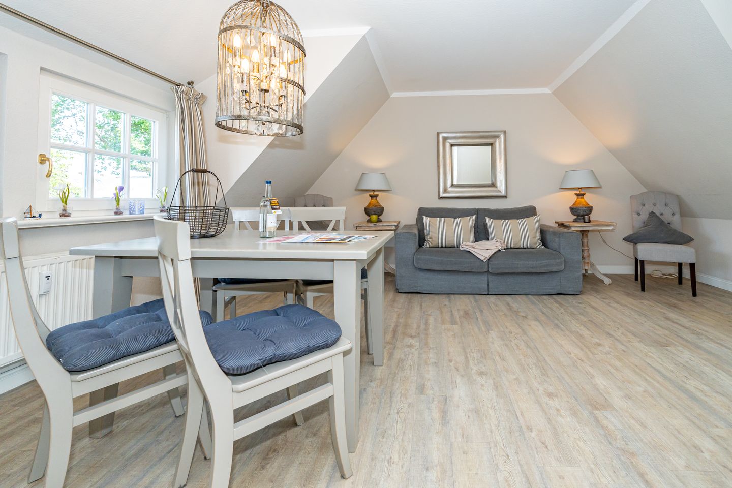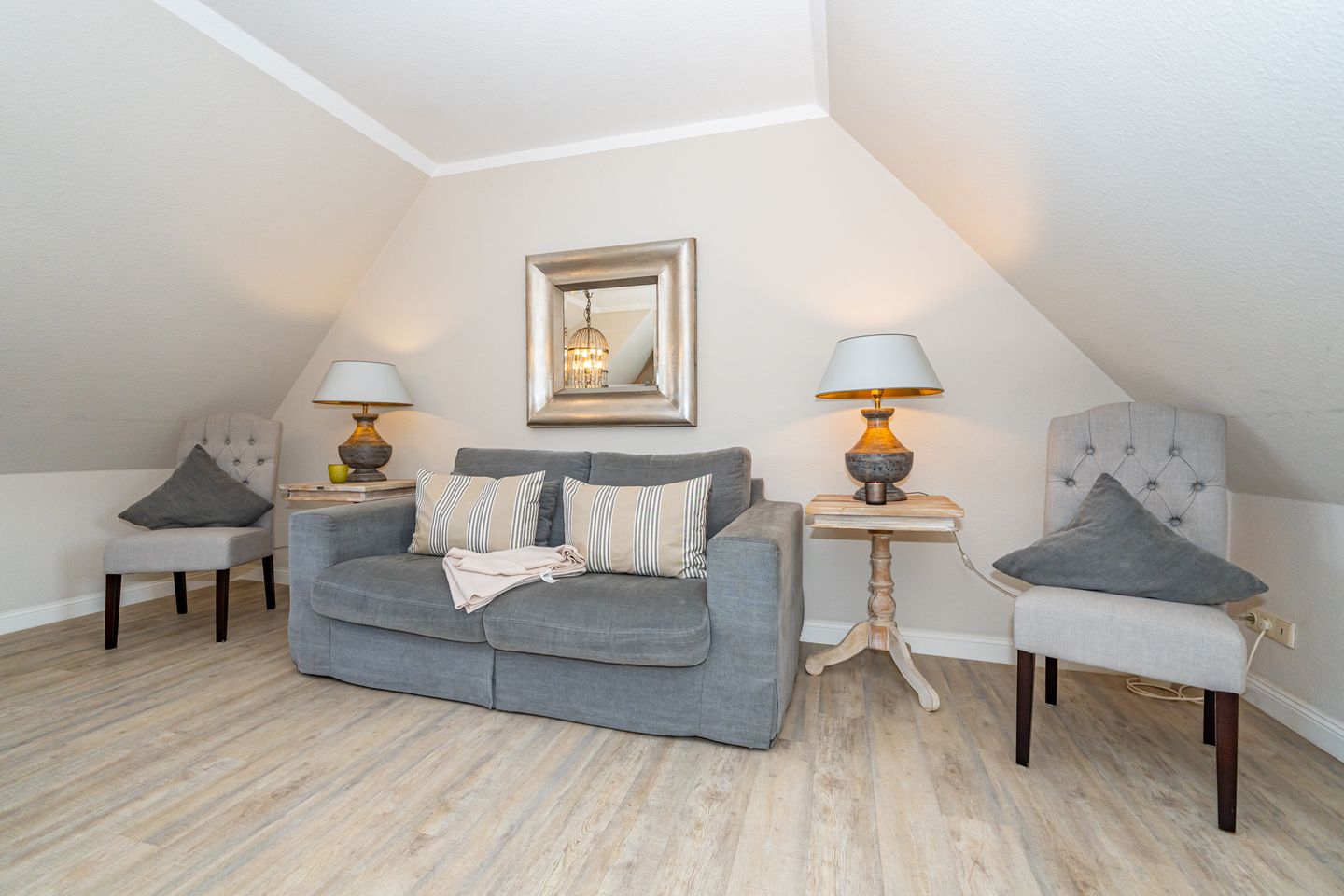 Diese 2-Zimmer-Ferienwohnung Roseneck (ca. 45 qm, im 1. OG) befindet sich im schönen Alt-Westerland und bietet Platz für bis zu zwei Personen. Durch ihre Dachschrägen hat sie einen ganz besonderen Charme. Die offen gestaltete, kleine Pantryküche (Nespresso, Cerankochfeld, Spülmaschine, Filterkaffeemaschine) grenzt an den Esstisch mit Stühlen. Das helle Wohnzimmer verfügt über ein Sofa und TV. Das Bad (ebenfalls mit Schrägen) verfügt über eine Wannen-Dusch-Kombination. Im kleinen Schlafzimmer sind ein Doppelbett (160 x 200 cm) und weiße Einbauschränke vorhanden. Zu dieser Ferienwohnung gehören eine Sonnenkuhle und ein Pkw-Stellplatz, direkt hinter dem Haus. Bitte beachten Sie, dass dies eine Nichtraucherwohnung ist und es kein WLAN gibt.