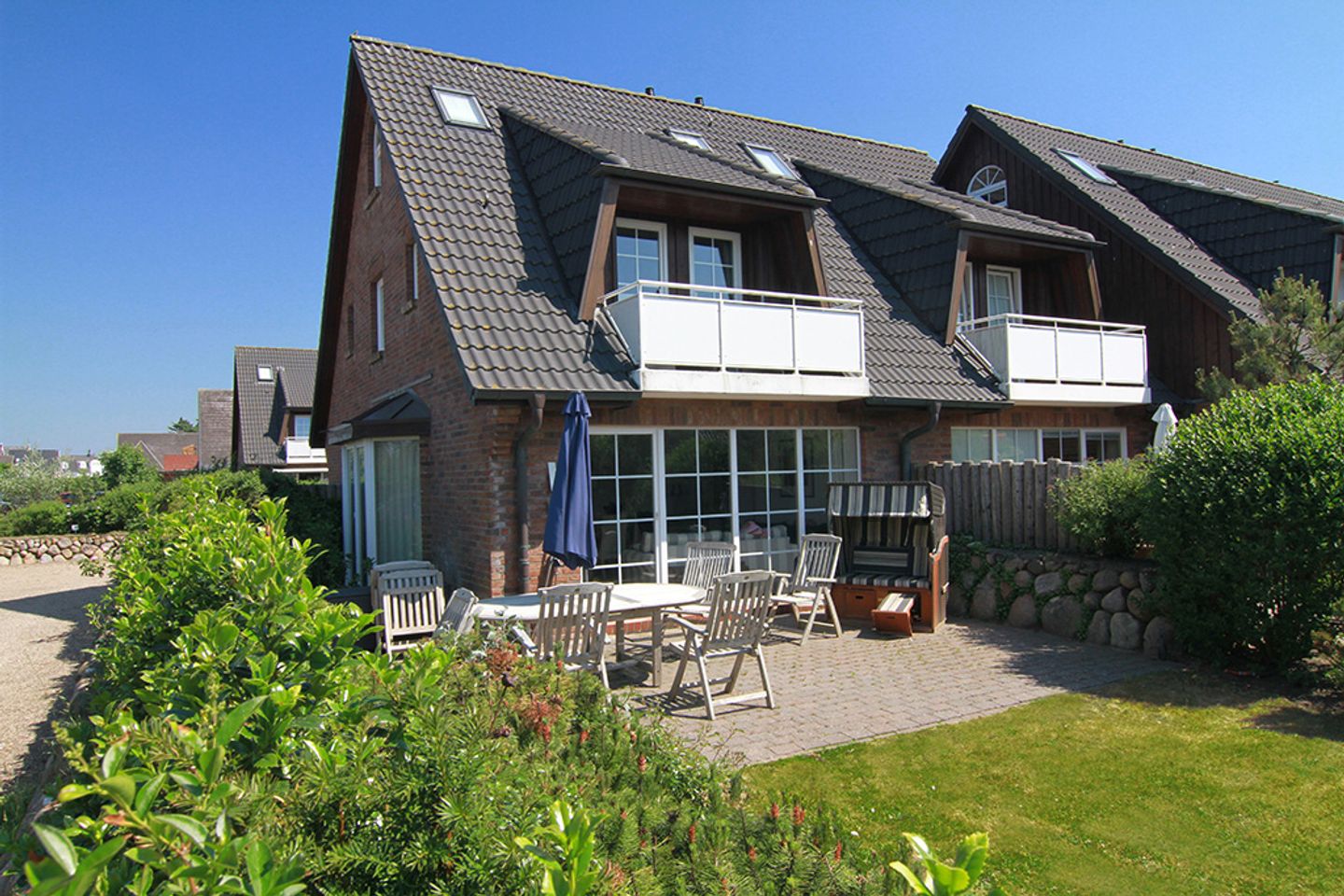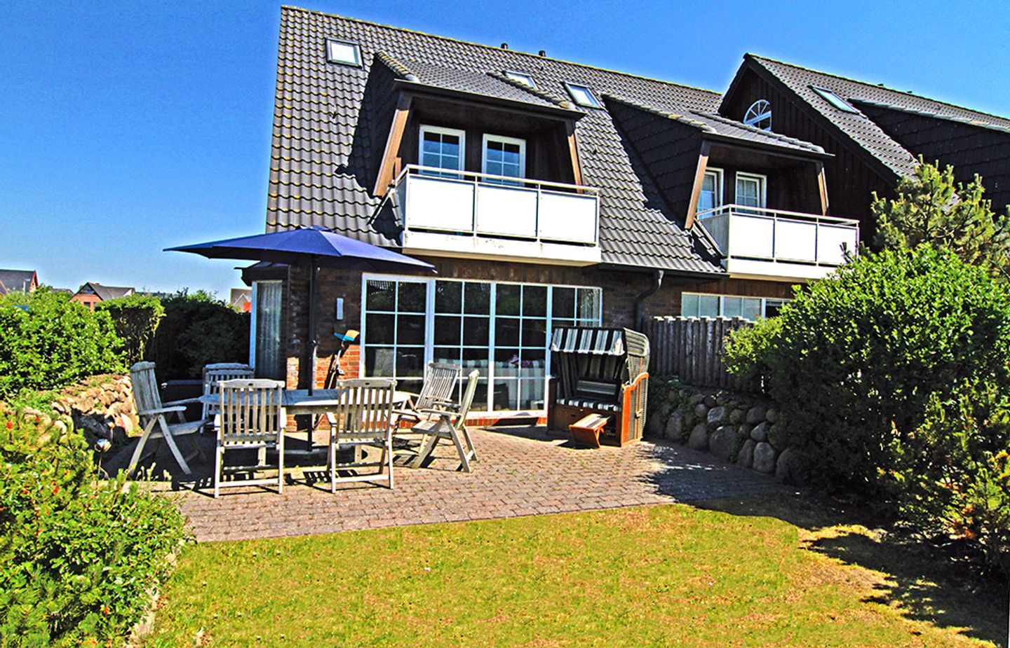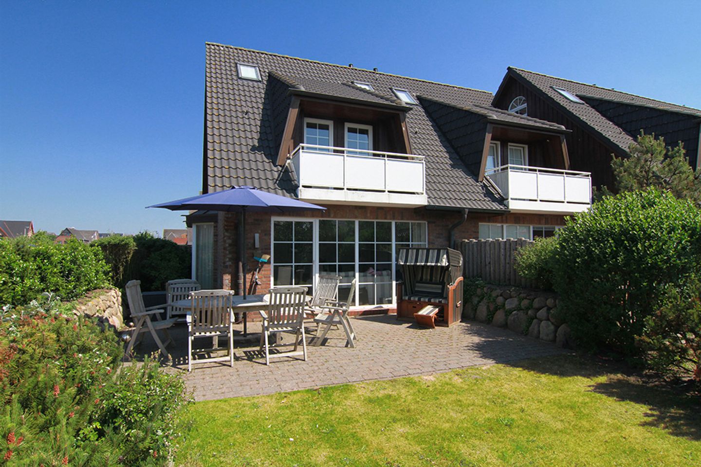 Vom Eingangsbereich mit Garderobe gelangen Sie in das lichtdurchflutete und großzügige Wohn- / Esszimmer mit zwei einladenden großen Sofas, Flatscreen, DVD-Player, Stereoanlage und Essecke. Von hier haben Sie Zutritt zur Süd-Terrasse mit Garten und Bestuhlung. Hier können Sie im vorhandenen Sylter Strandkorb bei einem Glas Wein den Sonnenuntergang genießen. Im Erdgeschoss liegen zudem das Duschbad mit WC, die separate, vollausgestattete Küche (Spülmaschine, Backofen, Ceranfeld, Kühlgefrierkombi, Nespresso-Maschine) und ein Hauswirtschaftsraum mit Waschmaschine & Trockner. Über die Treppe gelangen Sie ins 1. OG, wo Sie zwei Schlafzimmer mit je einem Doppelbett (180 x 200 cm) und Flatscreen vorfinden. Das Schlafzimmer Richtung Süden, verfügt zudem über einen herrlich sonnigen Balkon mit passenden Möbeln.