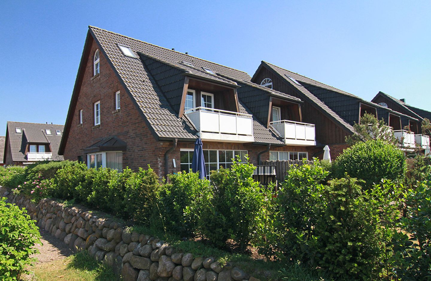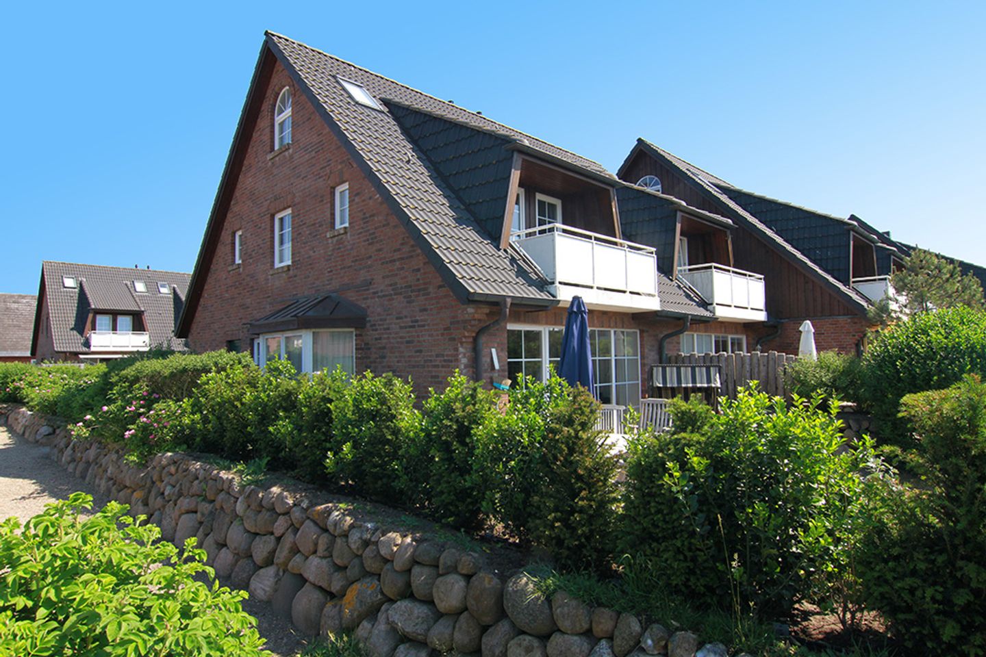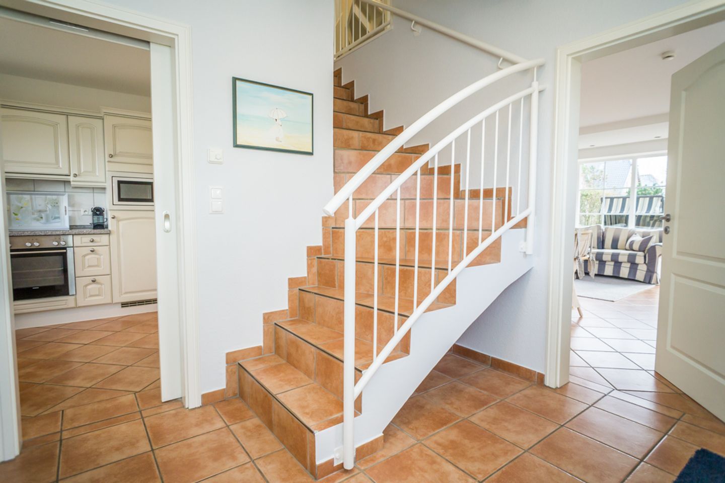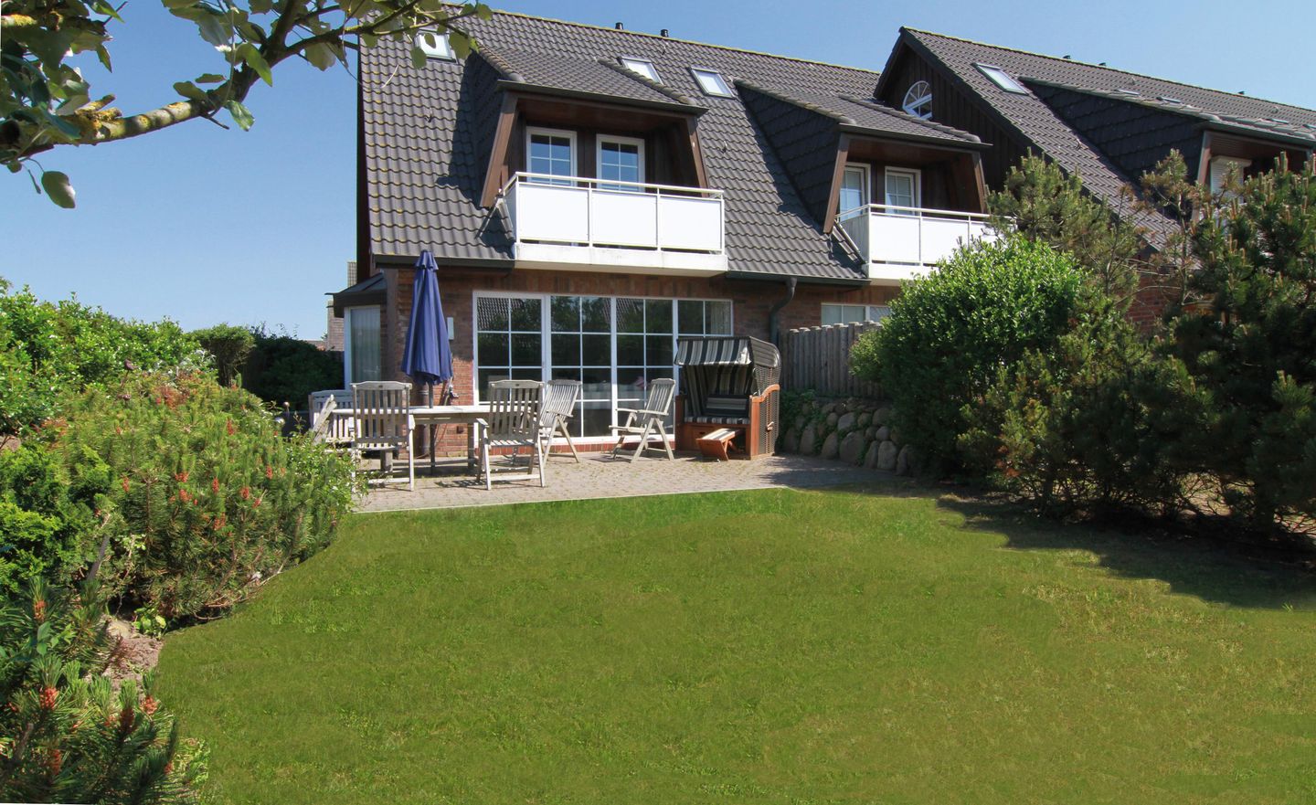 Vom Eingangsbereich mit Garderobe gelangen Sie in das lichtdurchflutete und großzügige Wohn- / Esszimmer mit zwei einladenden großen Sofas, Flatscreen, DVD-Player, Stereoanlage und Essecke. Von hier haben Sie Zutritt zur Süd-Terrasse mit Garten und Bestuhlung. Hier können Sie im vorhandenen Sylter Strandkorb bei einem Glas Wein den Sonnenuntergang genießen. Im Erdgeschoss liegen zudem das Duschbad mit WC, die separate, vollausgestattete Küche (Spülmaschine, Backofen, Ceranfeld, Kühlgefrierkombi, Nespresso-Maschine) und ein Hauswirtschaftsraum mit Waschmaschine & Trockner. Über die Treppe gelangen Sie ins 1. OG, wo Sie zwei Schlafzimmer mit je einem Doppelbett (180 x 200 cm) und Flatscreen vorfinden. Das Schlafzimmer Richtung Süden, verfügt zudem über einen herrlich sonnigen Balkon mit passenden Möbeln.