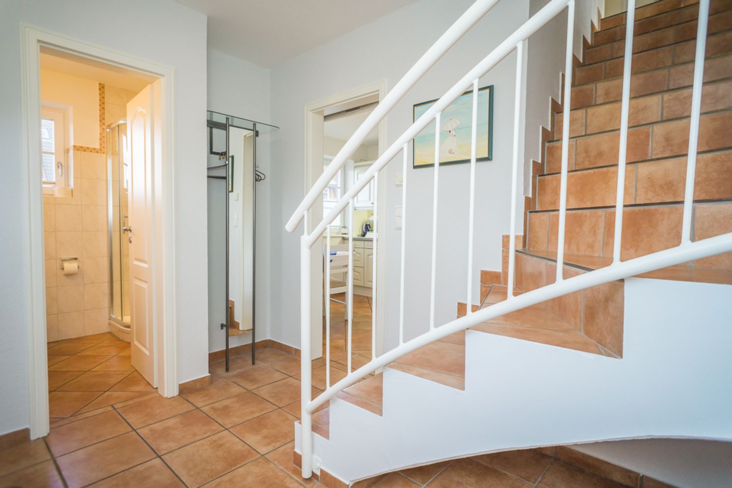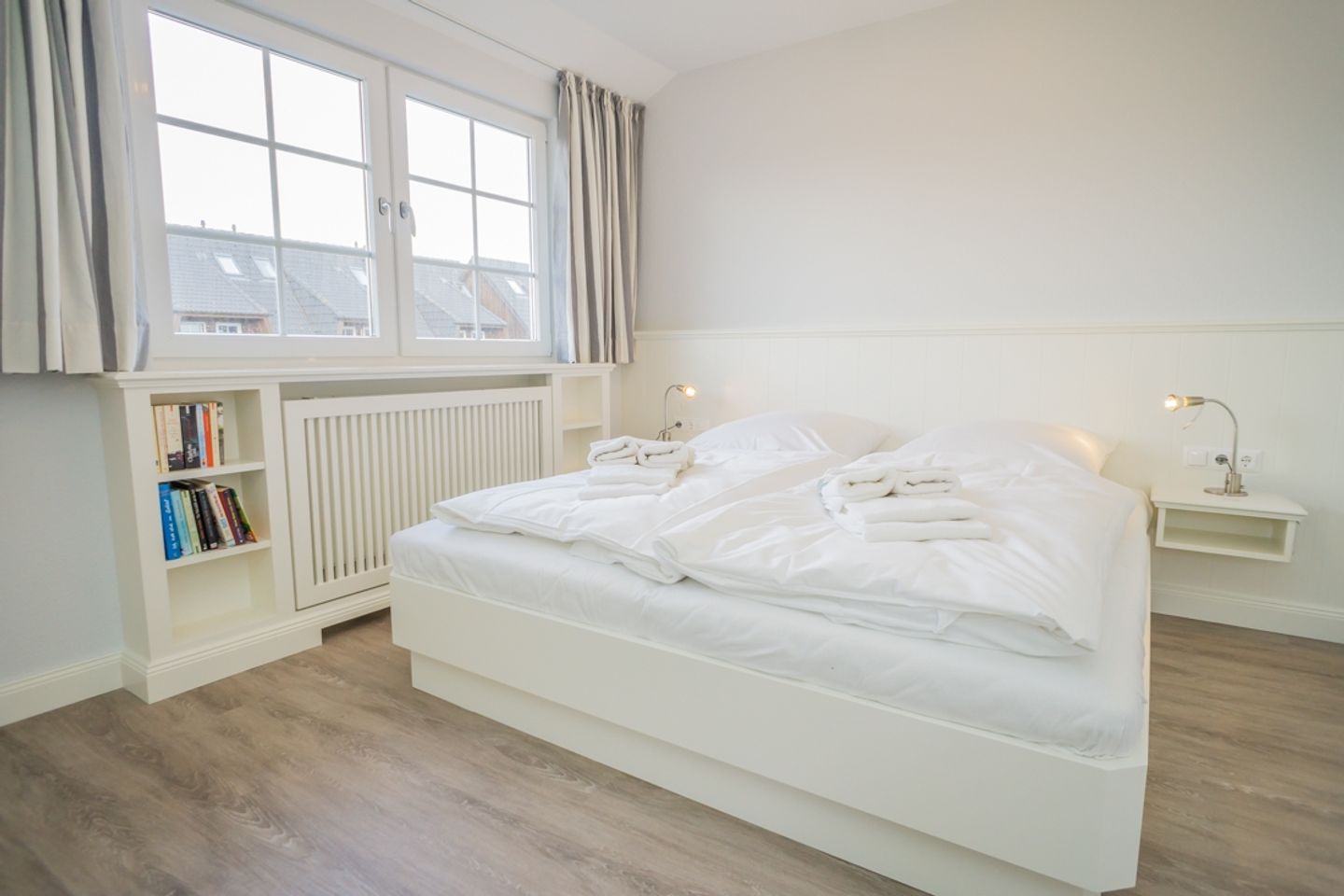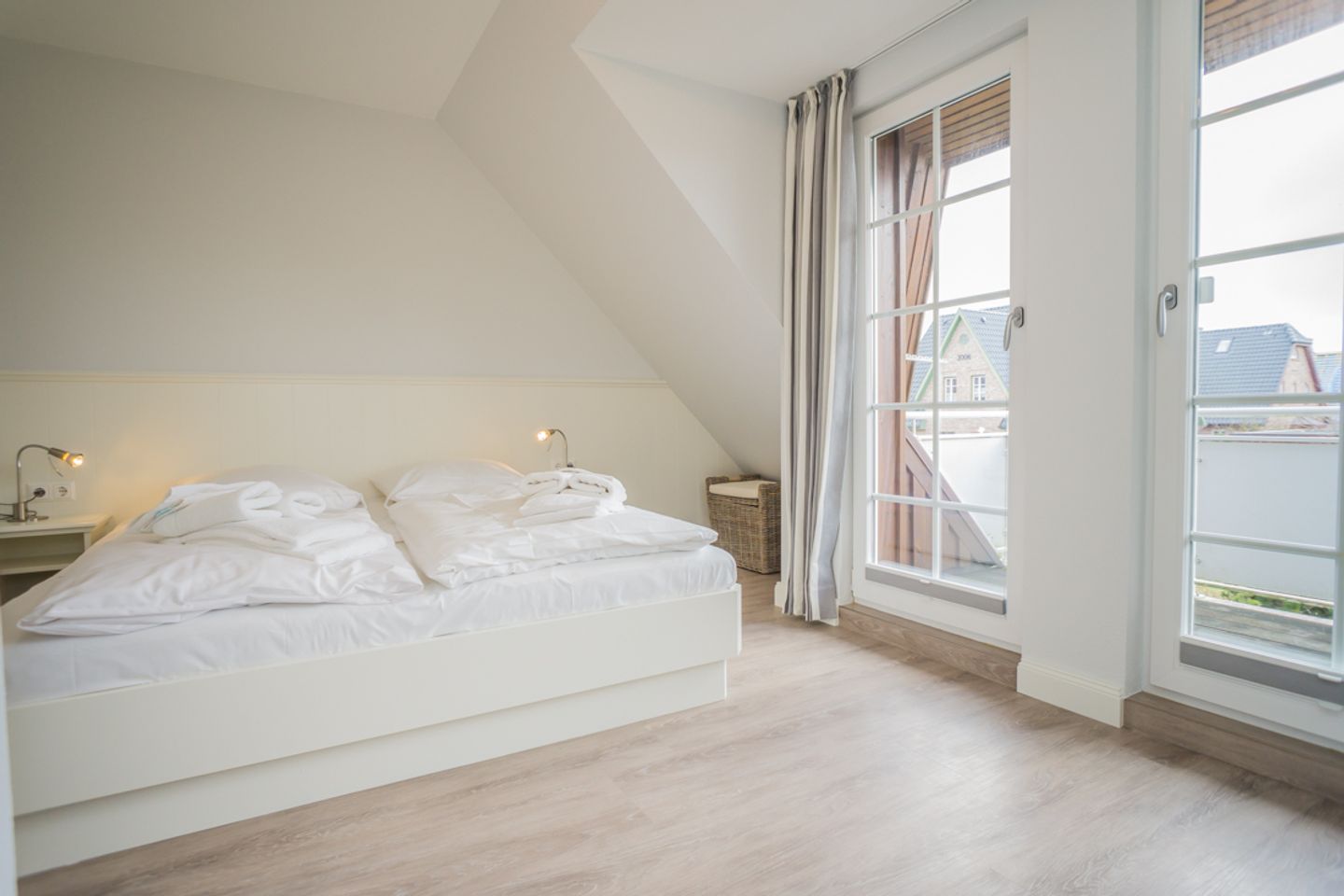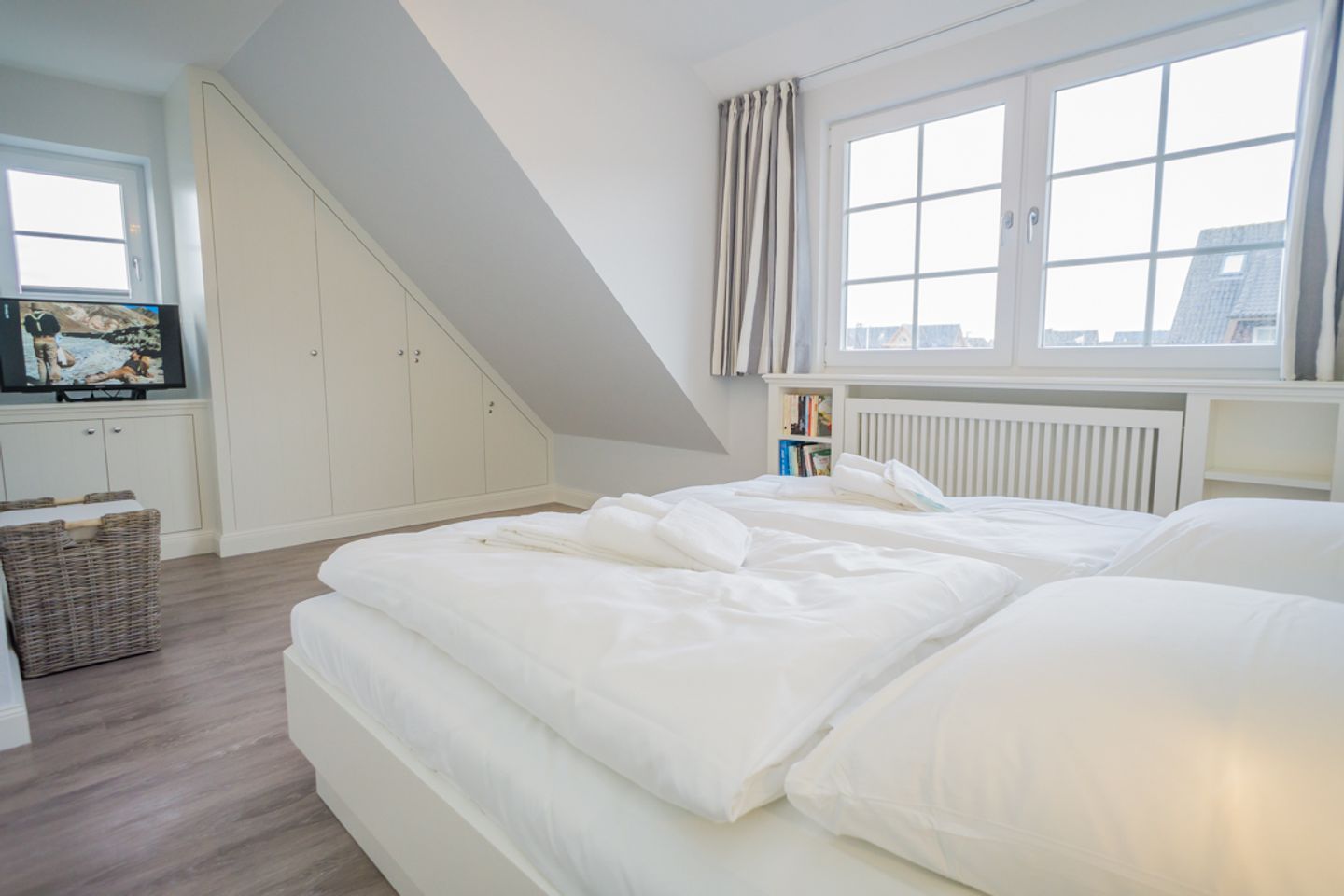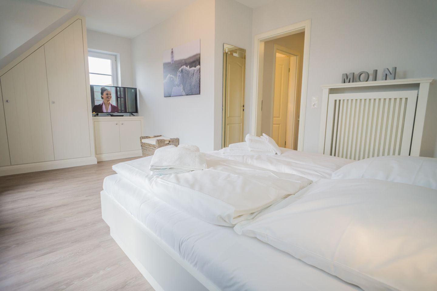 Das luxuriöse Badezimmer mit Waschbecken, Dusche und WC liegt ebenfalls auf dieser Etage. Im Spitzboden befindet sich das dritte Schlafzimmer mit zwei Einzelbetten, Flatscreen und Schreibtisch. In diesem Nichtraucherdomizil ist die Tierhaltung nicht erlaubt. Ein Pkw-Stellplatz steht Ihnen am Haus zur Verfügung. Das Ferienhaus verfügt weiterhin über einen Telefonanschuss mit Inland-Festnetz-Flatrate und natürlich kostenloses W-LAN. Sie können Sie Ihre mitgebrachten Fahrräder in der Gartenhütte unterstellen. Der Strand ist nur ca. 550 Meter entfernt!