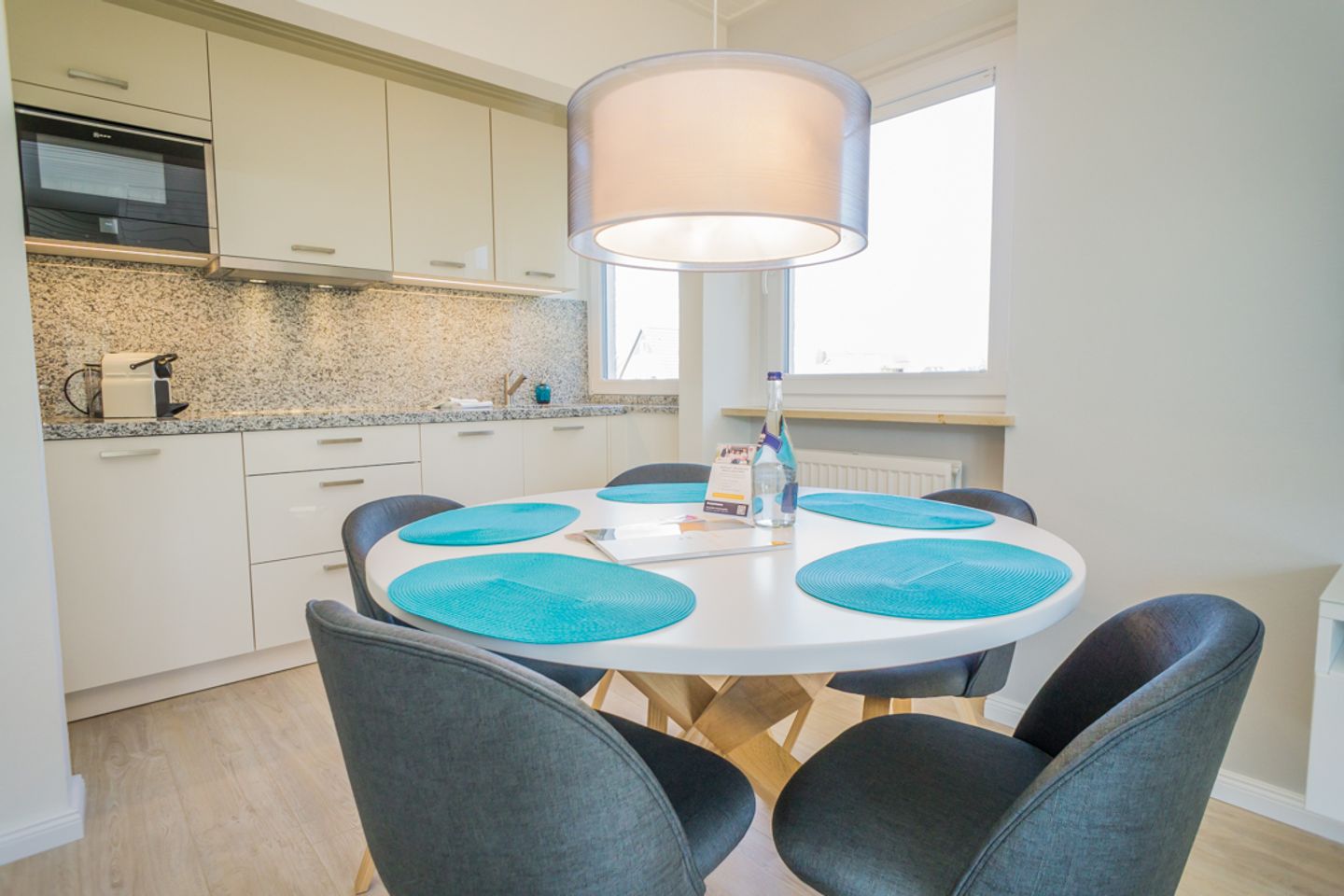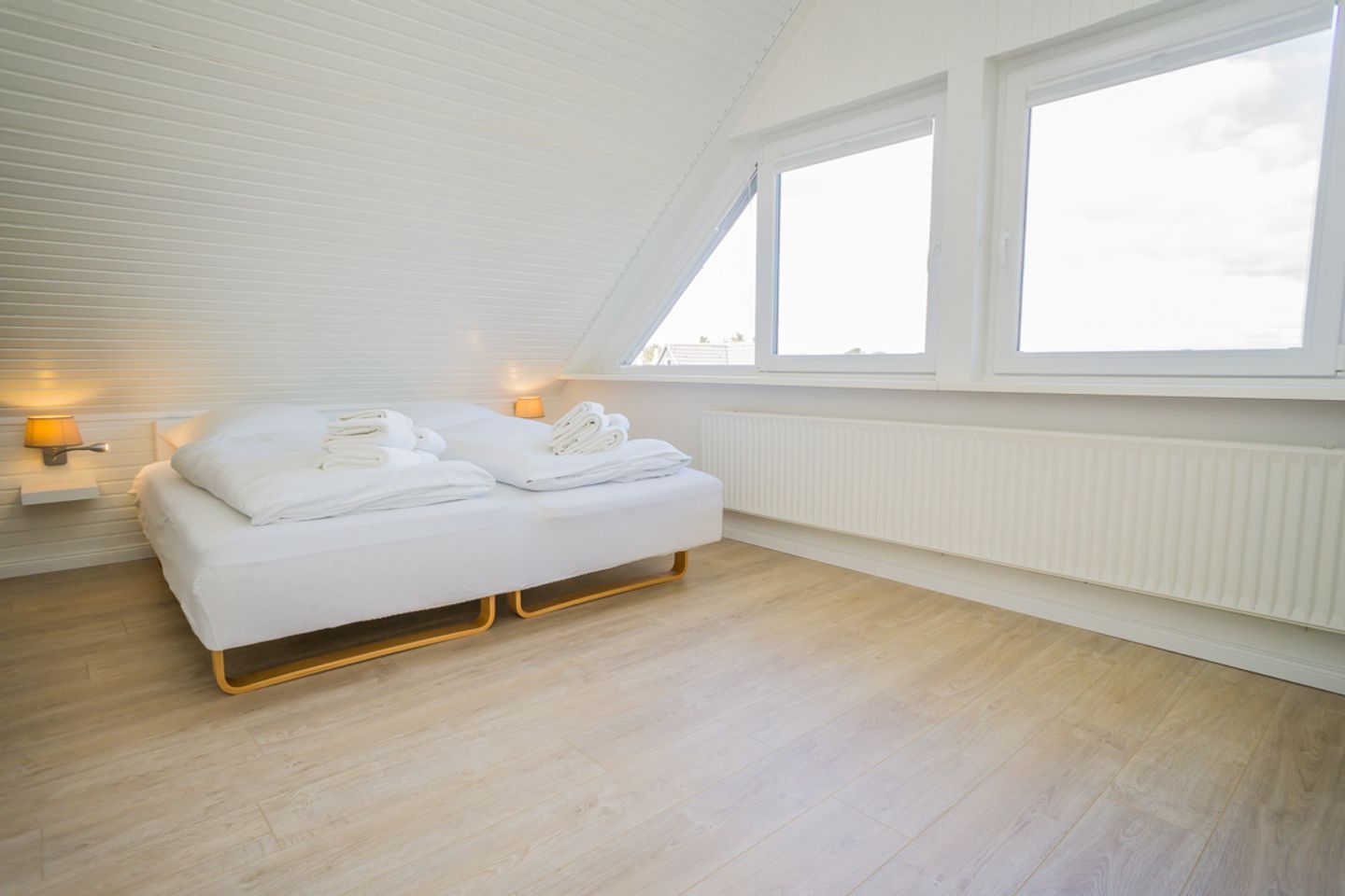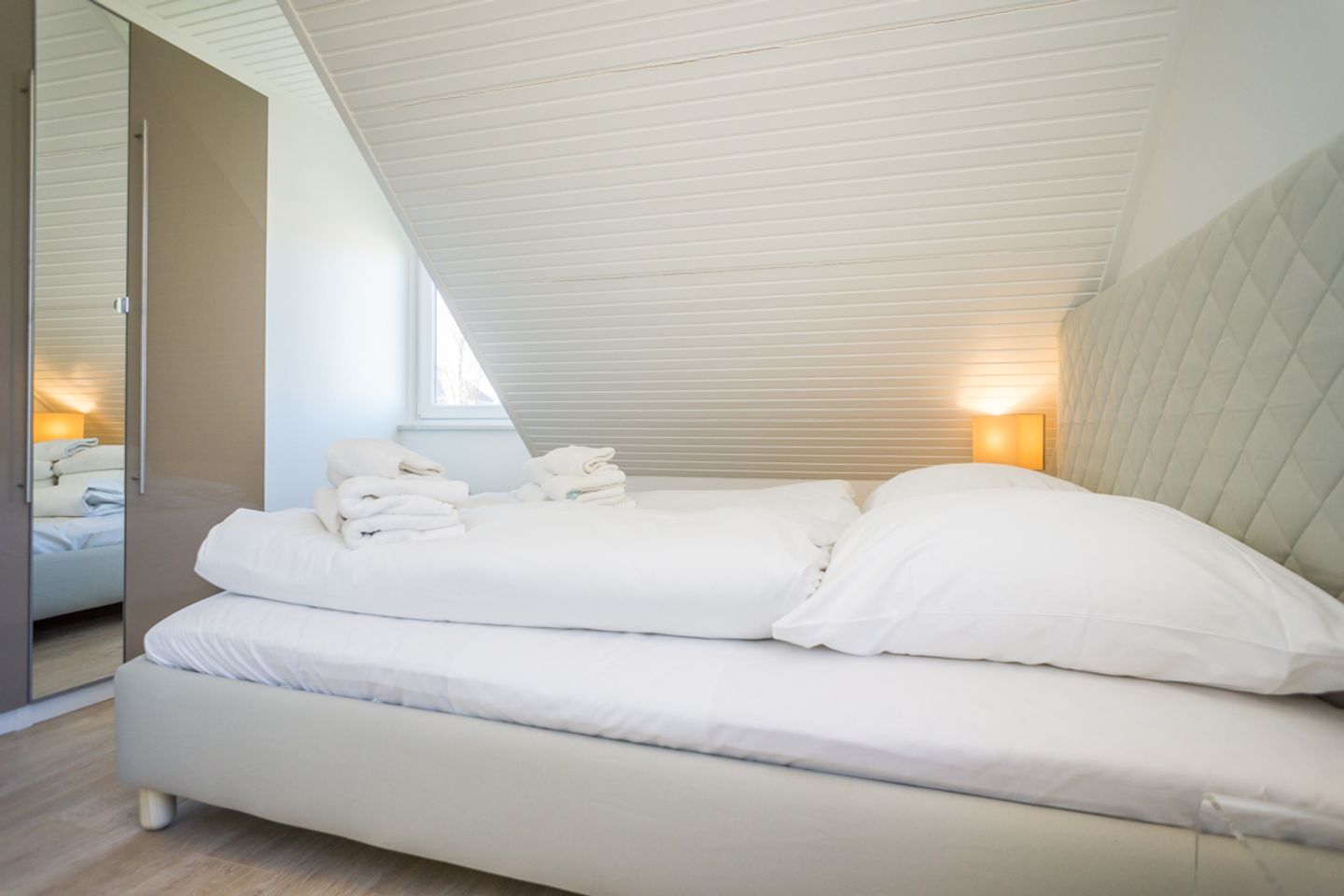 Diese 3- Zimmer-Ferienwohnung in Westerland befindet sich in ruhiger Lage. Die 75m² verteilen sich über zwei Ebenen, Obergeschoss und Dachgeschoss. Im Obergeschoss erwartet Sie ein Flur von wo die Zimmer abgehen. Die offene Küche ist ausgestattet mit einem Ceran-Kochfeld, Mikrowelle mit Backofenfunktion, Geschirrspüler, Espressomaschine (Nespresso), Filter-Kaffeemaschine, elektrischer Wasserkocher und Toaster. Angrenzend an die offene Küche befindet sich der Wohn- und Essbereich. Hier befindet sich ein Esstisch, Sofa und TV. Von hier aus haben Sie Zugang zum möblierten Balkon. Im Obergeschoss befindet sich eines der beiden Schlafzimmer mit Doppelbett und Kleiderschrank, sowie das Duschbad mit Haartrockner und Kombi-Waschtrockner und ein zusätzliches Gäste WC. Über eine Treppe gelangen Sie in das Dachgeschoss der Ferienwohnung wo sich das zweite großzügige Schlafzimmer mit zwei Schlafgelegenheiten befindet. Ein PKW Stellplatz steht Ihnen am Haus zur Verfügung.