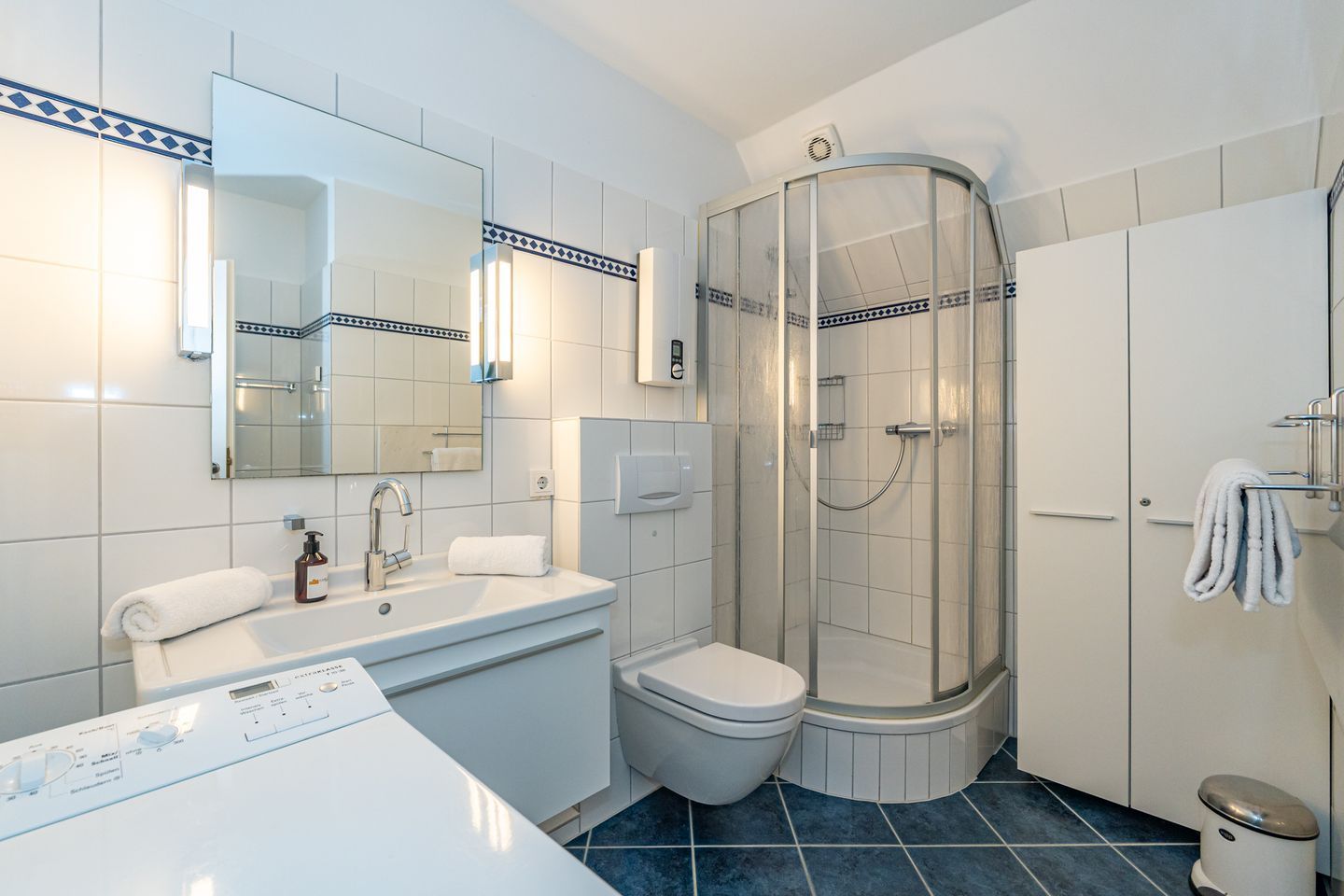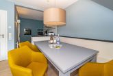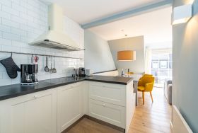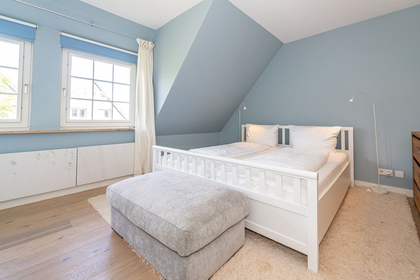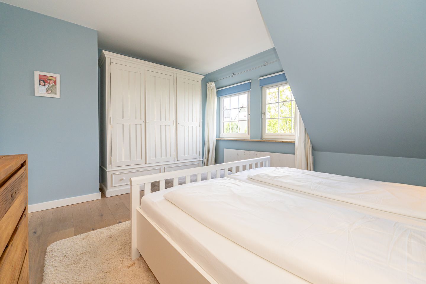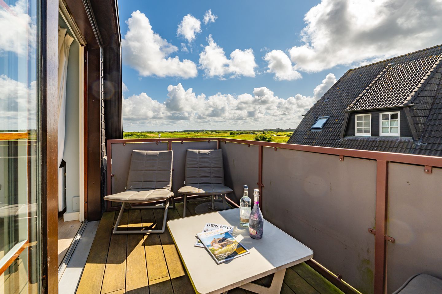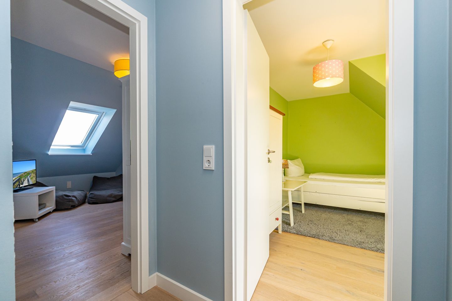 Der Wohnbereich ist ausgestattet mit Flat-TV, DVD Player großem Sofa und Sessel. Von hier ist der westlich ausgerichtete Balkon mit Möblierung zu erreichen, auf dem Sie auch noch am Nachmittag die Sonne genießen können und einen schönen Blick auf die Deichwiesen haben. Selbst ein Blick auf die Dünen können Sie von hier aus erhaschen. Ebenfalls auf dieser Ebene finden Sie die hochwertige, voll ausgestattete, offene Landhaus-Küche mit angrenzendem großen Esstisch. Vom Flur im OG erreichen Sie zudem noch das Doppelbettschlafzimmer mit großem Kleiderschrank, als auch das Duschbad mit Waschmaschine. Über eine gut begehbare Treppe gelangen Sie ins Dachgeschoss, wo Sie ein weiteres Doppelbettschlafzimmer mit TV und DVD Player sowie ein Zimmer mit Einzelbett, ideal für Ihren Nachwuchs, erwarten.