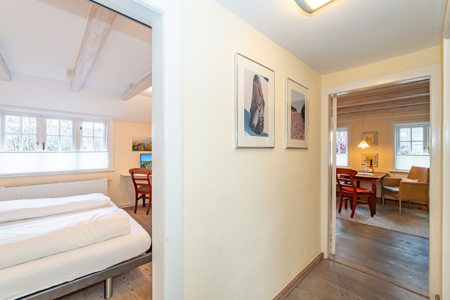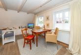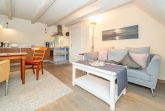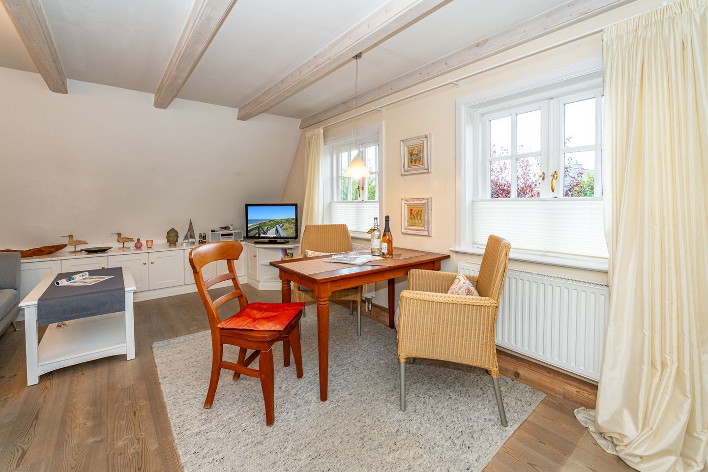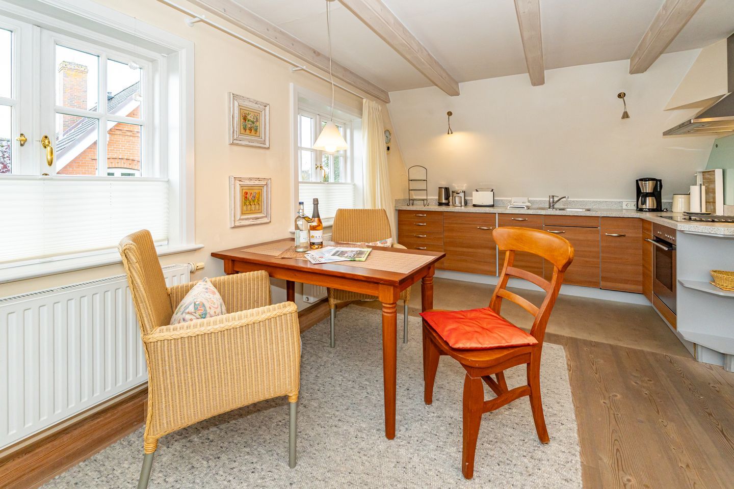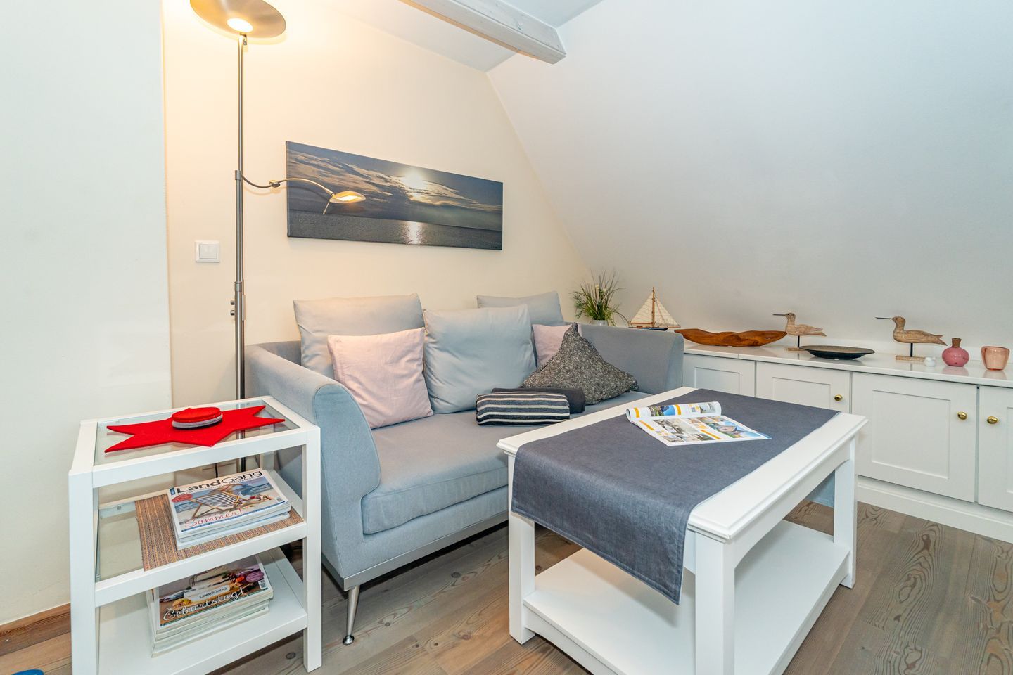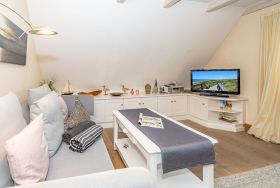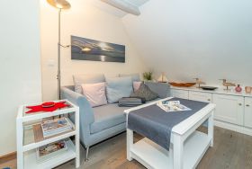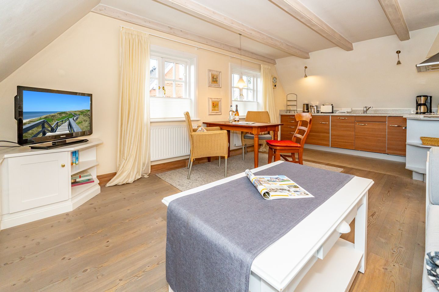 Diese helle 2- Zimmer-Ferienwohnung (60 qm) liegt im 1. Obergeschoss und überzeugt durch die traumhafte, ruhige Lage in Westerland und bietet Platz für max. 2 Personen. Durch einen kleinen Flur betreten Sie das helle Wohnzimmer mit Sofa und Flatscreen-TV. Die angrenzende, offene Küchen- und Essbereich lädt zum gemeinsamen Kochen, Schlemmen und Verweilen ein. Die Küchenzeile bietet vom Cerankochfeld, Kaffeemaschine, Toaster, Backofen bis zum Geschirrspüler eine Wohlfühlausstattung. Vom Esstisch aus haben Sie einen idyllischen Blick in den eingewachsenen Garten mit altem Baumbestand. Ein Schlafzimmer mit Doppelbett (200x200 cm) und geräumigen Einbauschrank, sowie ein Flatscreen-TV, als auch ein helles Duschbad und ein separates Gäste- WC, runden das Obergeschoss ab. Ein Highlight ist der traumhafte Garten, hier finden Sie Ruhe auf dem zur Ferienwohnung gehörenden Sonnenplatz mit Sylter Strandkorb und Bestuhlung. Zum Ausklang eines Strandtages können Sie hier die Seele baumeln lassen, und bei einem Glas Wein den Abend einläuten. Waschmaschine und Trockner befinden sich im Keller des Hauses. Fahrradabstellmöglichkeit im Haus. Das Rauchen und Haustiere sind in dieser Ferienwohnung nicht erlaubt.