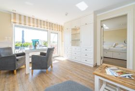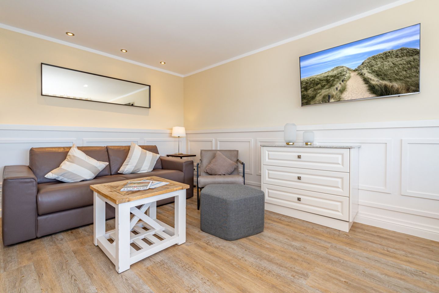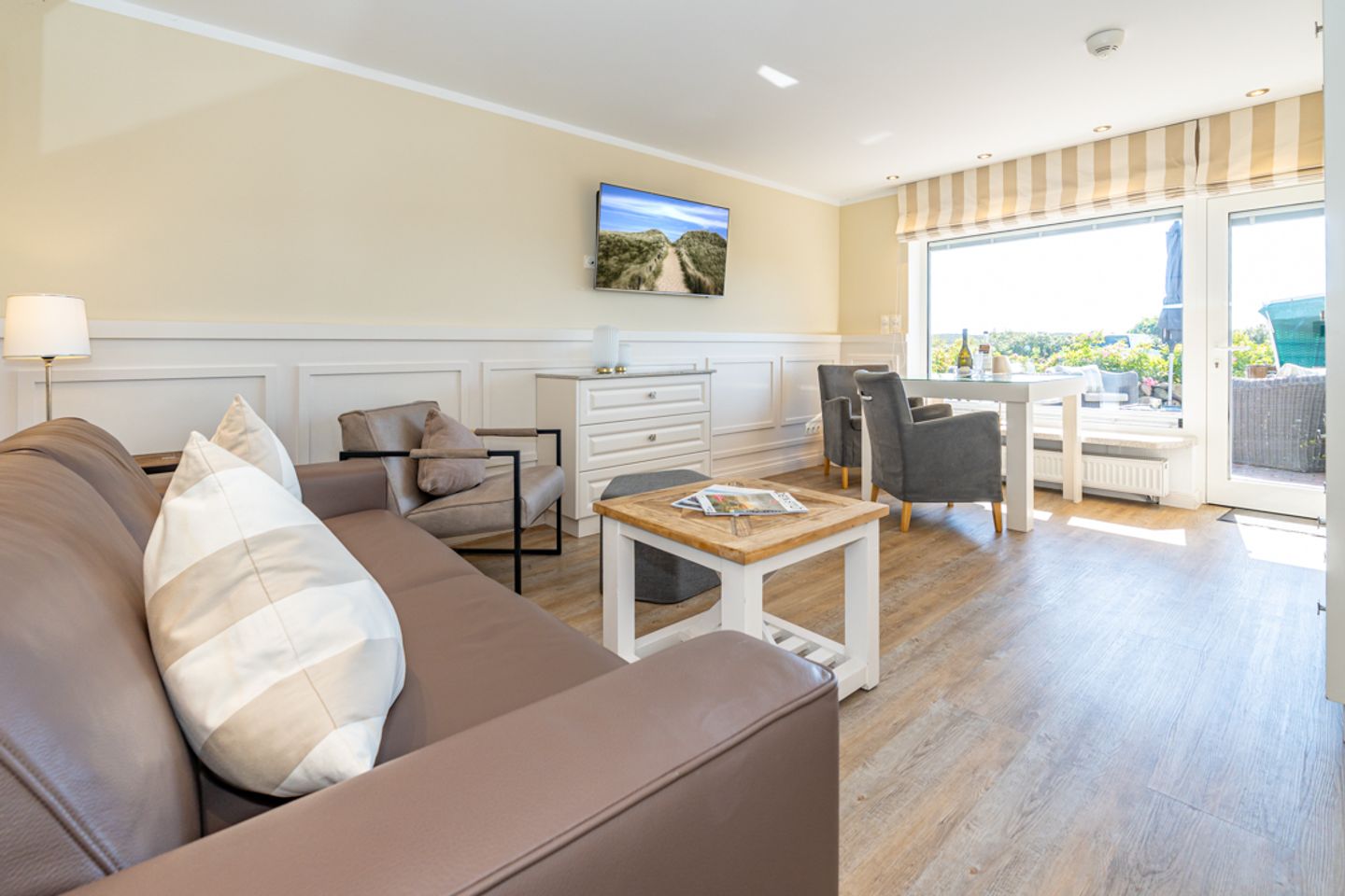 Luxus pur in Kampen auf Sylt! Buchungen ab 2 Übernachtungen! Genießen Sie von Ihrer Ferienwohnung den schönen, weiten Blick auf die Dünen. Das Wohnzimmer mit neuer, moderner, elektrischer Schlafcouch und gemütlicher Essecke verfügt über einen Flatscreen TV. Die angrenzende, offene Küche mit Ceran-Kochfeld, Mikrowelle, Geschirrspüler, WMF Kaffeefiltermaschine, Espressomaschine (Nespresso), Wasserkocher und Toaster sind selbstverständlich. Das Doppelschlafzimmer (160 x 200cm) verfügt über hochwertige Tischlereinbauten mit großzügigem Stauraum für Ihre Garderobe und verfügt über einen Flatscreen-TV. Das Bad ist ausgestattet mit Dusche, WC, Waschtisch und Fön. 2 Sonos Boxen mit dem Smartphone bedienbar stehen Ihnen zur Verfügung. Auf der angrenzenden Terrasse befindet sich ein Strandkorb und eine Gartengarnitur(nur saisonal verfügbar), hier können Sie den Tag bei einem Glas Wein und unverbaubaren Blick auf die Dünen (Südausrichtung) gemütlich ausklingen lassen. Eine Waschmaschine befindet sich im Bad. Das Rauchen in diesem Objekt nicht gestattet. Ein guterzogener Hund ist nach vorheriger Anmeldung gestattet (10,- € pro Tier/Tag).