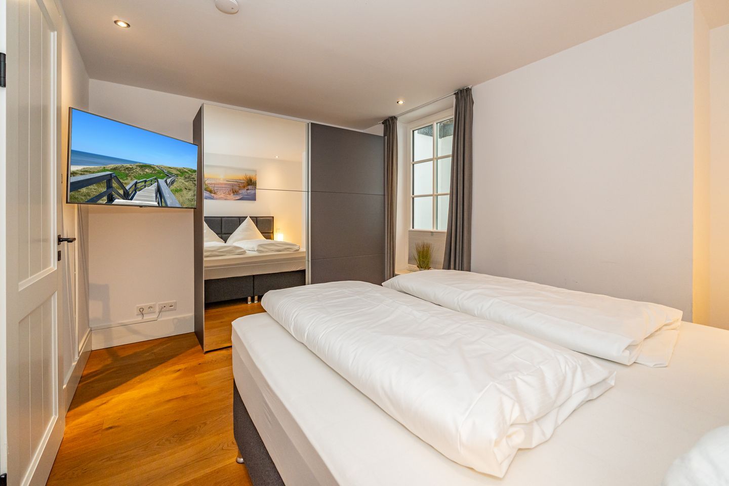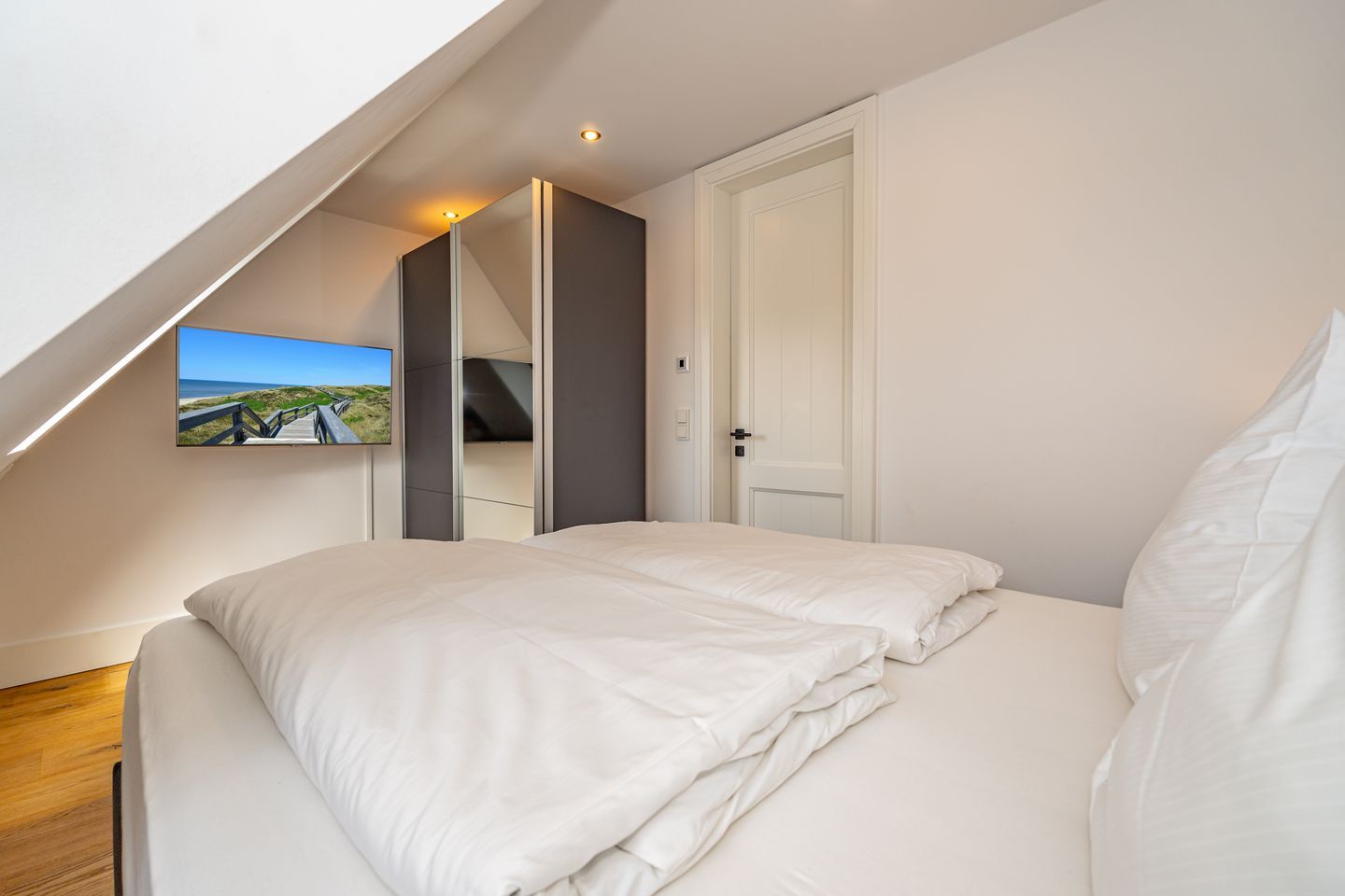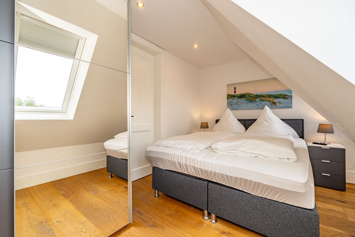 Im Obergeschoss können Sie es sich in einem weiteren Schlafzimmer mit gemütlichen Boxspringbett und Flat Screen nach einem schönen Urlaubstag bequem machen. Auf dieser Etage befindet sich ebenfalls ein Badezimmer mit WC, bodentiefer Dusche und Handtuchheizkörper.
