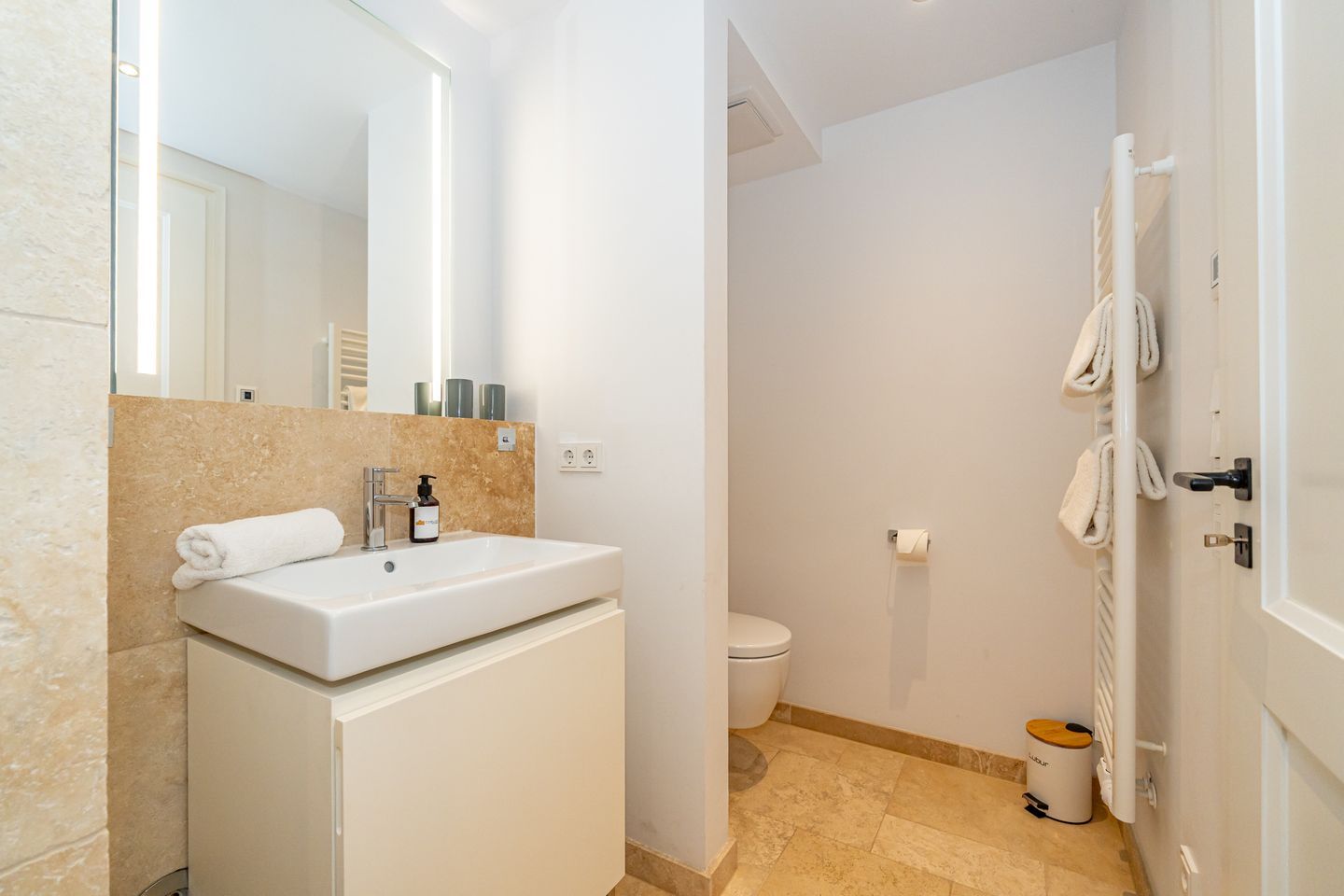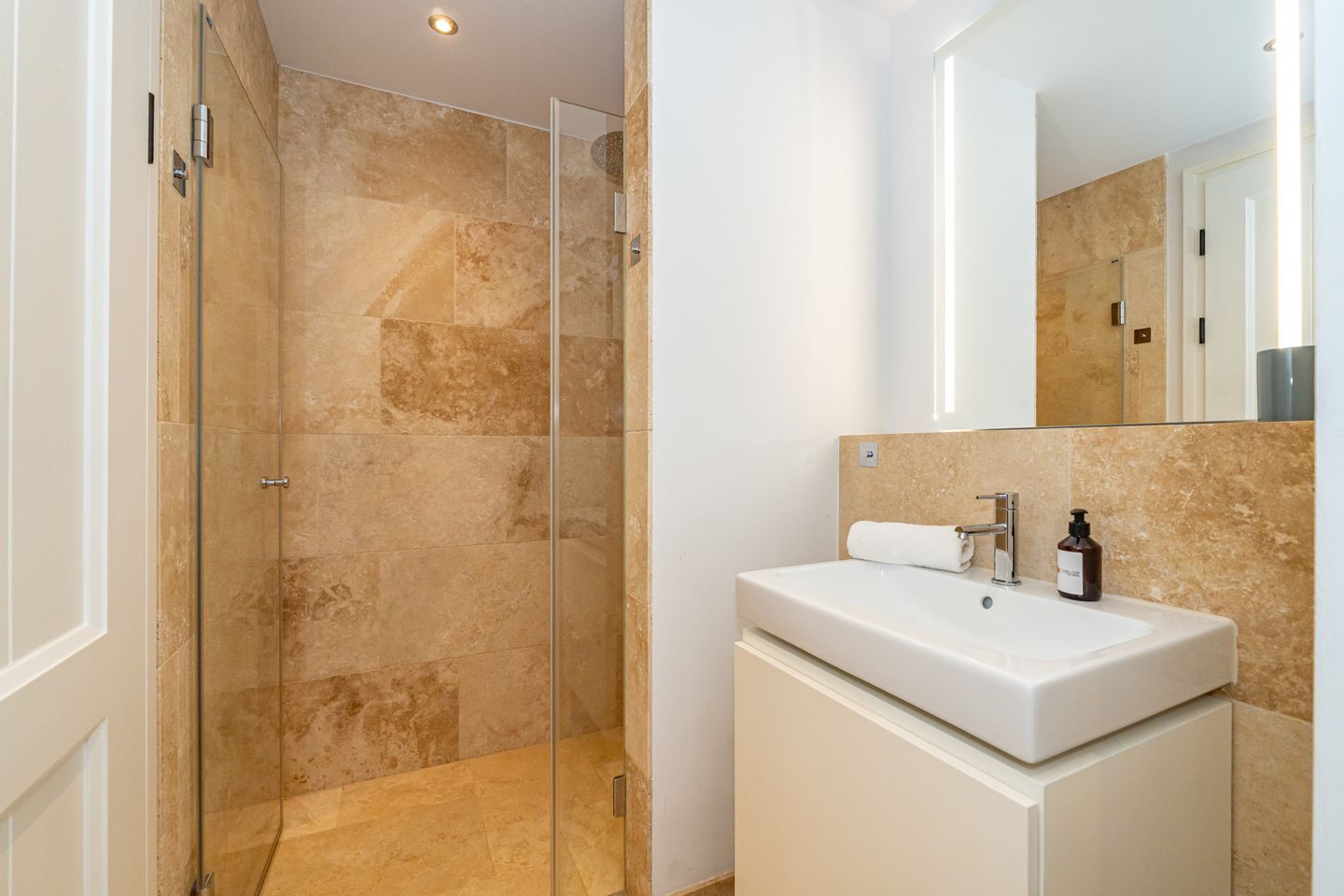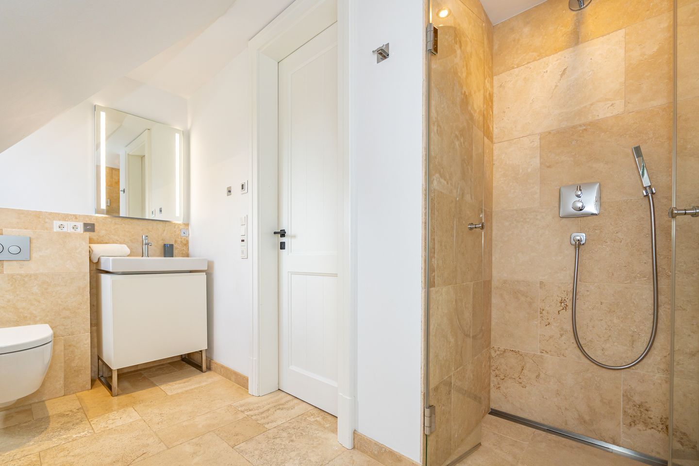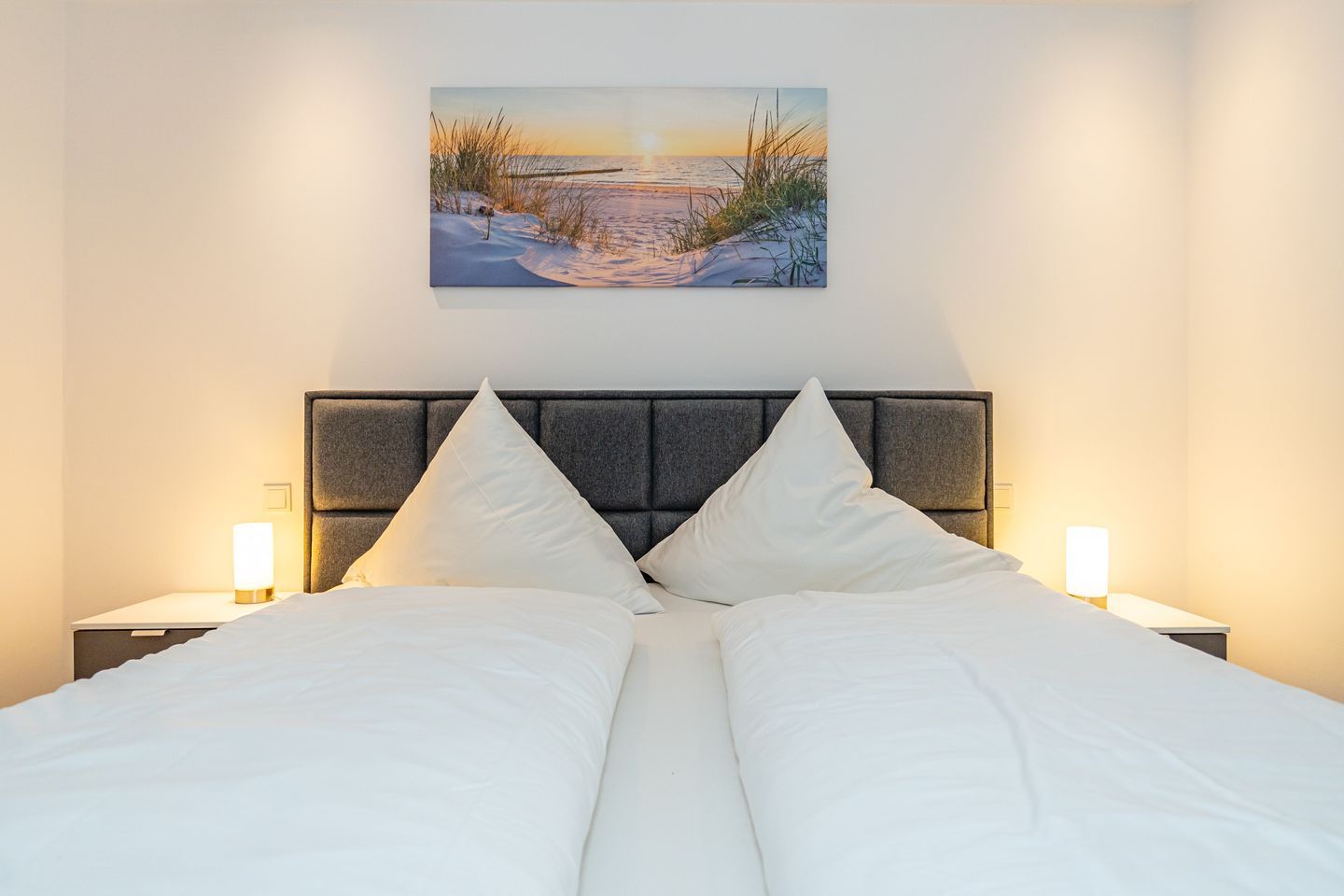 Im Obergeschoss können Sie es sich in einem weiteren Schlafzimmer mit gemütlichen Boxspringbett und Flat Screen nach einem schönen Urlaubstag bequem machen. Auf dieser Etage befindet sich ebenfalls ein Badezimmer mit WC, bodentiefer Dusche und Handtuchheizkörper.