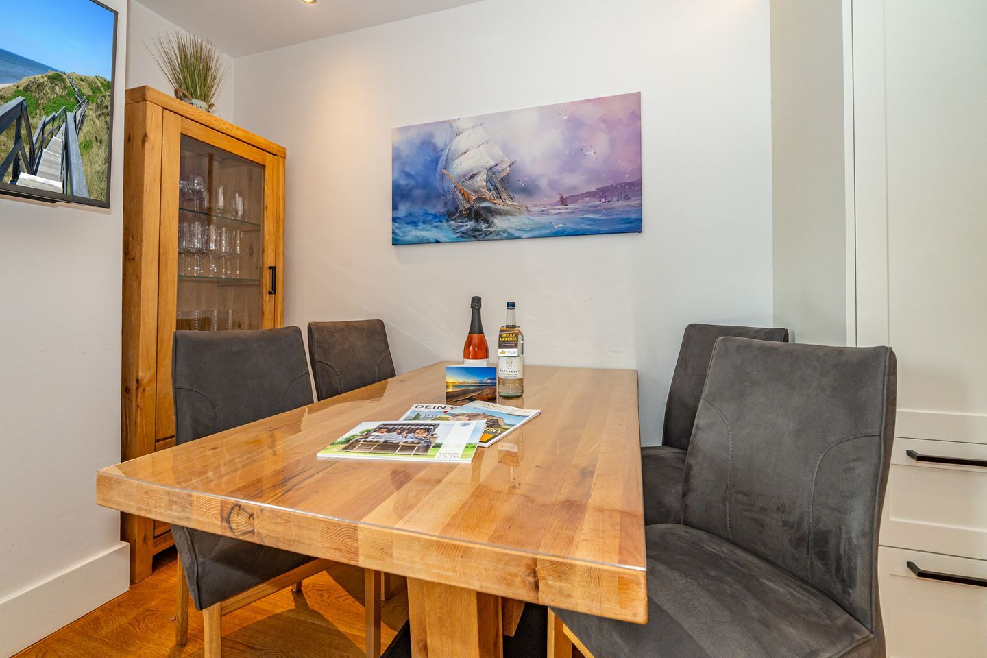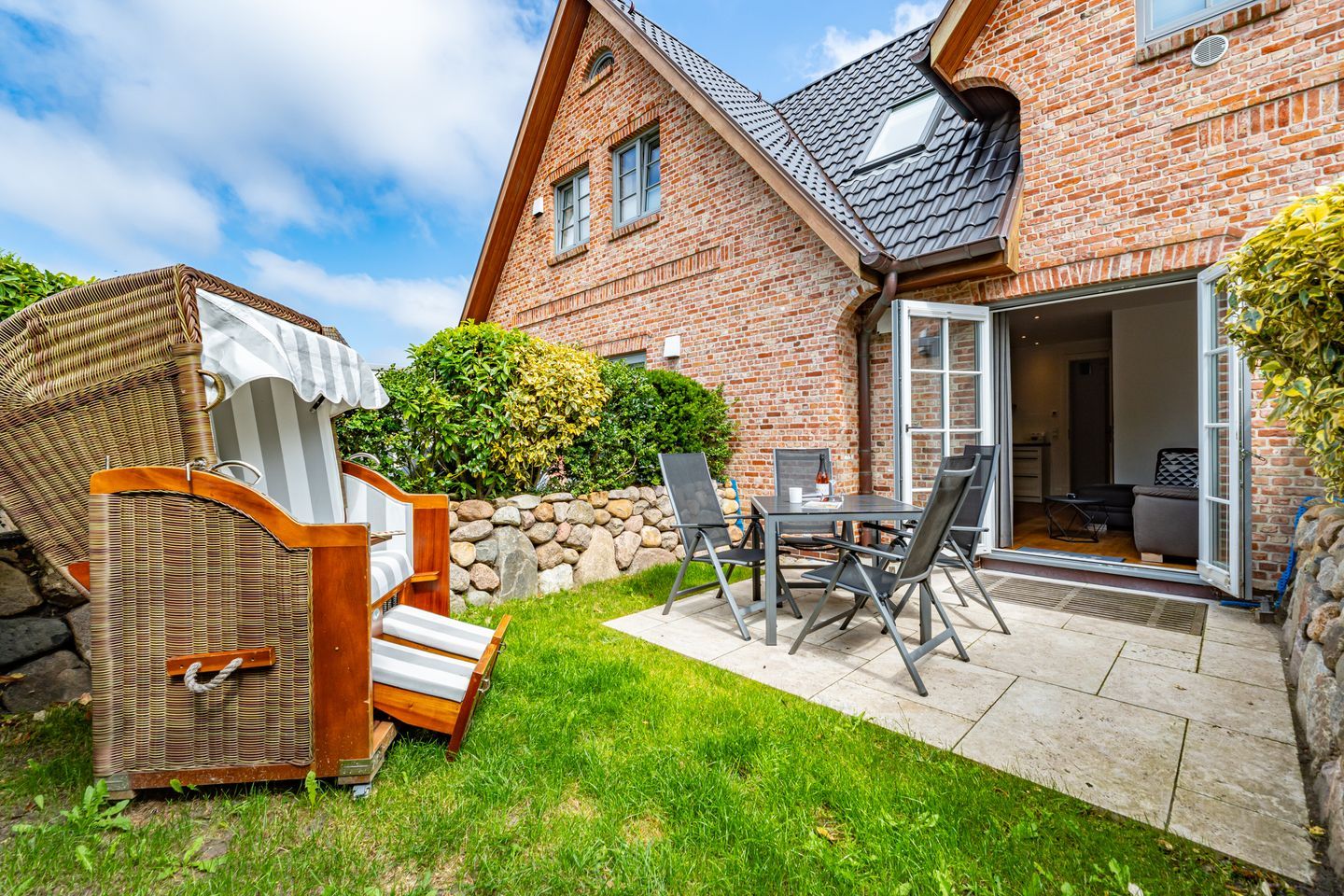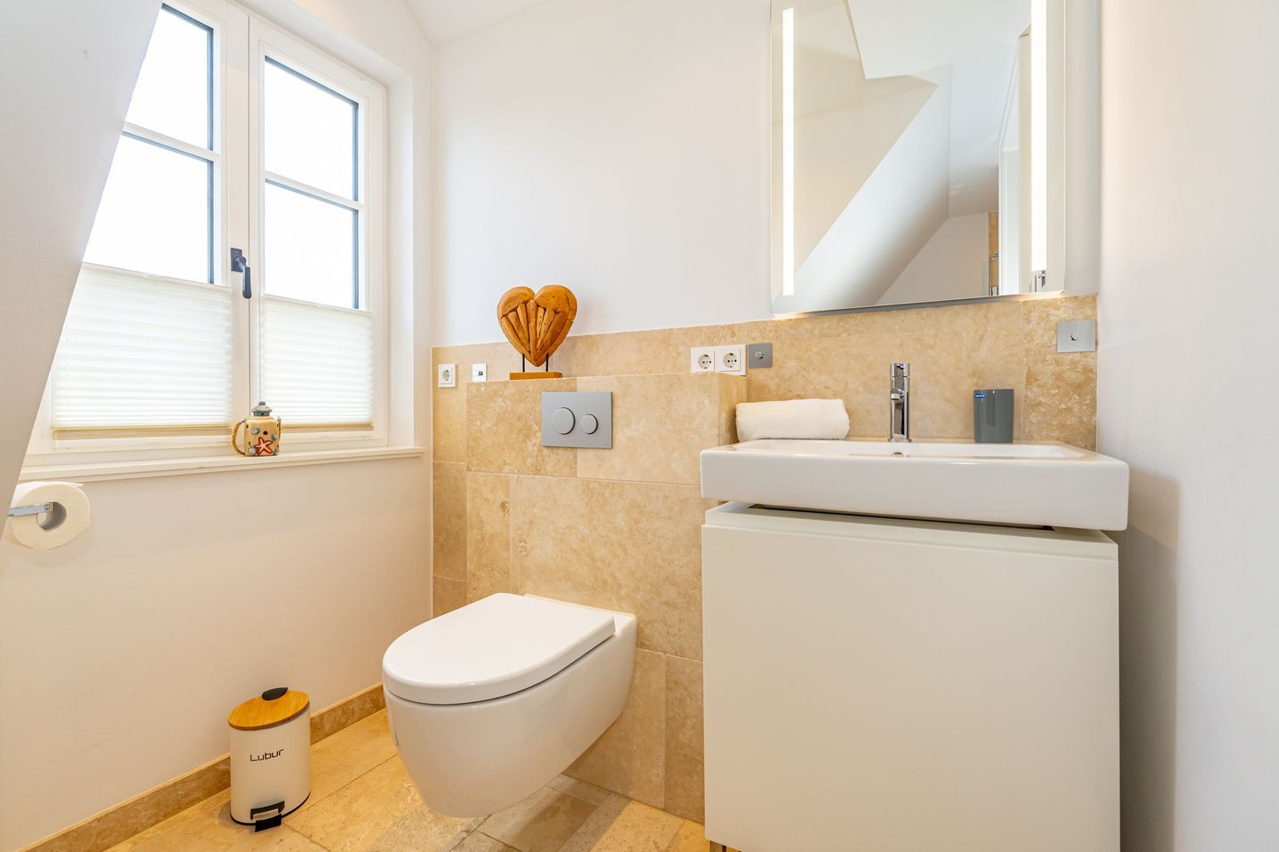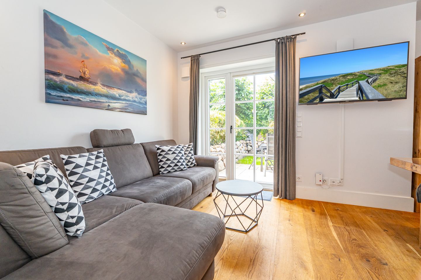Im Erdgeschoss befindet sich der moderne Wohn- und Essbereich mit offener Küche. Von dort gelangen Sie auf die, durch einen Friesenwall begrenzte Terrasse mit Gartenmöbeln. Ein Strandkorb steht Ihnen saisonal im Vorgarten zur Verfügung. Im Erdgeschoss befindet sich ebenfalls ein Gäste WC. Gelangt man ins Souterrain findet man dort ein Schlafzimmer mit Boxspringbett und Flat Screen. Die Blockhaus Sauna, sowie ein Badezimmer mit WC, ebenerdiger Dusche und Handtuchheizkörper befindet sich ebenfalls im Souterrain.