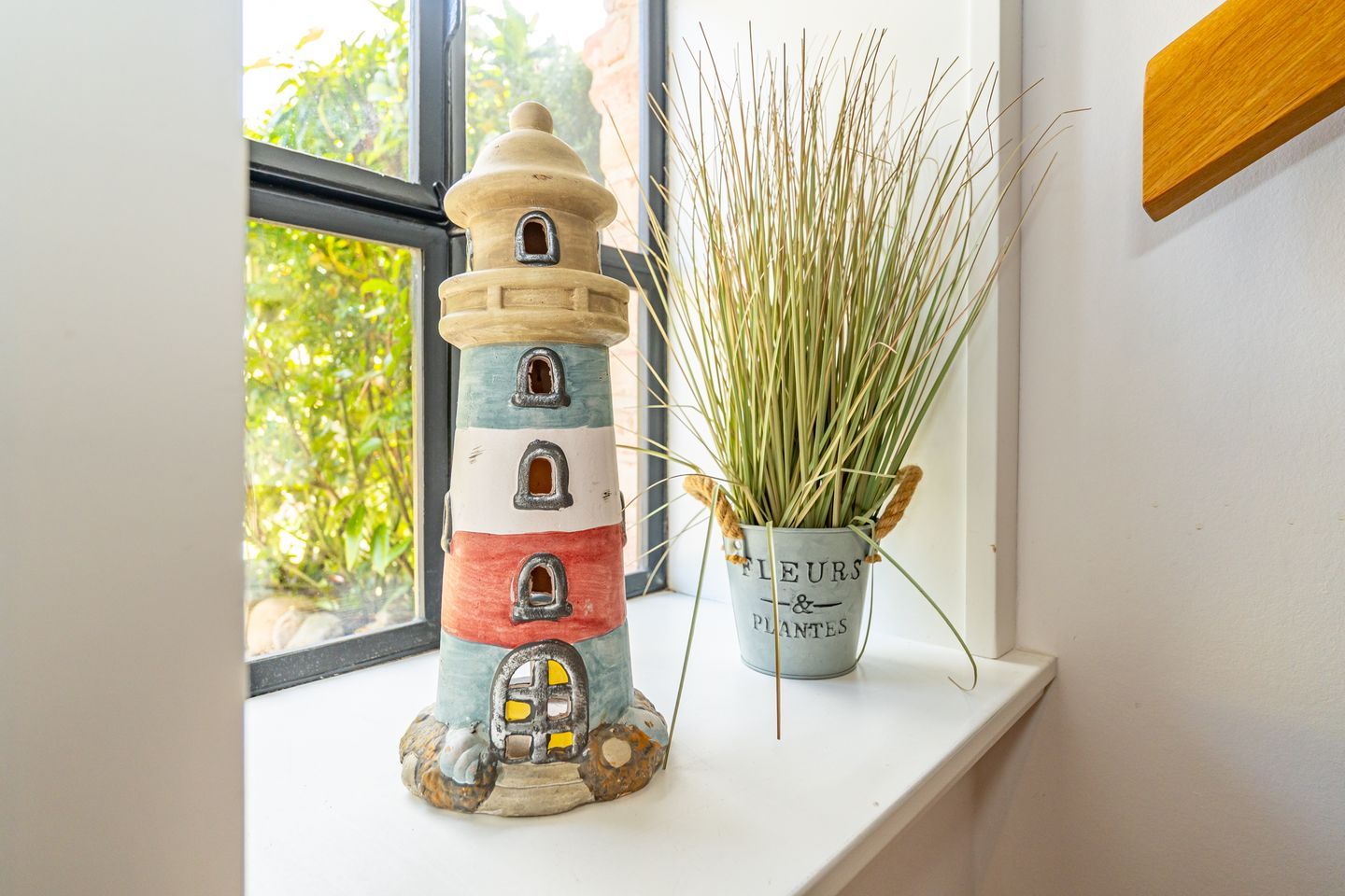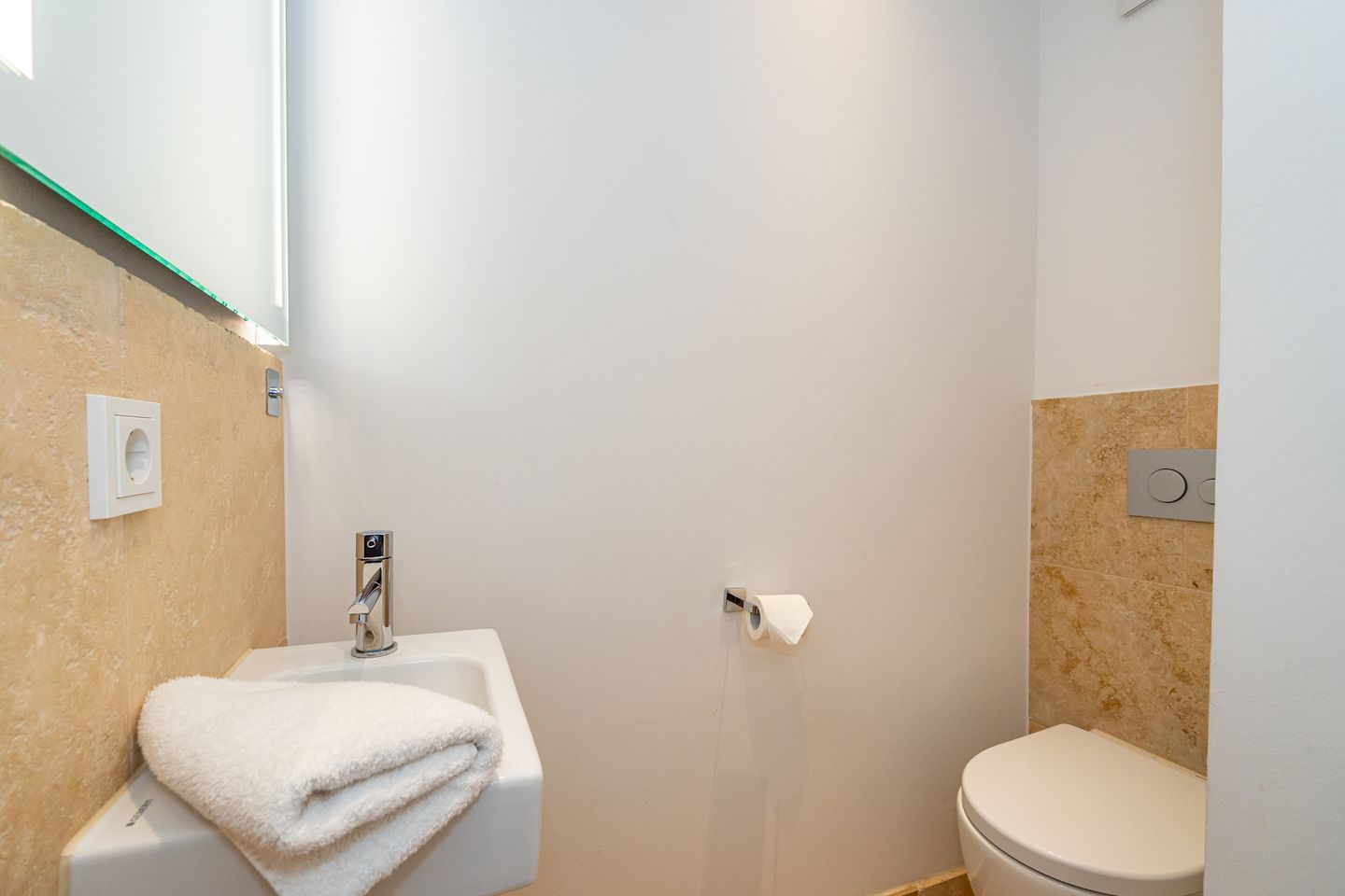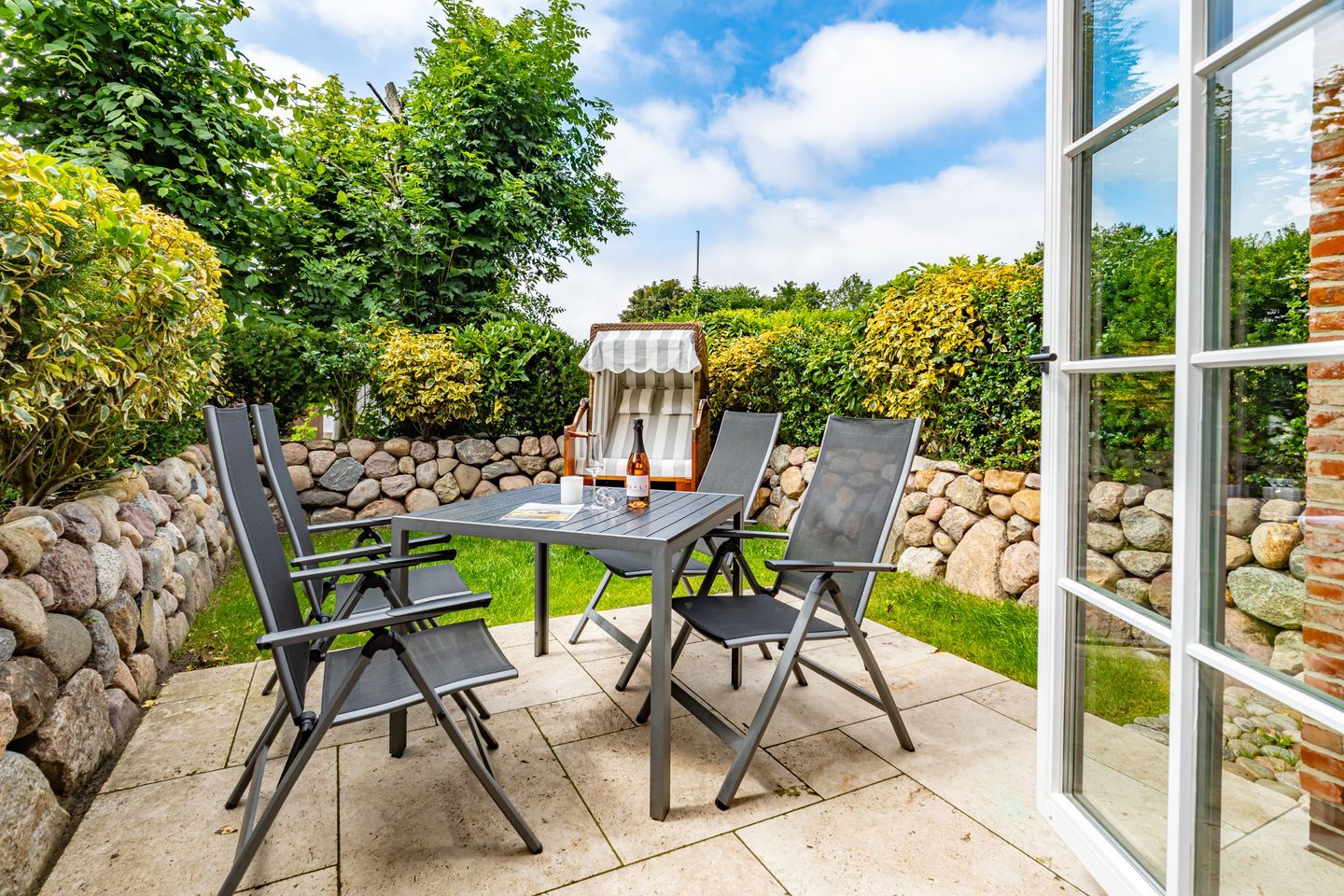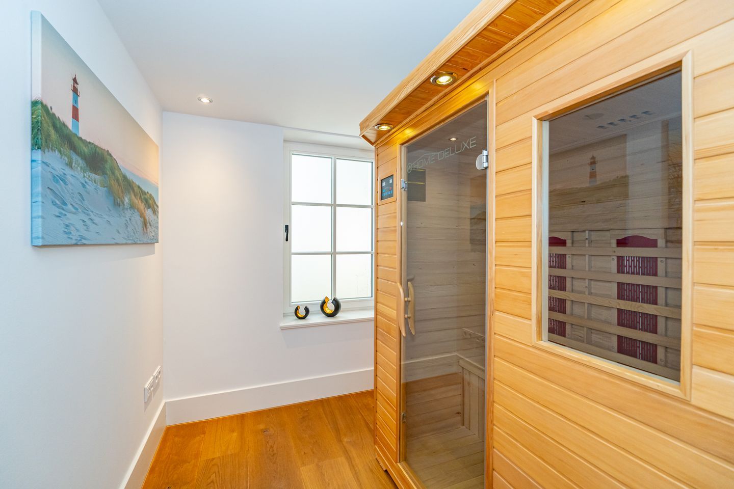 Im Erdgeschoss befindet sich der moderne Wohn- und Essbereich mit offener Küche. Von dort gelangen Sie auf die, durch einen Friesenwall begrenzte Terrasse mit Gartenmöbeln. Ein Strandkorb steht Ihnen saisonal im Vorgarten zur Verfügung. Im Erdgeschoss befindet sich ebenfalls ein Gäste WC. Gelangt man ins Souterrain findet man dort ein Schlafzimmer mit Boxspringbett und Flat Screen. Die Blockhaus Sauna, sowie ein Badezimmer mit WC, ebenerdiger Dusche und Handtuchheizkörper befindet sich ebenfalls im Souterrain.