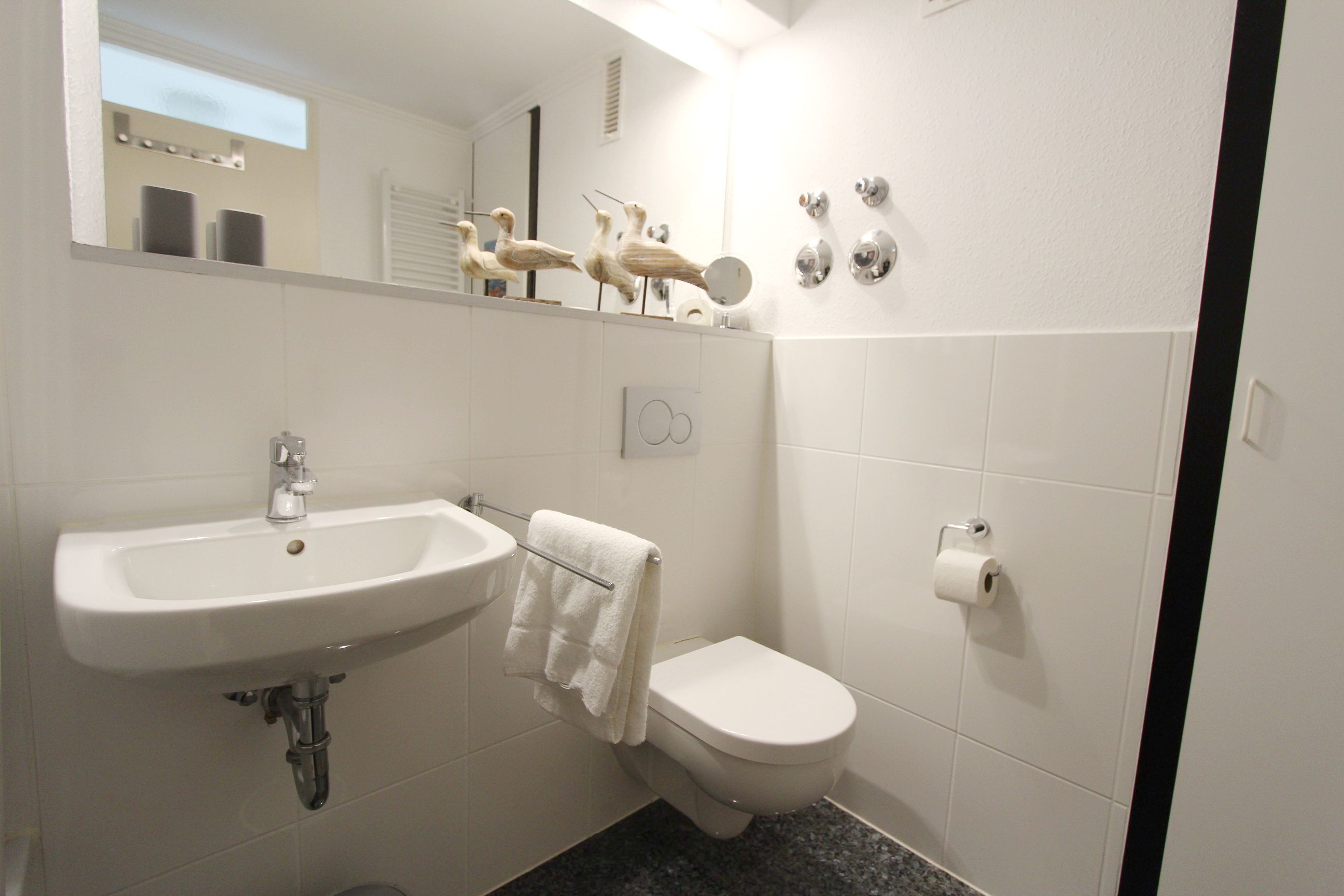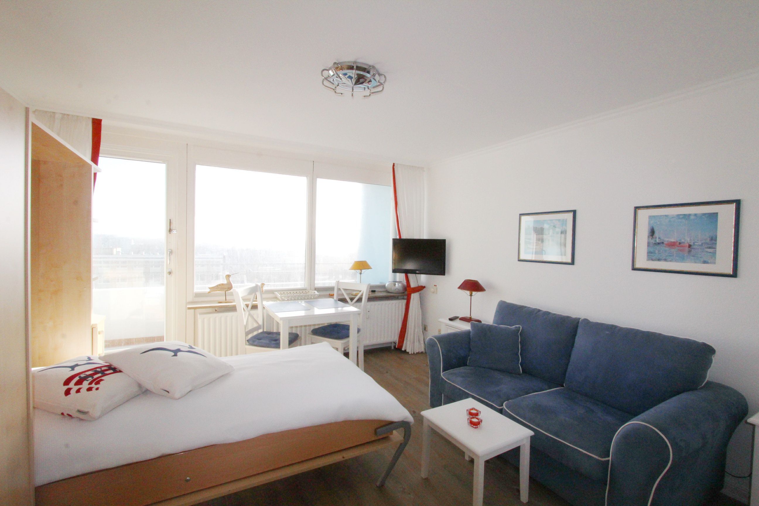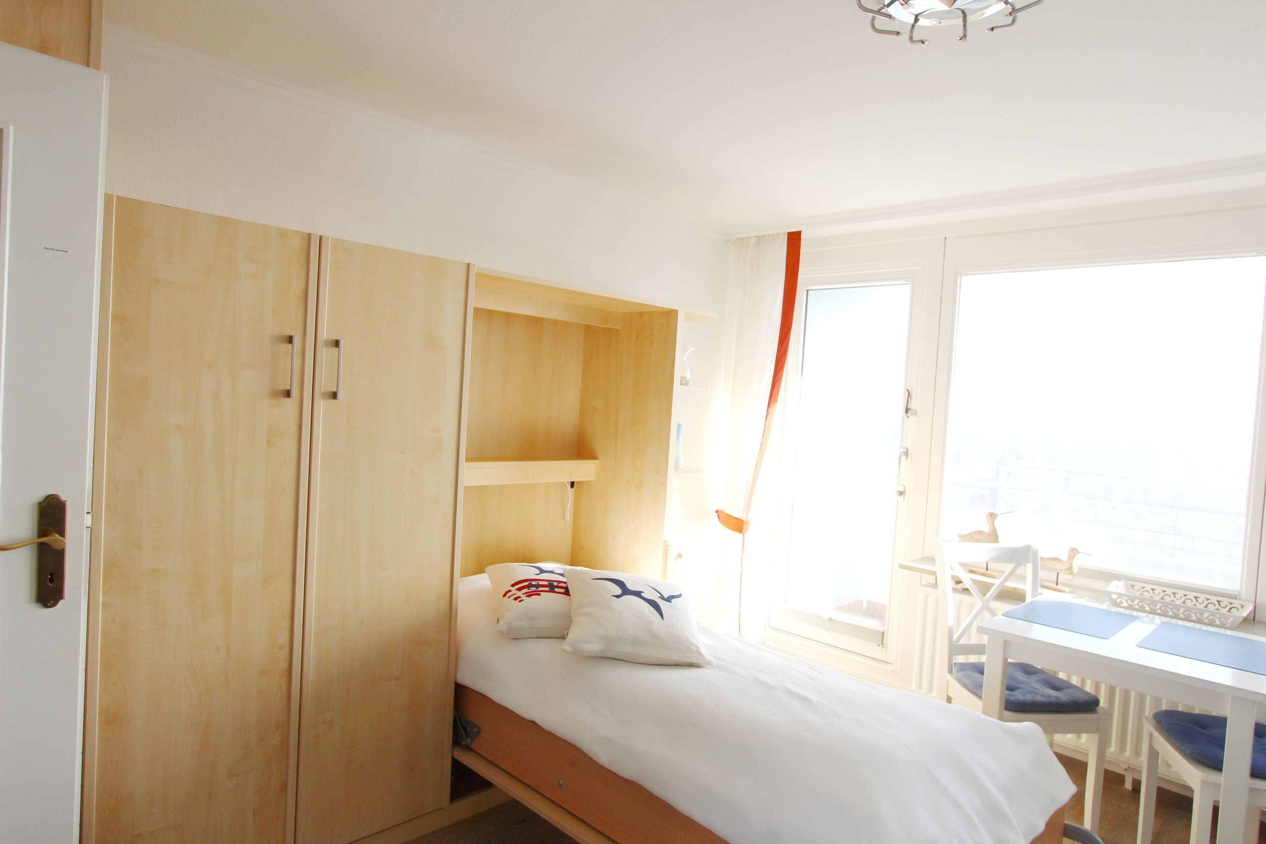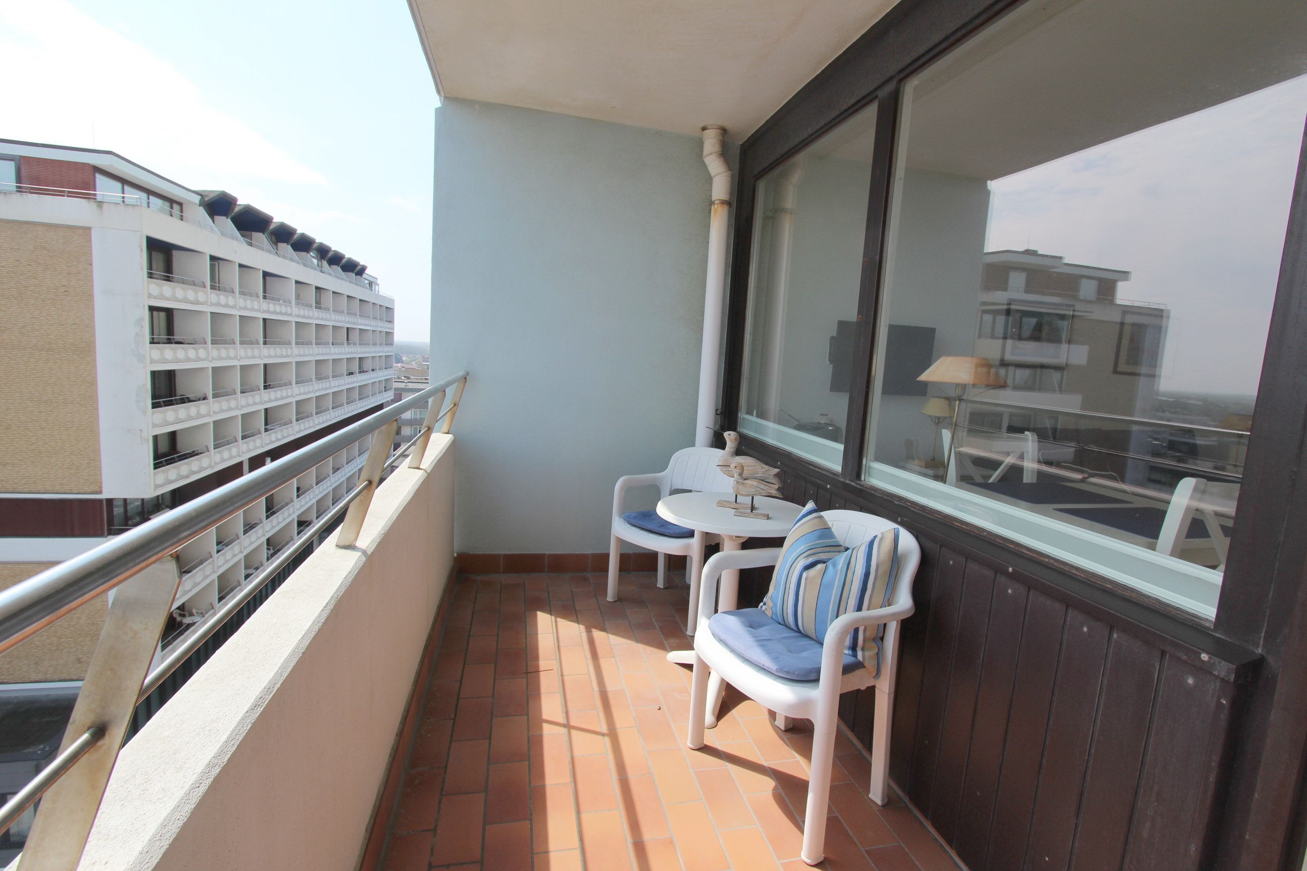 Einzimmerwohnung in der 6. Etage im Haus Metropol mit einem schönen Blick über die Insel und bei gutem Wetter bis zum Wattenmeer. Die Wohnung hat einen Ostbalkon mit Balkonmöbeln auf dem sie jeden Morgen die Sonne gegrüßt. Im Wohn-Schlafraum gibt es Einzelschrankbetten, einen Essplatz am Fenster mit 2 Stühlen sowie eine Couch. Es wurde Designfussboden in Holzoptik verlegt und die Fenster sind mit Verdunklungsrollos ausgestattet. Das Badezimmer hat eine Badewanne, einen Fön, einen Kosmetikspiegel und ausreichend Abstellfläche für Ihre persönlichen Dinge. Die Küchenzeile im Flur verfügt über 2 Ceranfeldkochplatten und eine Mikrowelle. Zur technischen Ausstattung dieser Nichtraucherwohnung gehört ein Flachbildfernseher und ein CD-Radio. Ein freies WLAN Netzwerk (WEG Haus Metropol - Passwortfrei - ohne Gewähr) steht ihnen kostenfrei zur Verfügung. Wohnungsgröße: ca. 30 m².
