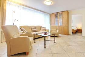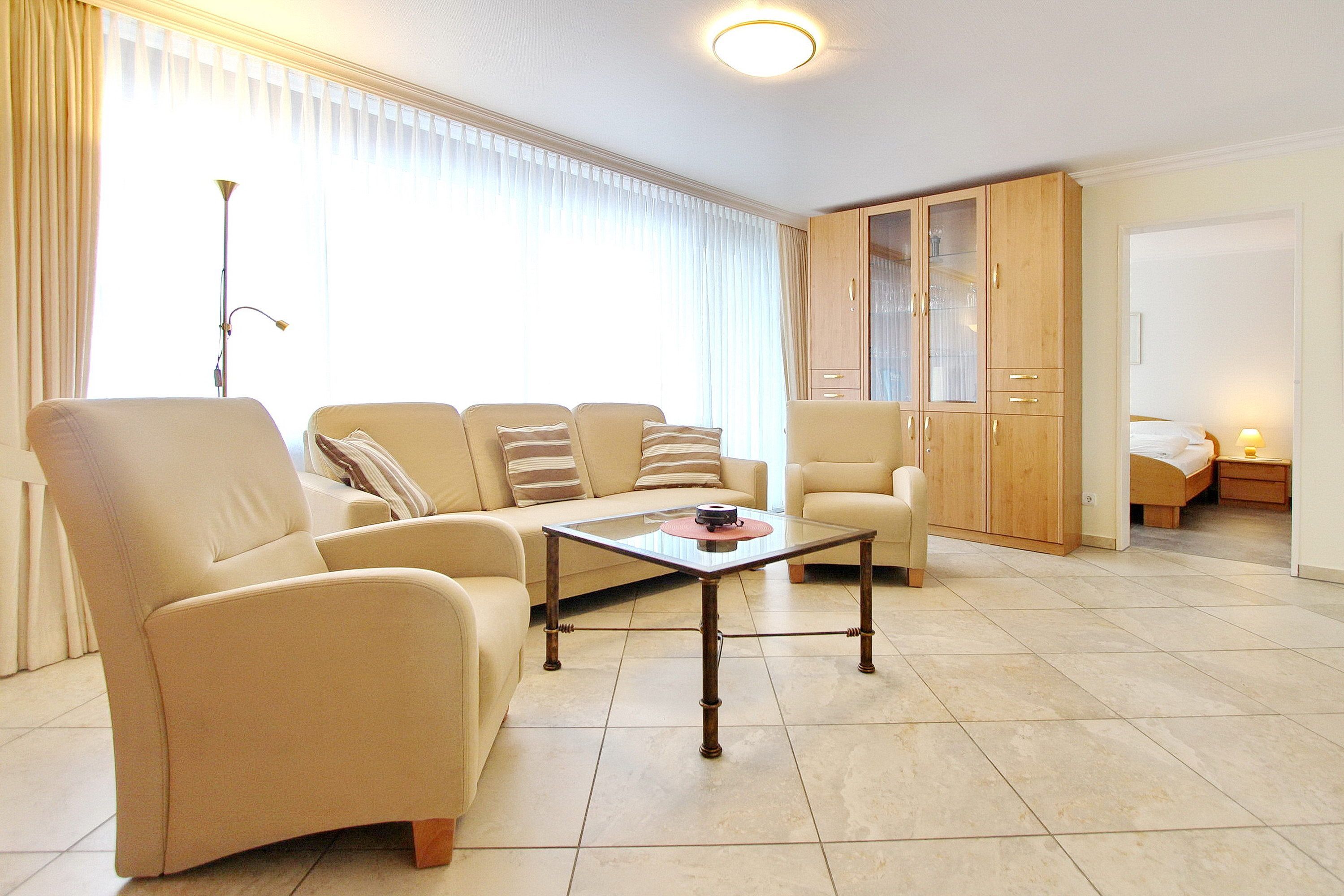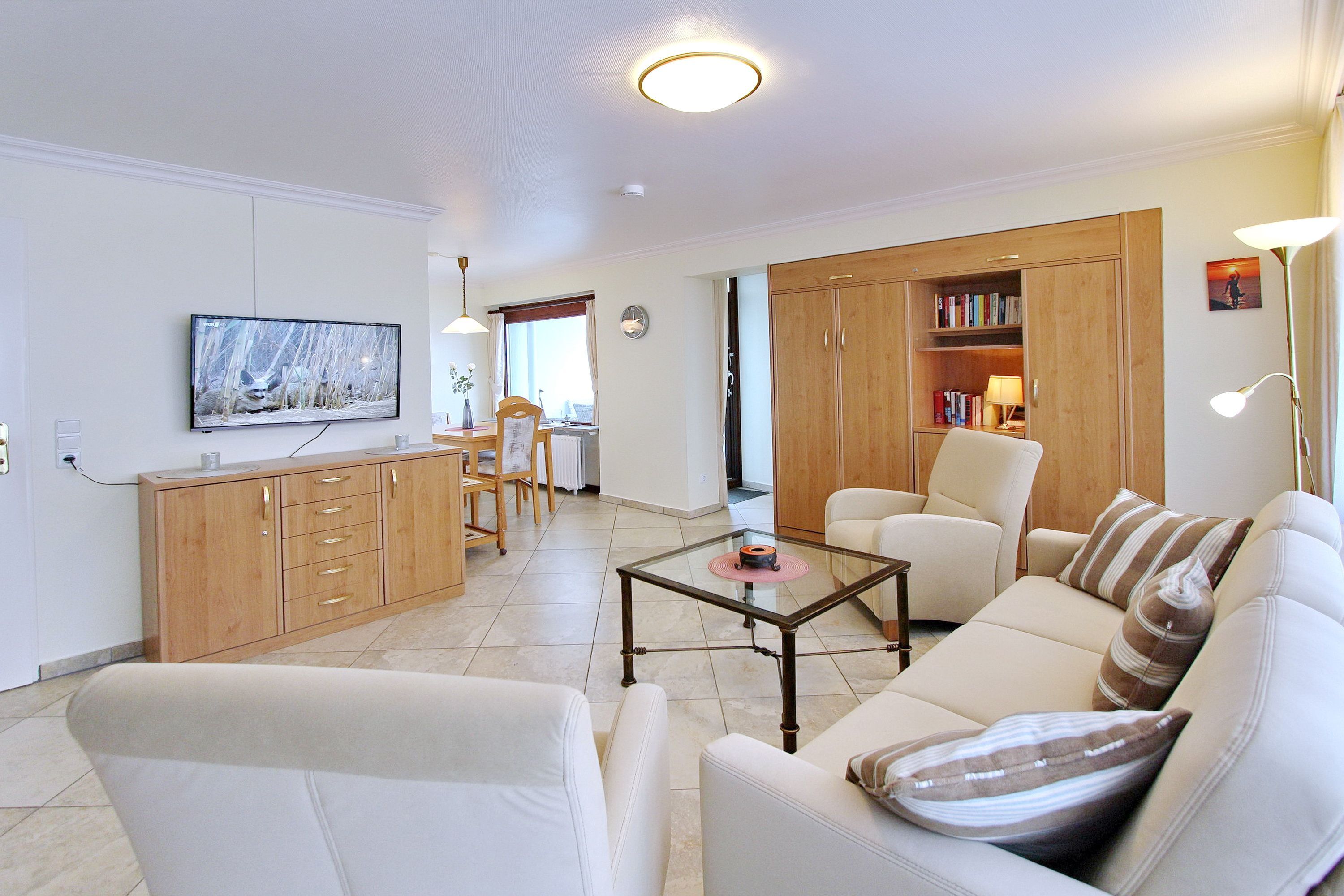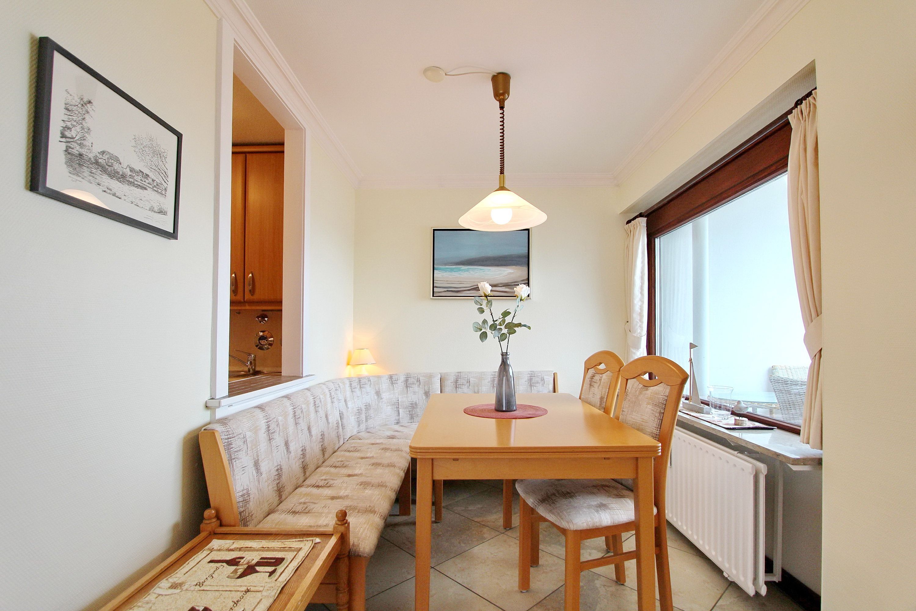 Hell und freundlich eingerichtete 2 Zimmer Wohnung in der 6. Etage im Haus Metropol mit Balkon zur Ost-und Nordseite mit Balkonmöbeln. Der Wohnraum verfügt über eine bequeme Couch, 2 Fernsehsessel, ein Einzelschrankbett und einen Essplatz mit Eckbank und 2 Stühlen. Vom Essbereich haben sie einen Zugang zum Nordbalkon mit seitlichem Blick auf die Nordsee. Der Wohn-Essbereich ist gefliest. Die separate Küche mit Cerankochfeld, zusätzlicher Tassimomaschine und Backofen mit Mikrowelle hat eine große Durchreiche zum Essplatz. Im Schlafzimmer mit Teppichboden steht ein Doppelbett und ein Kleiderschrank mit reichlich Stauraum. Dieses Zimmer hat ebenfalls einen eigenen Balkon zur Ostseite und einen Zugang zum Badezimmer. Das neu renovierte Badezimmer besticht durch seine Größe und die ebenerdige Dusche mit Sitzbank, die somit besonders für Gäste mit Handicap geeignet ist. Zur technischen Ausstattung gehört: ein Flachbildfernseher sowie ein freies WLAN Netzwerk (WEG Haus Metropol - Passwortfrei - ohne Gewähr) steht ihnen kostenfrei zur Verfügung. Diese Nichtraucherwohnung hat eine Größe von ca. 70 m².
