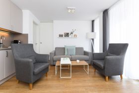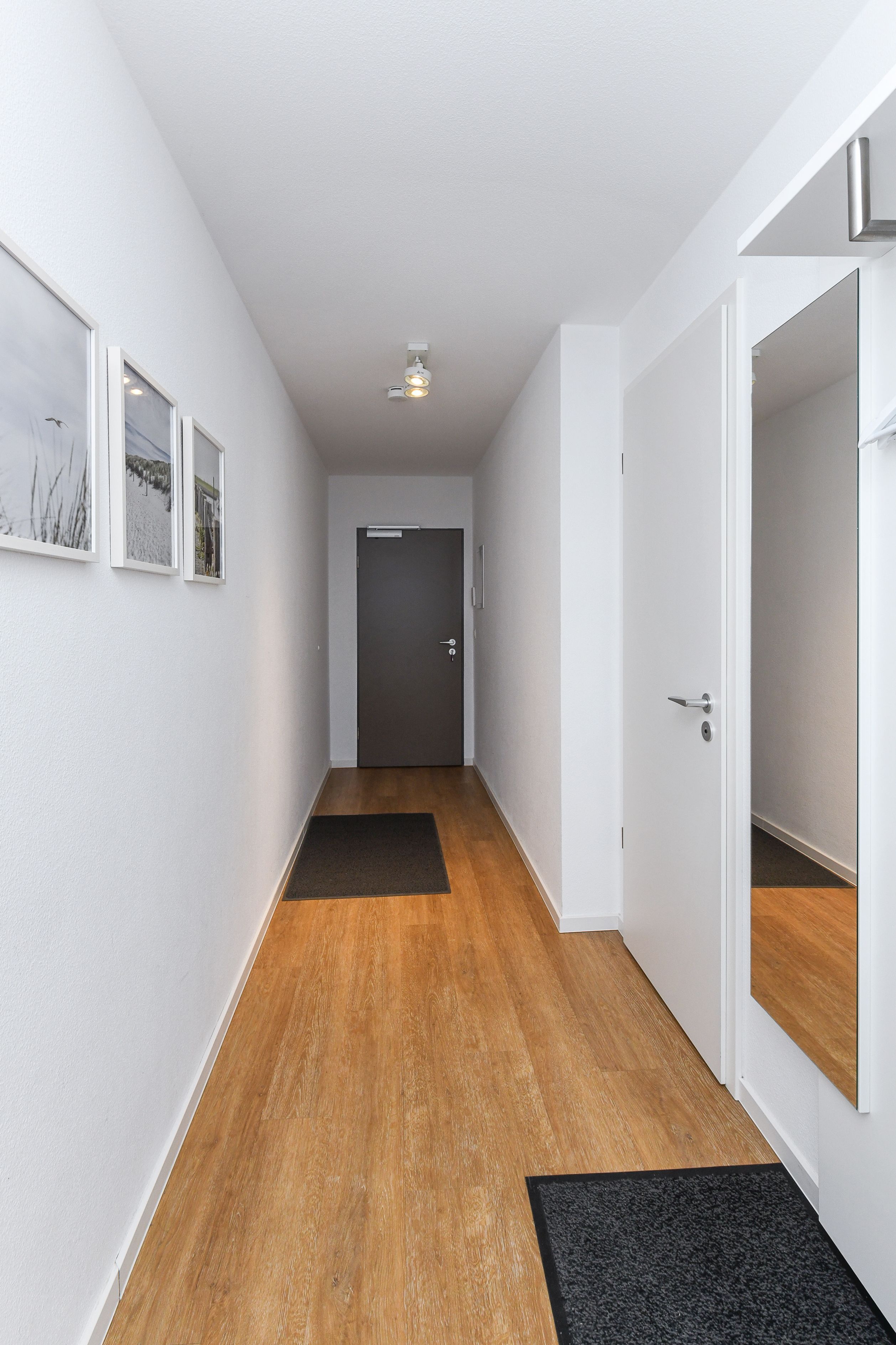 Die 55 m² große moderne 3-Zimmer Ferienwohnung ist für bis zu 4 Personen geeignet. Besonders hervorzuheben ist der großzügige und überdachte Balkon, ähnlich einer Loggia, in sonniger West-Lage. Hier lässt sich bis zum Abend das wohltuende Meeresklima und die Sonne genießen.