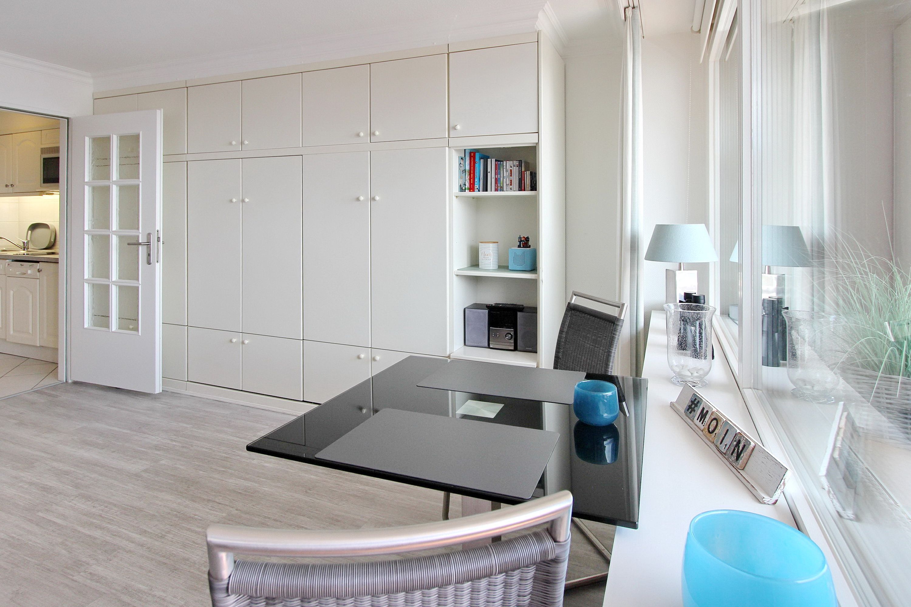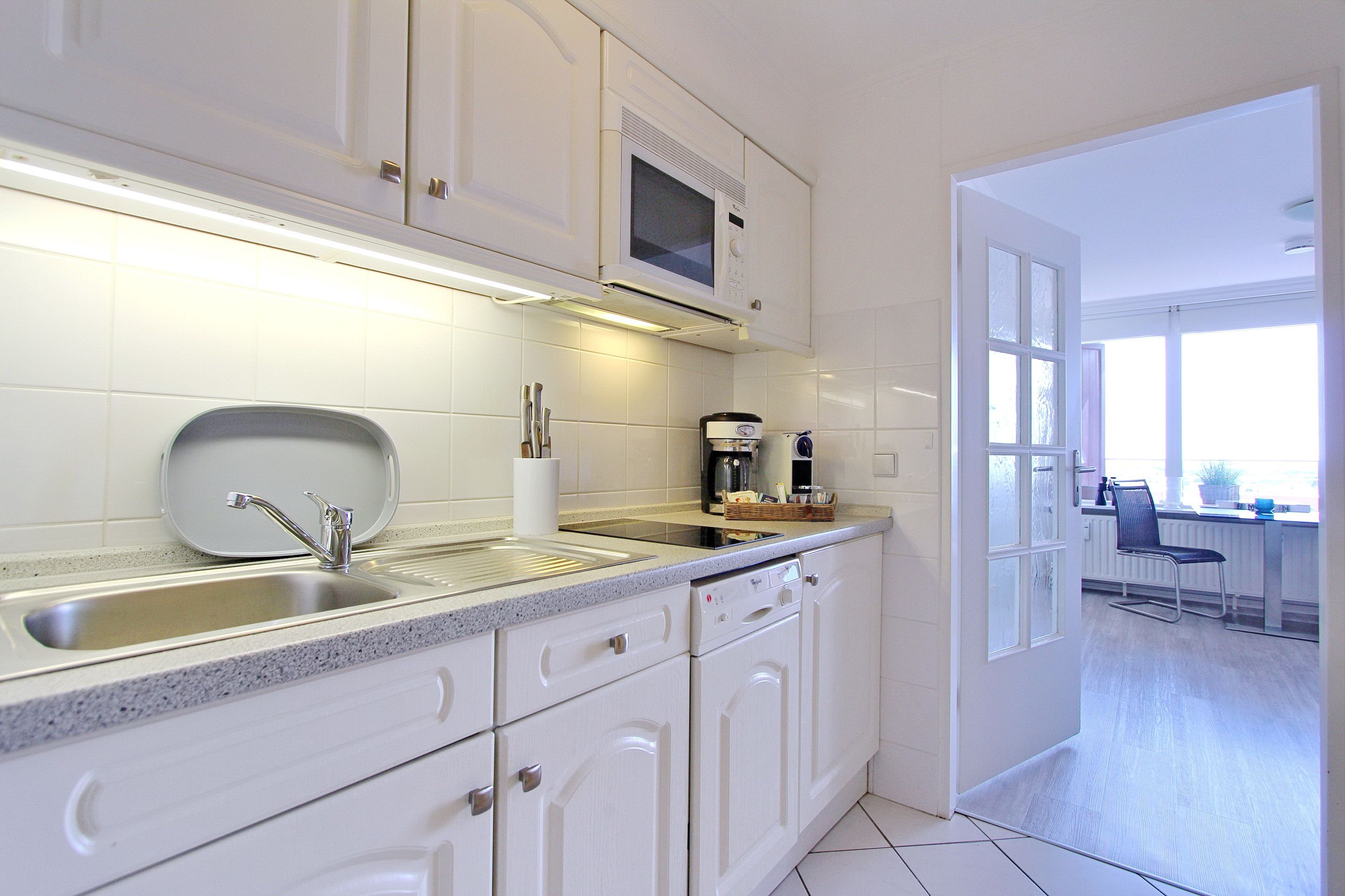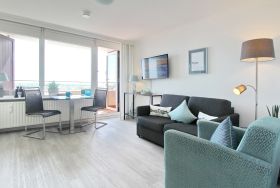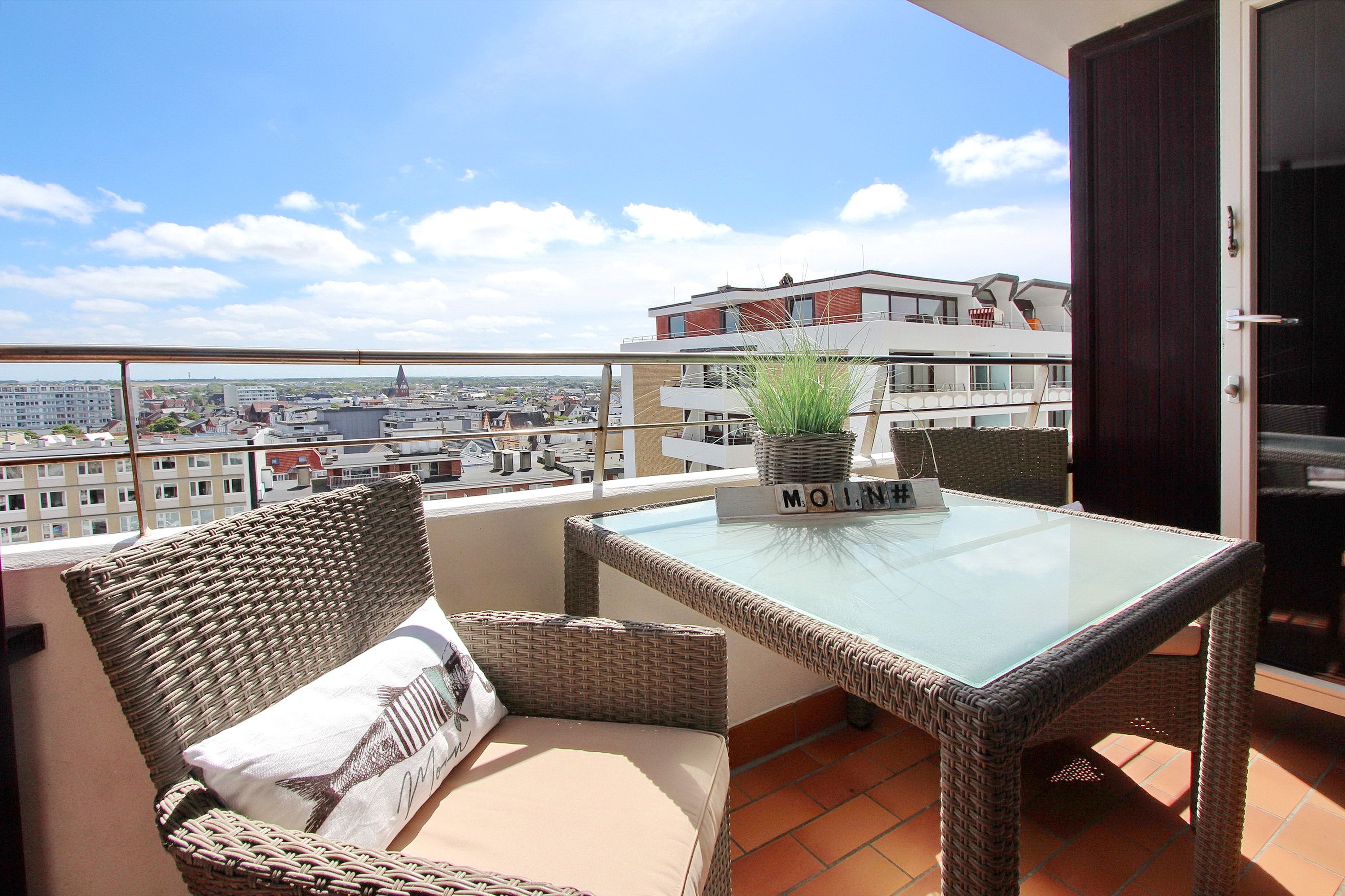 Diese, mit viel Liebe zum Detail eingerichtete, Wohnung befindet sich in der 7. Etage des Haus Metropol und hat einen Ostbalkon mit herrlicher Sicht über die Insel und die Stadt. Bei klarem Wetter können sie sogar das nordfriesische Wattenmeer sehen und auf bequemen Balkonmöbeln (2 Stühlen und ein Tisch) den Blick über die Insel genießen. Der Wohn-/Schlafraum mit Designfussboden in Holzoptik hat Einzelschrankbetten, einen Essplatz am Fenster mit 2 Stühlen sowie eine Couch und einen Sessel. Ausreichend Stauraum für Ihre persönlichen Sachen ist vorhanden und für Ihre Wertsachen gibt es einen kleinen Safe. Das Badezimmer hat eine Eckdusche, ein großes Waschbecken, einen Schminkspiegel, Duschhocker, mobilen Haltegriff, einen Handtuchtrockner und Fön. Um sich selbst zu verpflegen gibt es im Flur eine Einbauküche mit Geschirrspüler, ein 2 Platten Cerankochfeld, eine Mikrowellen/Backkombination sowie eine zusätzliche Nespresso Kaffeemaschine. Zur technischen Ausstattung gehört: ein 40 Zoll Smart TV von Panasonic, eine Microanlage von Sony mit CD Player, ein Radio mit Bluetoothlautsprecher, ein Blue Ray Player und ein Telefon mit Flatrate ins dt. Festnetz. Für die kleinen Sylturlauber steht eine Spielzeugkiste und eine Toniebox zur Verfügung. Der Eigentümer verfügt über einen eigenen Internetanschluss (Zugangsdaten in der Wohnung) den Sie kostenfrei nutzen können. Arbeiten, streamen ... alles kein Problem in dieser ca. 30 m² großen Nichtraucherwohnung.